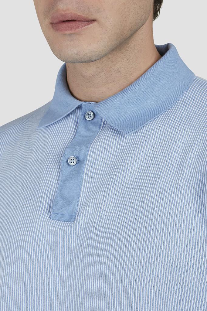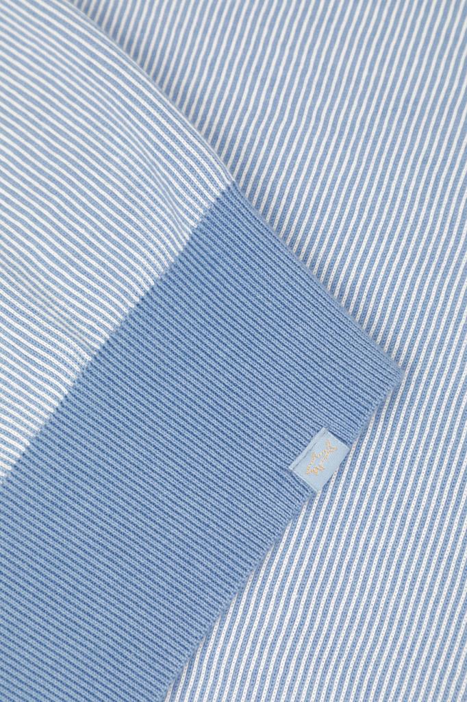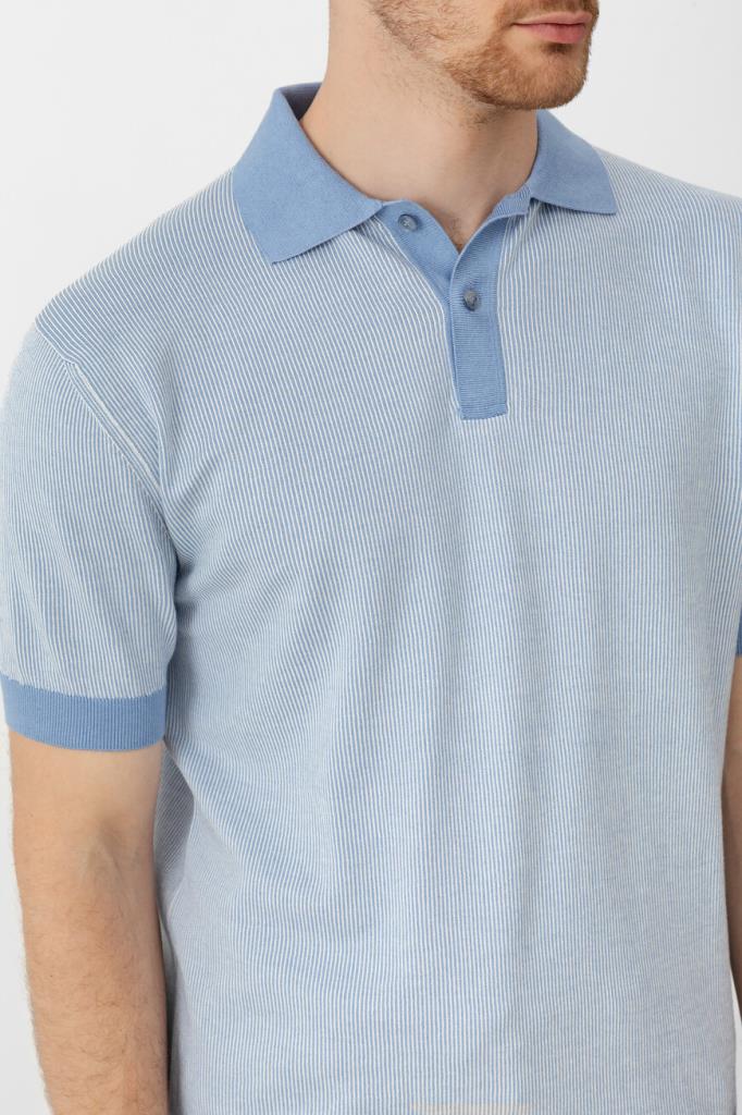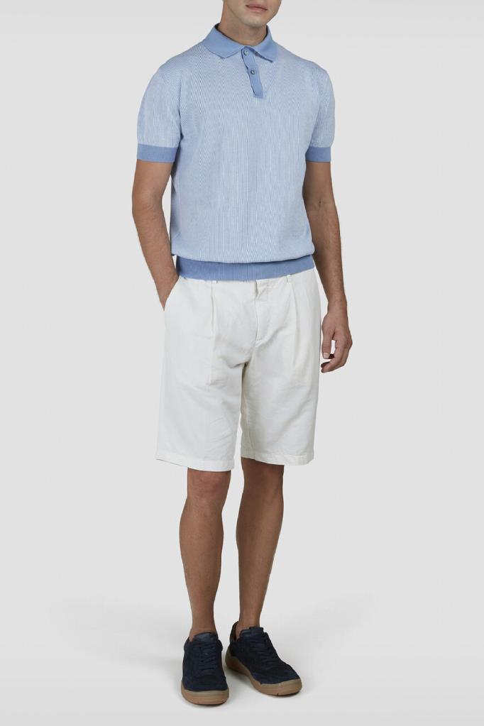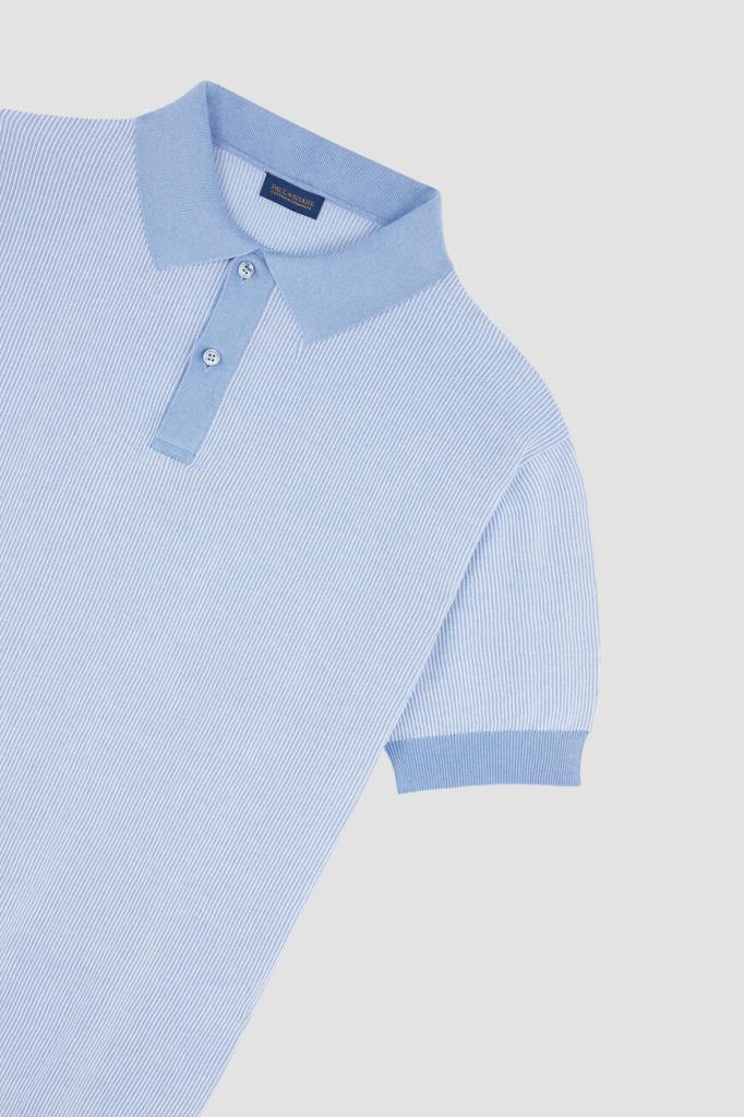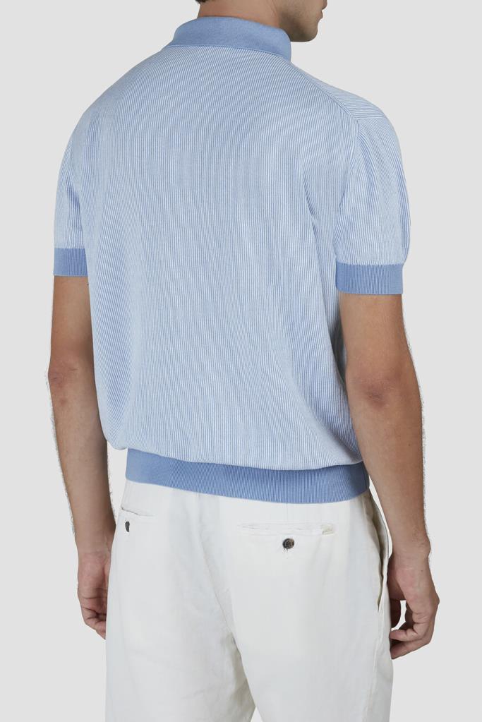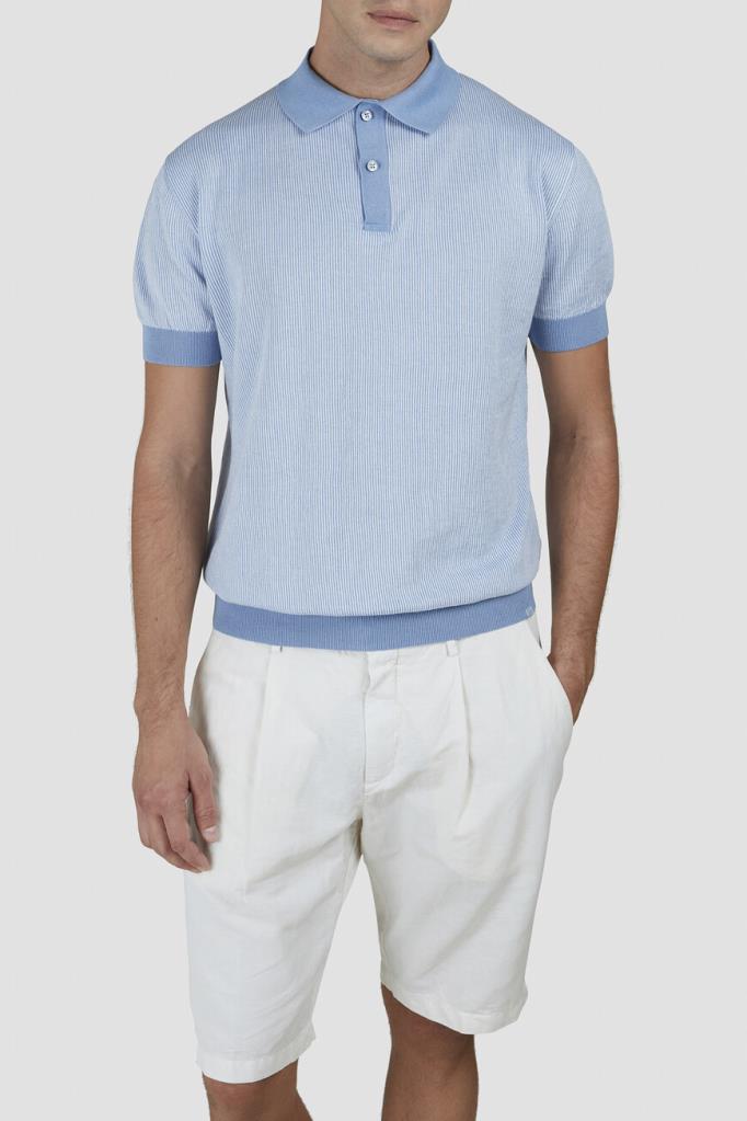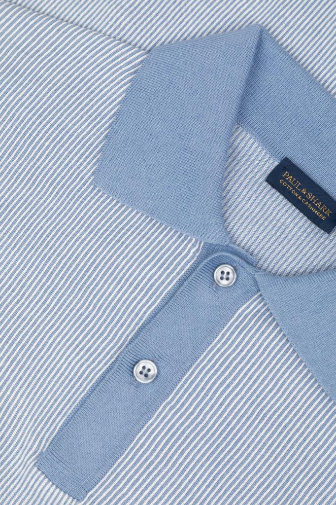 Трикотажное поло Paul&Shark с короткими рукавами. Для создания изделия прямого силуэта используются хлопок и кашемир в бело-голубой гамме. Поверхность повседневной модели украшена геометрическим узором в виде тонких вертикальных полос, выполненным в технике интарсия. Отличительными особенностями поло являются однотонные отложной воротник, планка застёжки, манжеты рукавов и широкий пояс с отделкой в резинку.