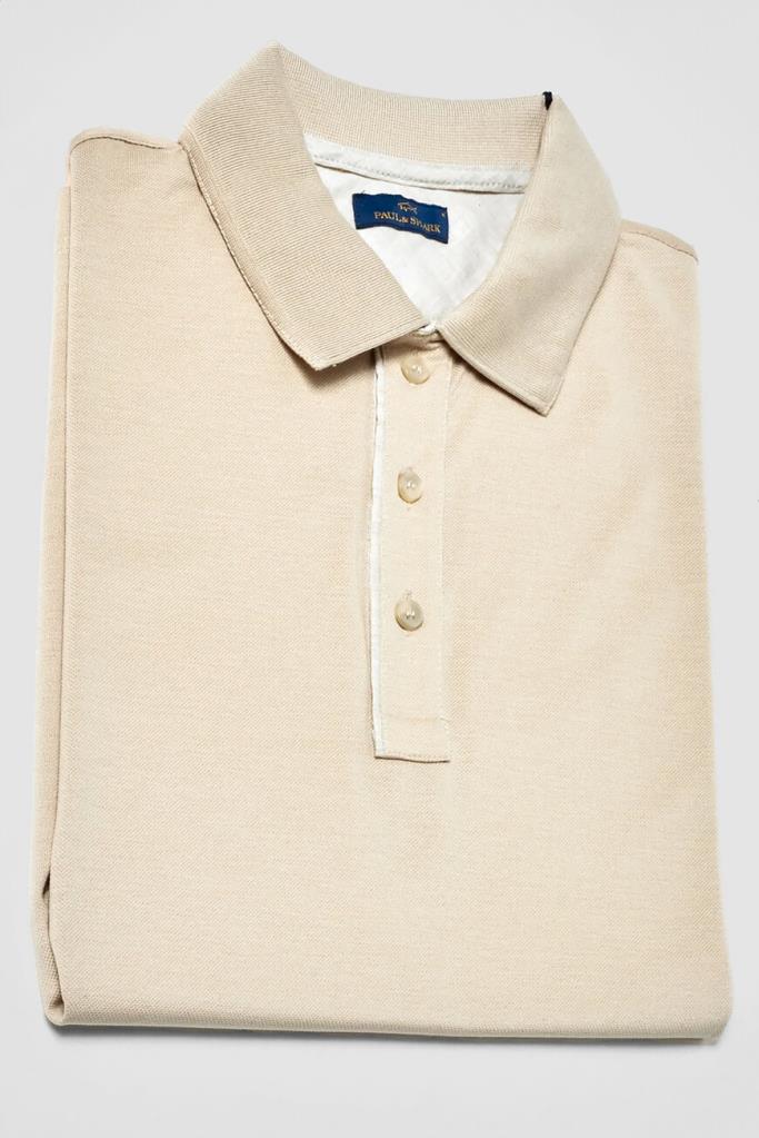 Хлопковое поло прямого силуэта от бренда Paul&Shark. Изделие выполнено в бежевом оттенке из тонкого трикотажа-пике с характерной сетчатой текстурой. Модель застёгивается на три перламутровые пуговицы сверху и отличается наличием льняных вставок на изнаночной стороне под воротником и во внутренней части очерченной планки застёжки. Лёгкое дышащее поло станет превосходным дополнением летнего casual-гардероба.