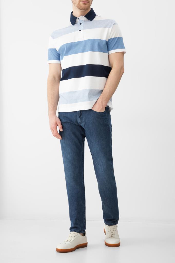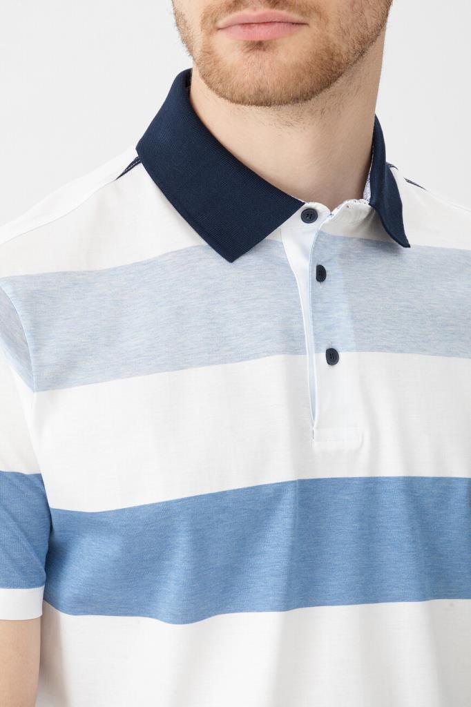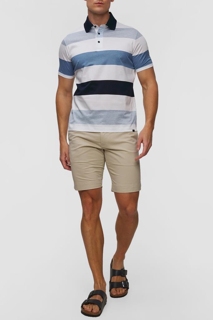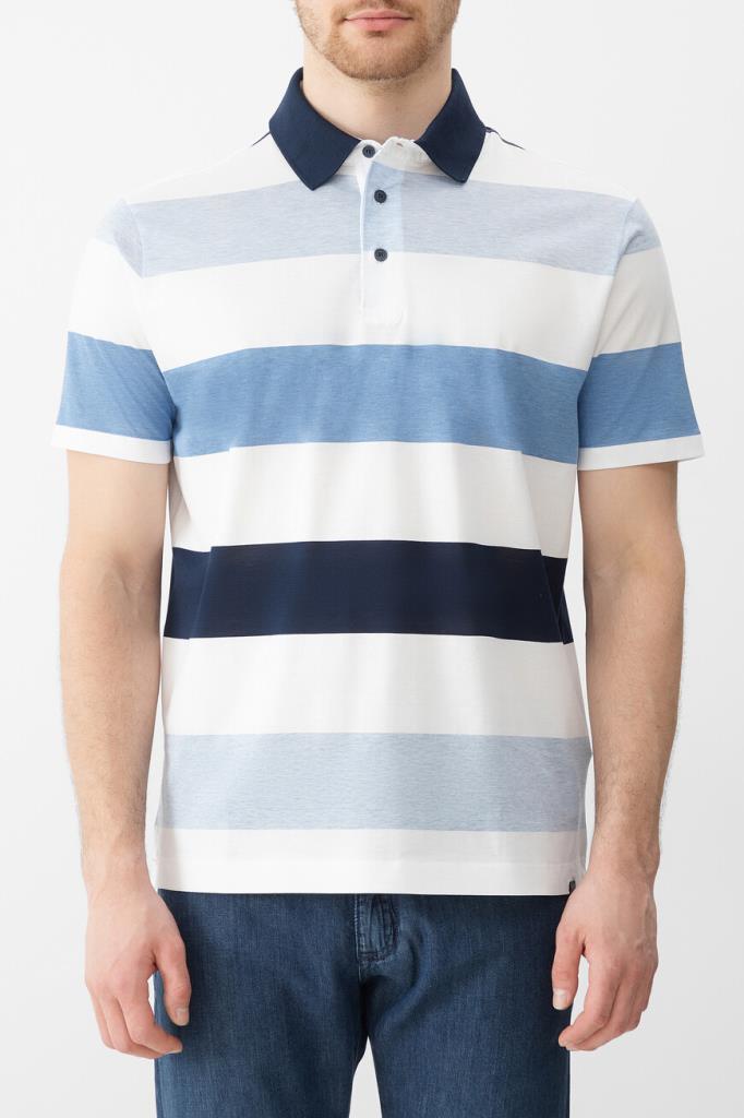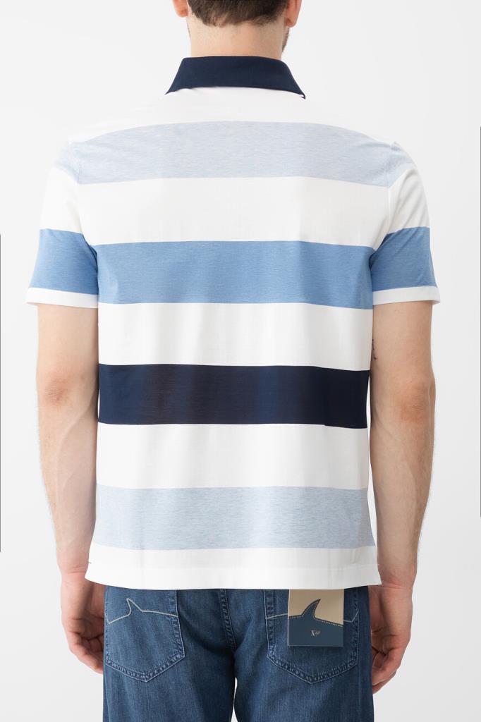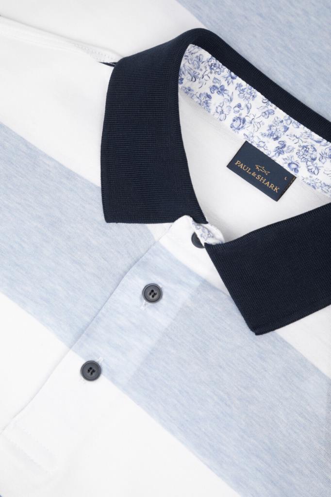 Лёгкое поло Paul&Shark с миниатюрной брендированной вставкой спереди. Для изготовления изделия в морском стиле используется органический мерсеризованный хлопок высокого качества. Роль акцентного декора передана геометрическому мотиву в виде широких горизонтальных полос в бело-сине-голубой гамме. Дополнительный комфорт и удобство в носке обеспечивают неглубокие боковые разрезы. Модель сочетается с чиносами и бермудами из той же коллекции.