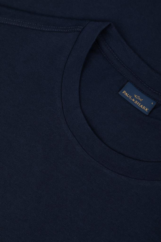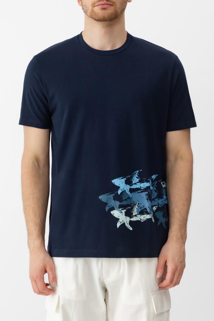 Хлопковая футболка прямого кроя от бренда Paul&Shark. Фасон повседневной модели из чистого джерси характеризуется наличием круглого выреза горловины на резинке и традиционных коротких рукавов. Спереди размещён крупный потёртый принт Sharks в виде стаи акул в сине-голубой гамме, словно нарисованный масляной краской от руки.