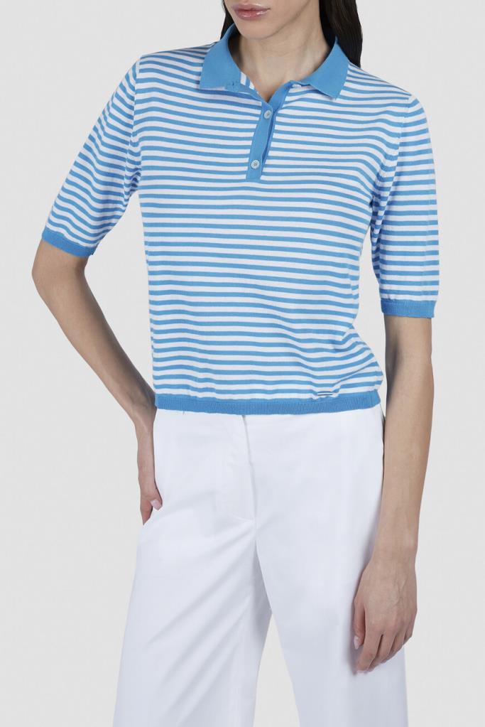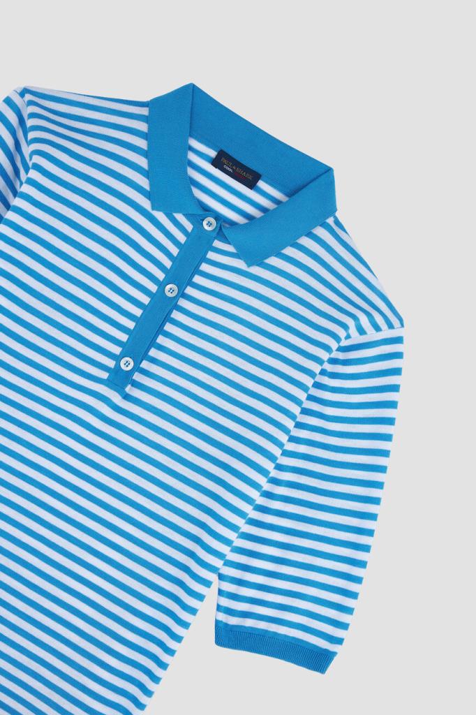 Женственное поло Paul&Shark на трёх перламутровых пуговицах. Для производства переосмысленной классики парусного спорта выбран ультрамягкий, но прочный хлопок FRESCO. Изделие декорировано геометрическим мотивом в виде горизонтальных полос белого и тёмно-синего оттенков и дополнено прямоугольным лейблом из серебристого металла с логотипом спереди снизу.