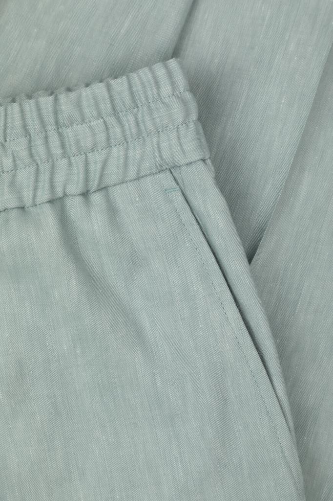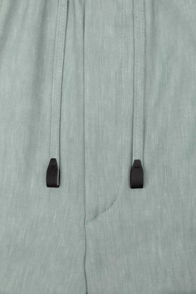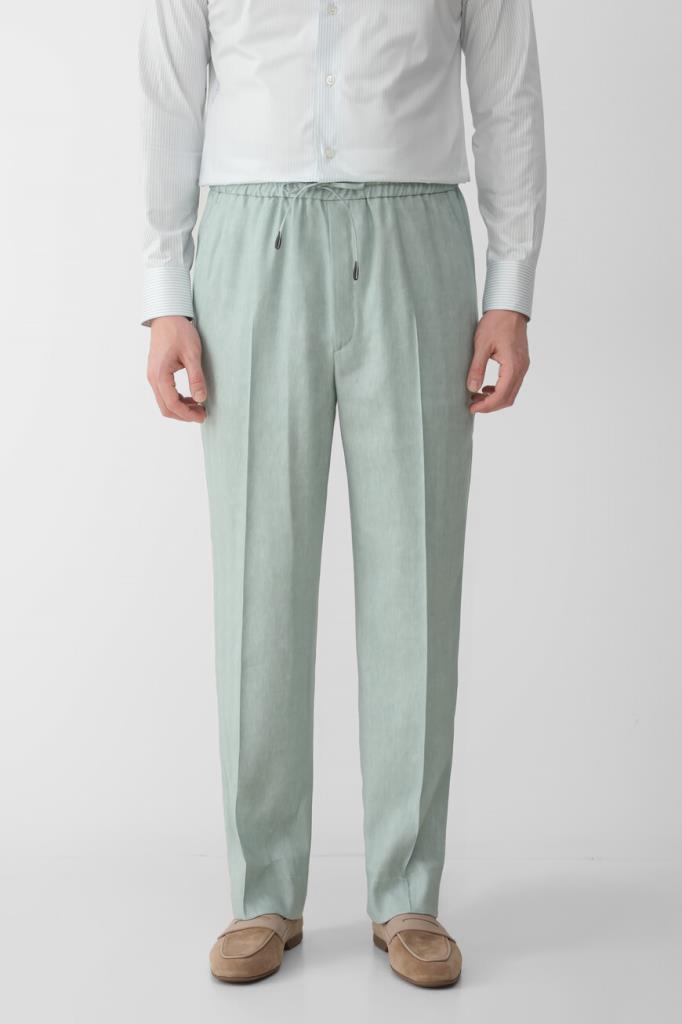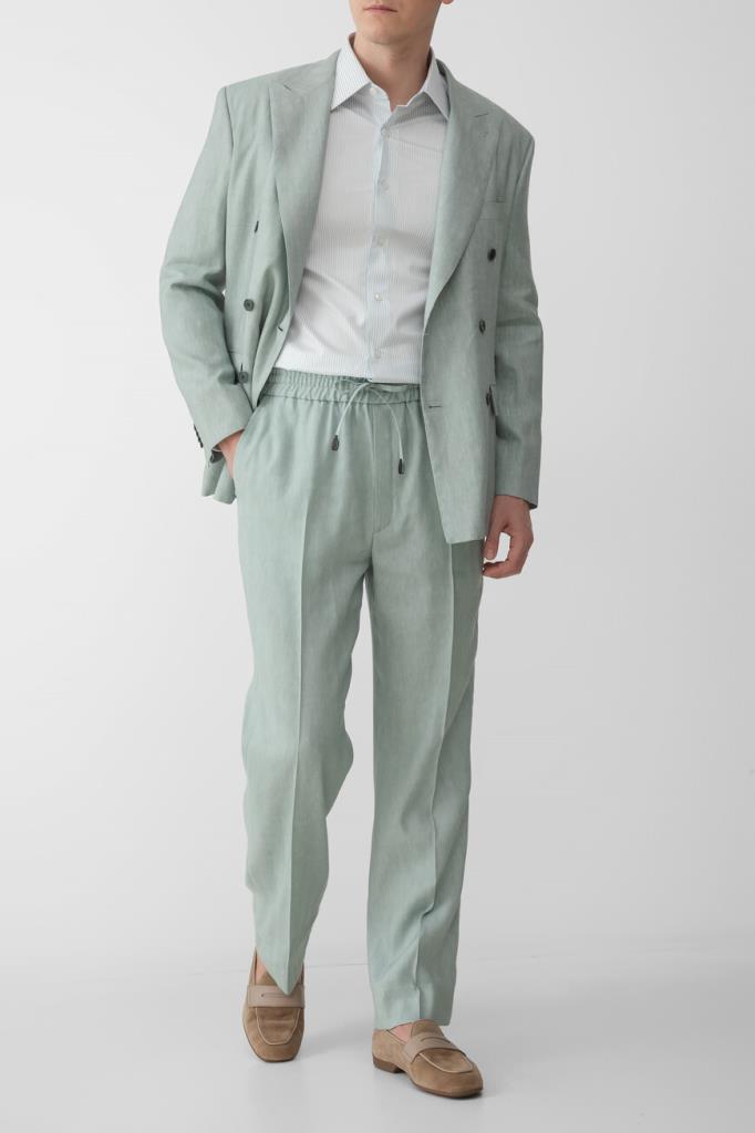 Брюки с элементами классического и спортивного стилей от Brioni. Фасон изделия немного зауженного книзу силуэта, выполненного из натуральной шерсти, гладкого шёлка и льна мятного оттенка, характеризуется наличием стрелок и широкого эластичного пояса-кулиски для оптимальной посадки по фигуре. Атрибутами Дома являются тиснёные литеры «B» на чёрных кожаных кончиках завязок. Носите модель в комплекте с полосатой рубашкой и прилегающим пиджаком на крупных роговых пуговицах из той же коллекции.