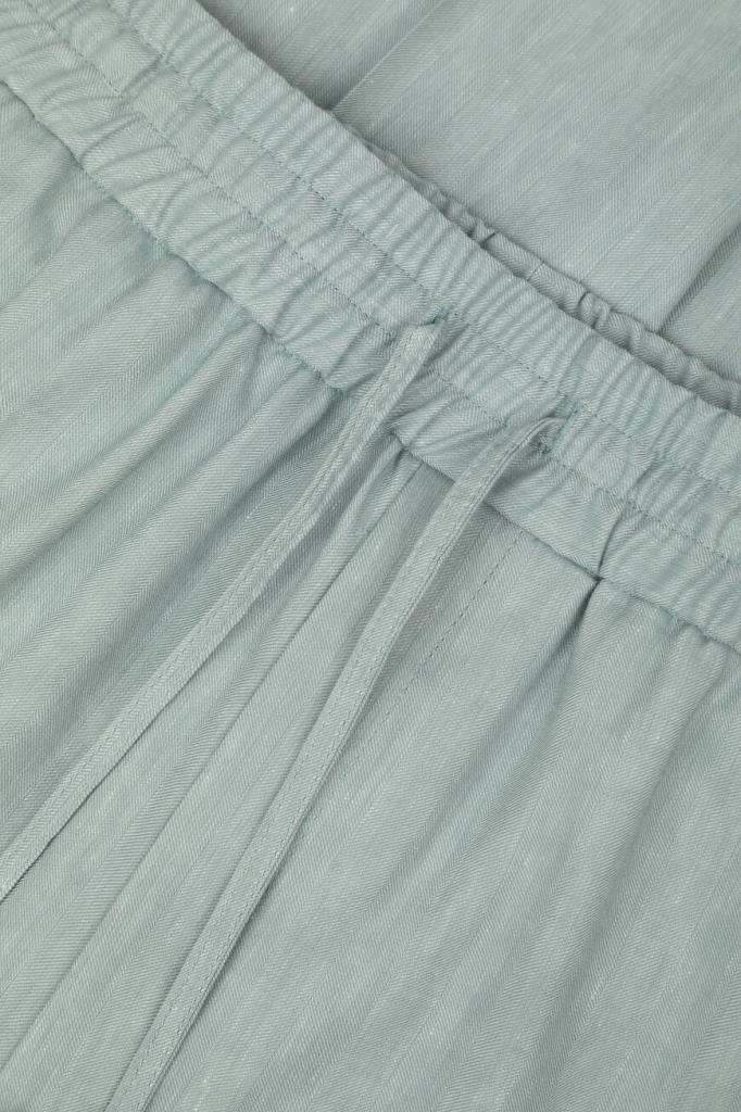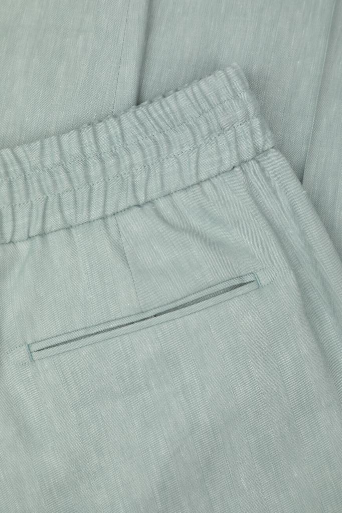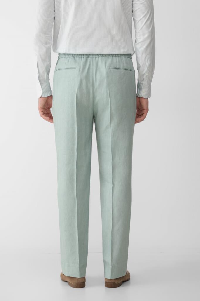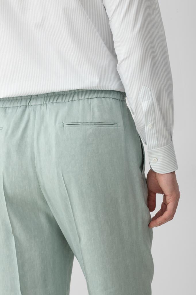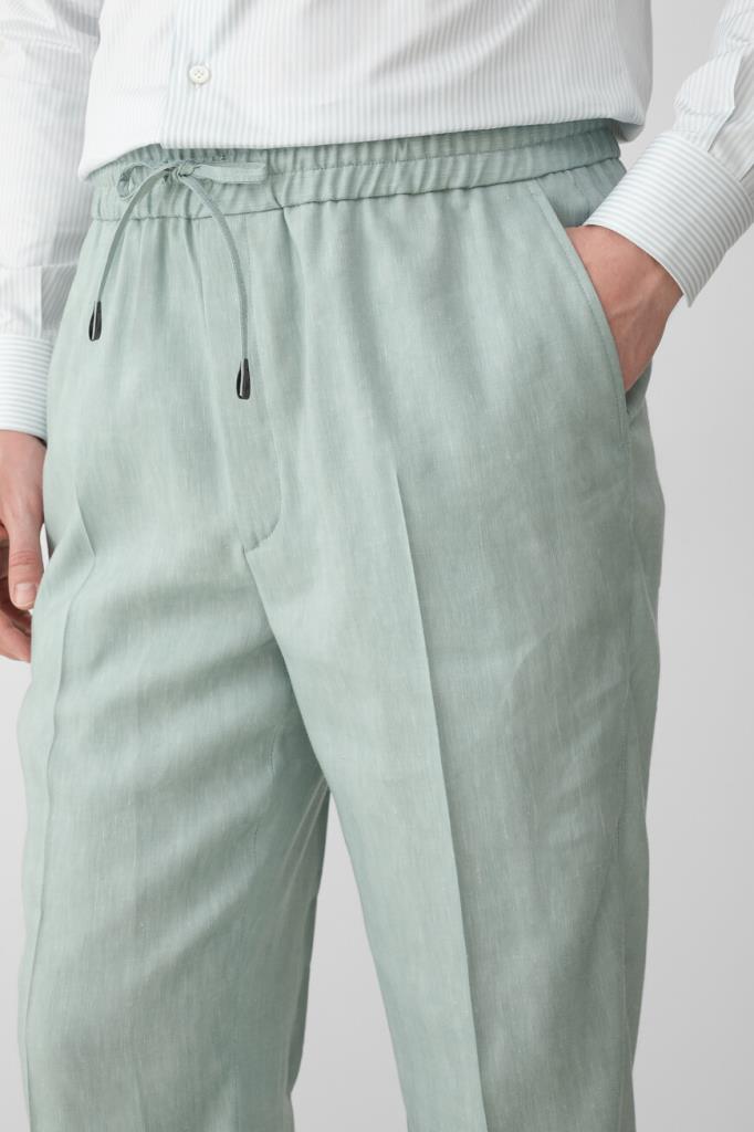 Брюки с элементами классического и спортивного стилей от Brioni. Фасон изделия немного зауженного книзу силуэта, выполненного из натуральной шерсти, гладкого шёлка и льна мятного оттенка, характеризуется наличием стрелок и широкого эластичного пояса-кулиски для оптимальной посадки по фигуре. Атрибутами Дома являются тиснёные литеры «B» на чёрных кожаных кончиках завязок. Носите модель в комплекте с полосатой рубашкой и прилегающим пиджаком на крупных роговых пуговицах из той же коллекции.