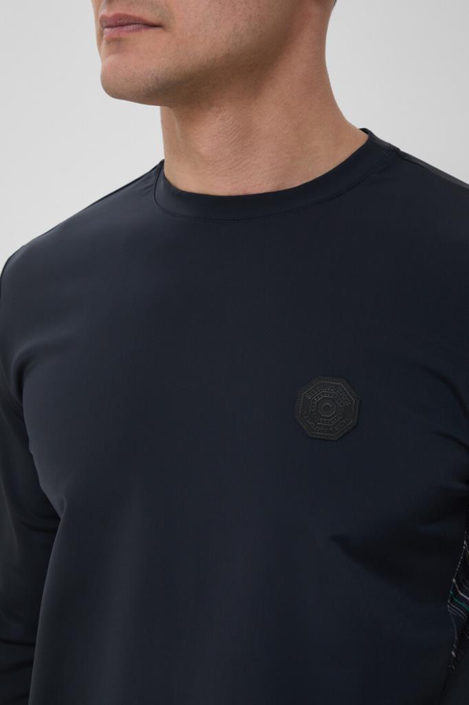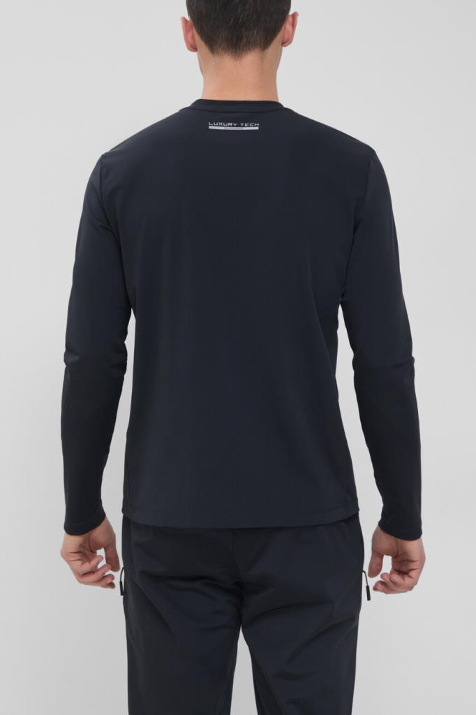 Спортивный лонгслив чёрного цвета от Stefano Ricci. Для пошива изделия прямого силуэта выбрана эксклюзивная техническая ткань на основе прочного нейлона с добавлением стрейчевых волокон. Принадлежность модели с круглым вырезом горловины Дому деликатно обозначена кожаной накладкой со знаковой символикой Дома - серебристыми логотипом, восьмигранниками и надписью-названием коллекции SR LUXURY TECH слева на груди. Дополните образ брюками для бега из той же линейки.