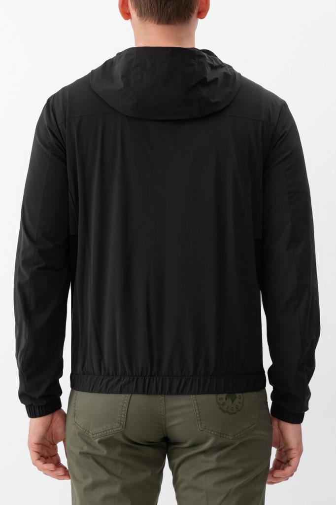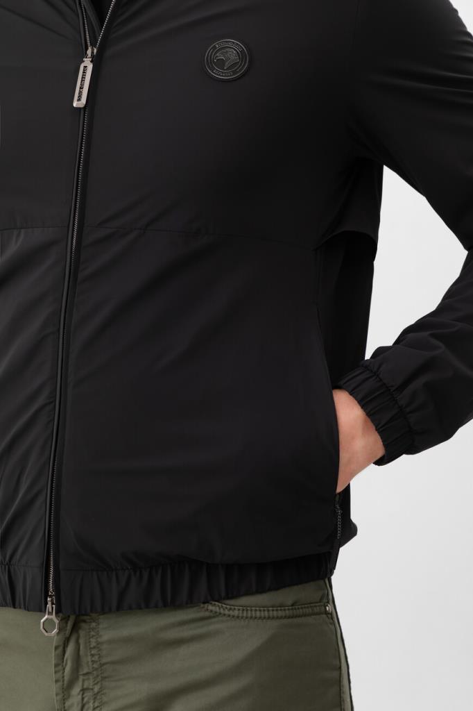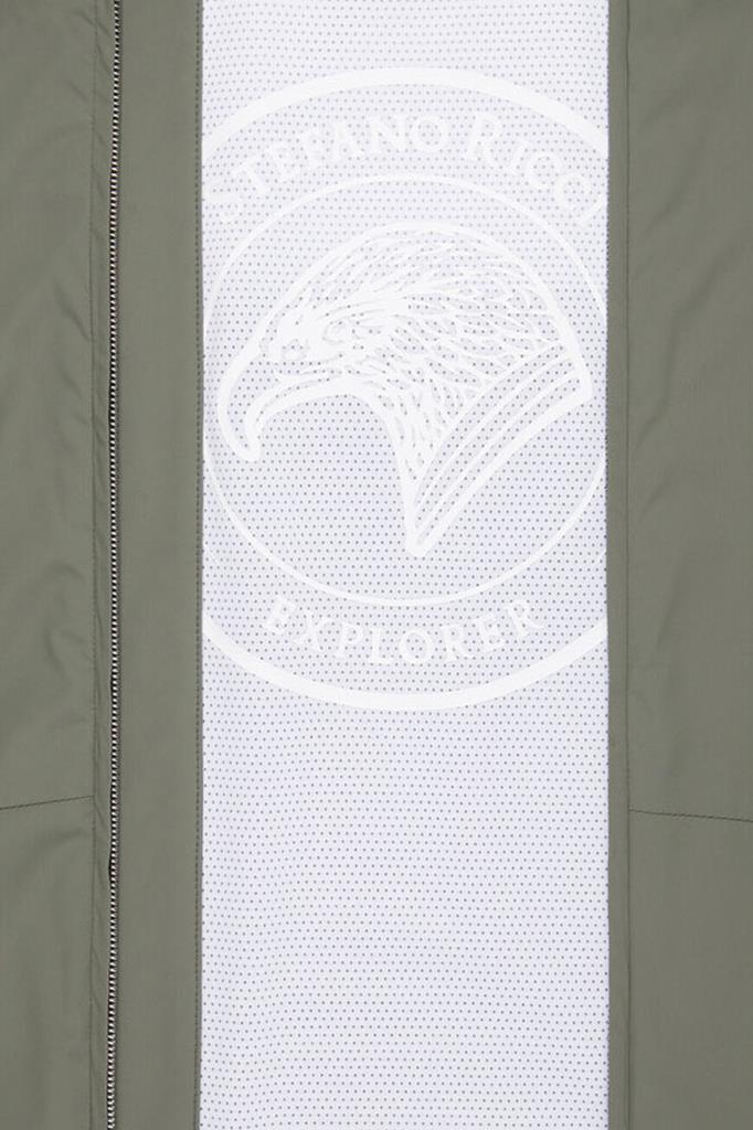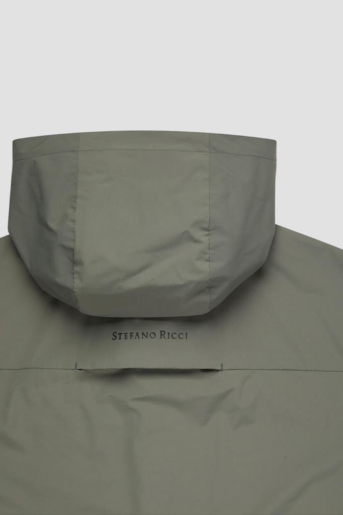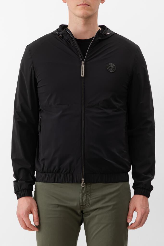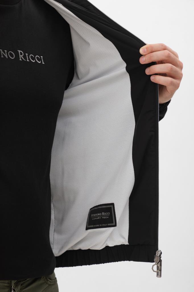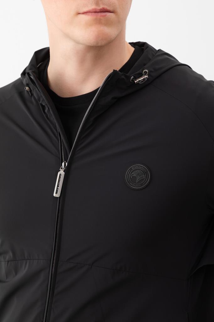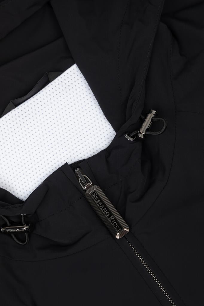 Прямая куртка Stefano Ricci, созданная по проекту Explorer. Фасон повседневной модели, выполненной из прочного эластичного нейлона чёрного цвета, характеризуется наличием глубокого капюшона на кулисках и двумя прорезными карманами на молнии по бокам. Атрибутами Дома являются круглый патч с логотипом и головой орла в центре слева на груди и крупная символика на перфорированной подкладке из полиэстера контрастного оттенка с добавлением стрейчевых волокон.