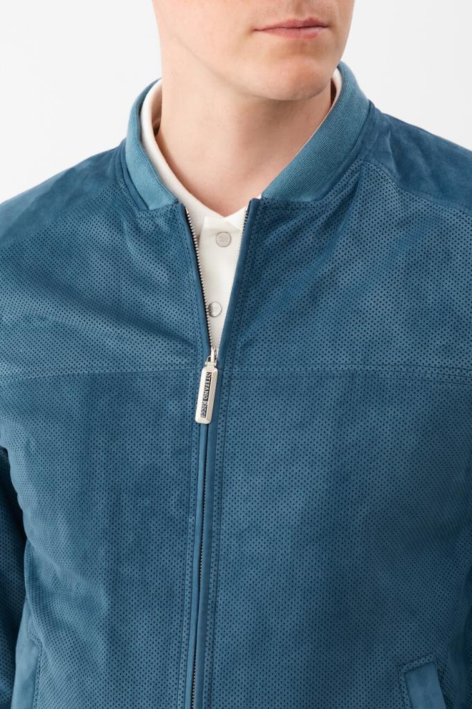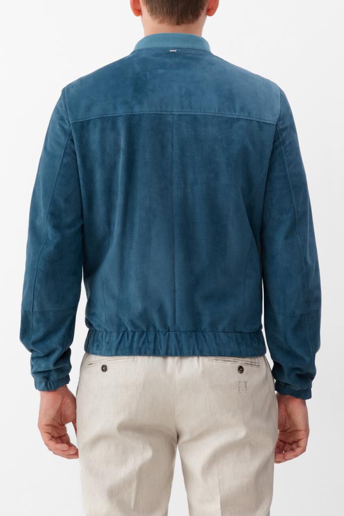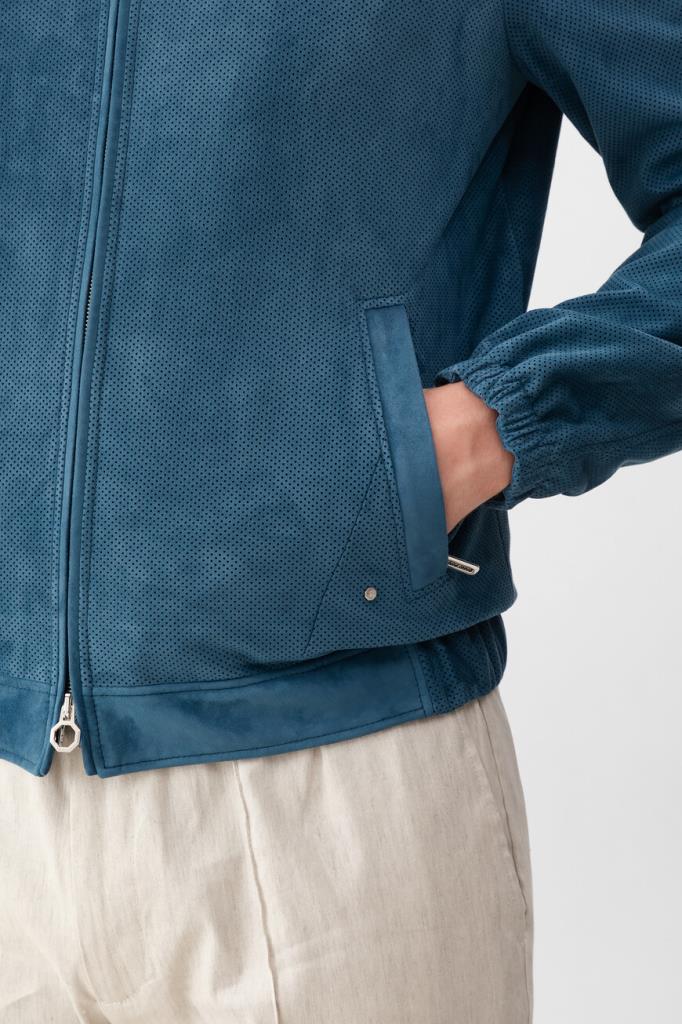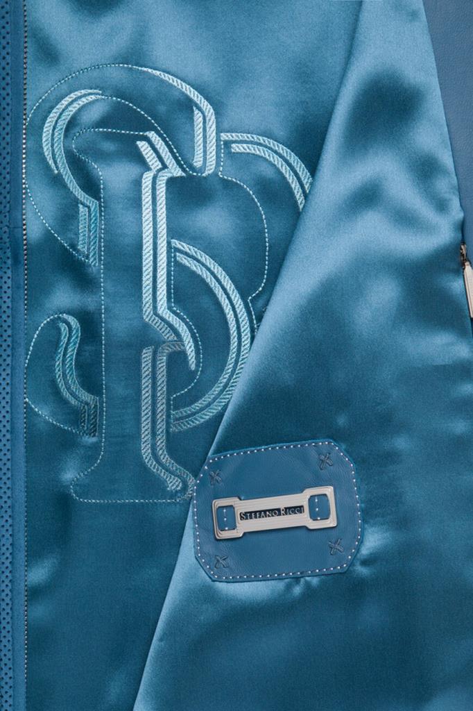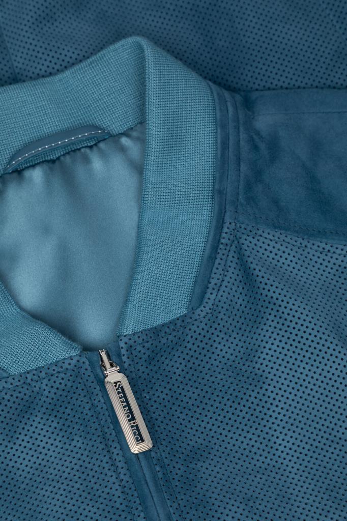 Куртка-блузон Stefano Ricci из тончайшей синей замши. Изделие с бархатистой текстурой представляет собой современную интерпретацию классического фасона. Актуальная модель на встречной молнии с двумя брендированными пуллерами дополнена перфорированными панелями, обеспечивающими воздухопроницаемость, и украшена кожаной деталью с прямоугольным лейблом и логотипом Дома, размещённой на блестящей подкладке. Дизайн куртки завершает декоративная фурнитура из благородных металлов с гальваническим покрытием.