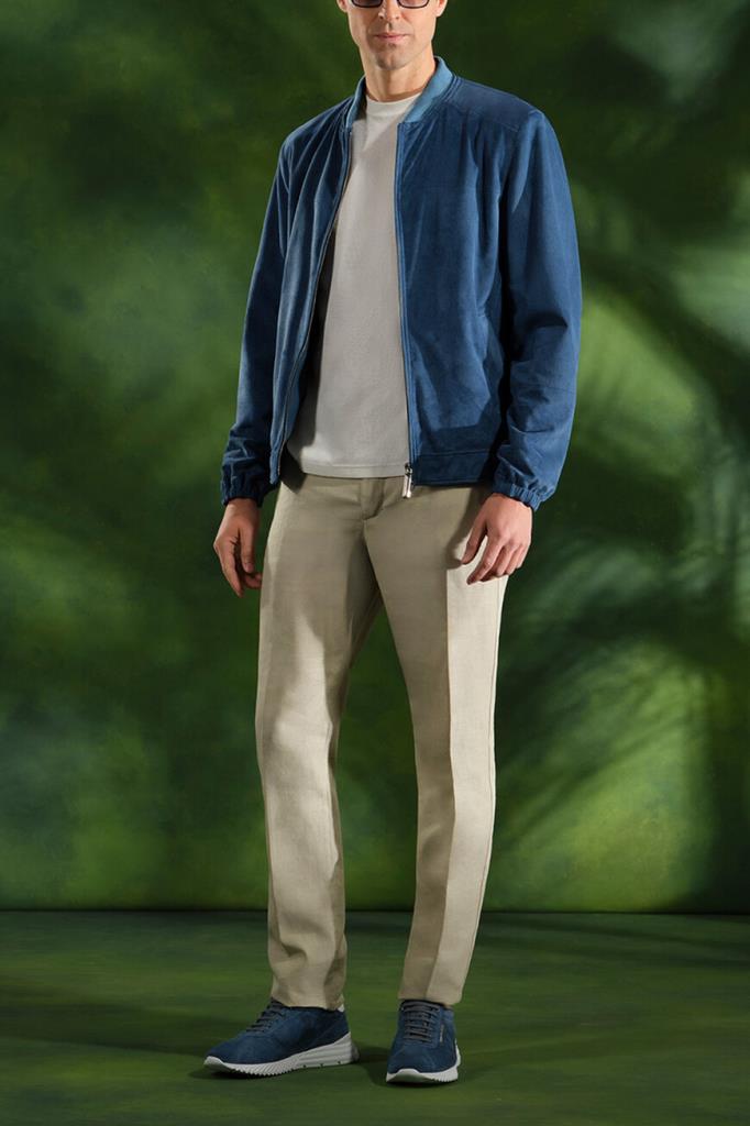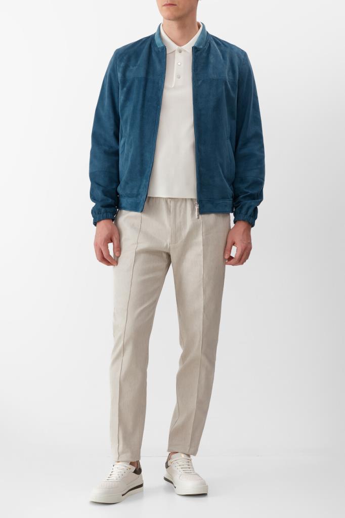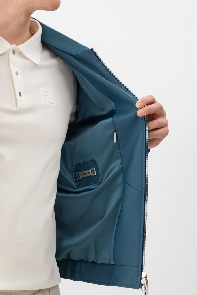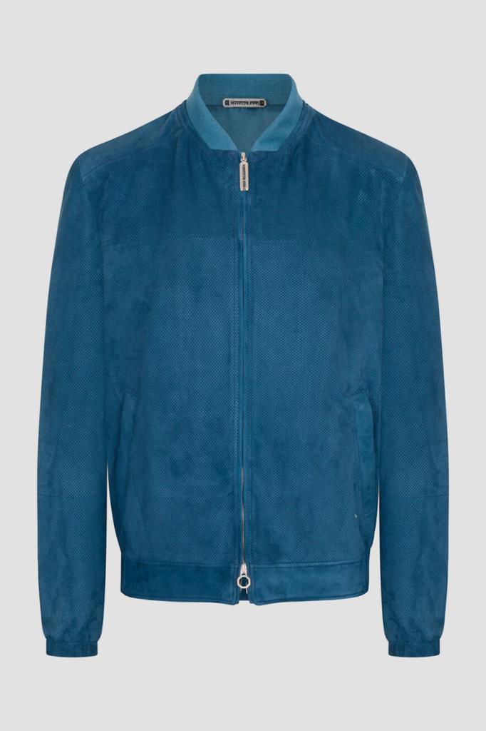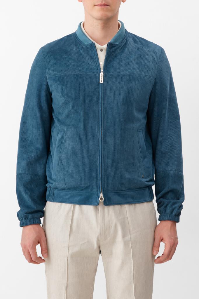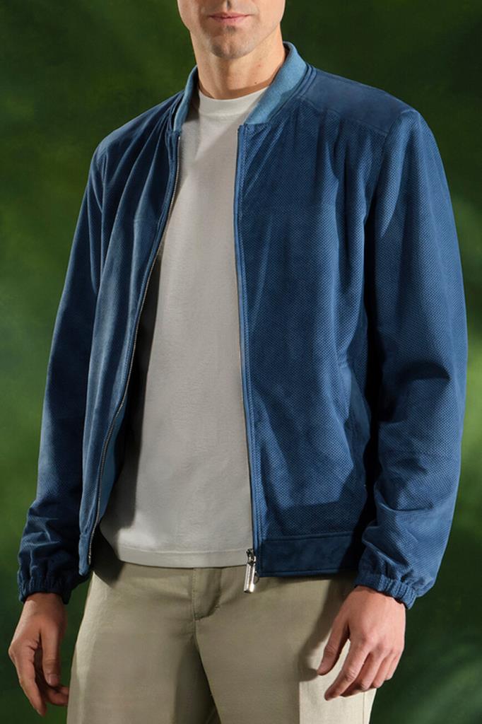 Куртка-блузон Stefano Ricci из тончайшей синей замши. Изделие с бархатистой текстурой представляет собой современную интерпретацию классического фасона. Актуальная модель на встречной молнии с двумя брендированными пуллерами дополнена перфорированными панелями, обеспечивающими воздухопроницаемость, и украшена кожаной деталью с прямоугольным лейблом и логотипом Дома, размещённой на блестящей подкладке. Дизайн куртки завершает декоративная фурнитура из благородных металлов с гальваническим покрытием.