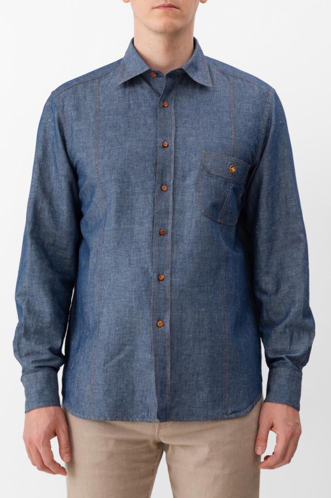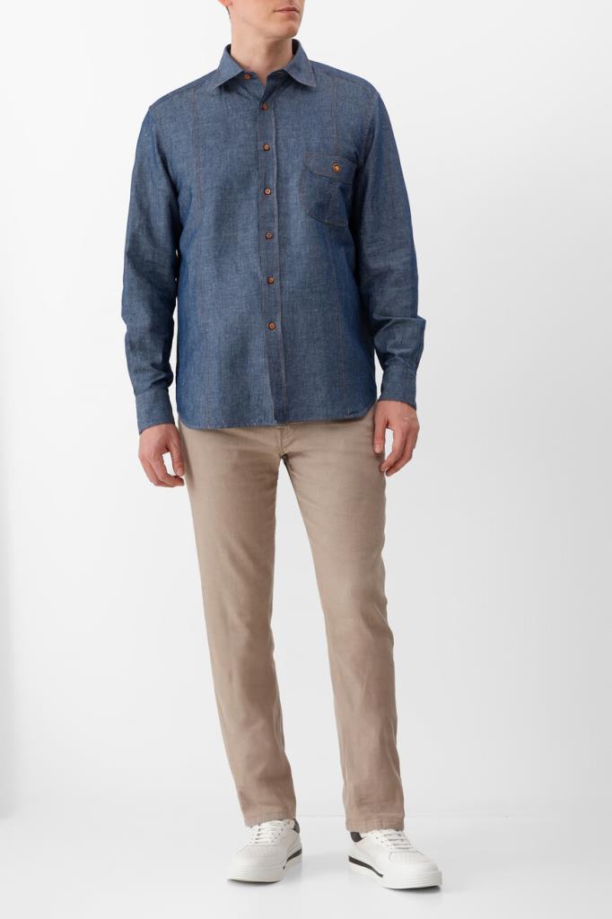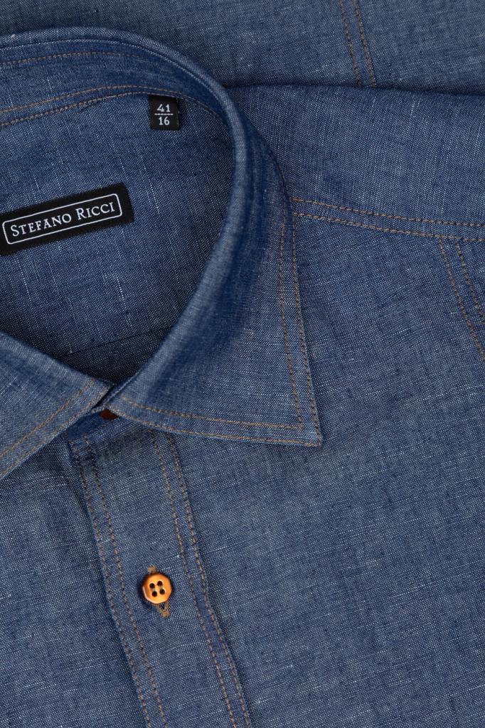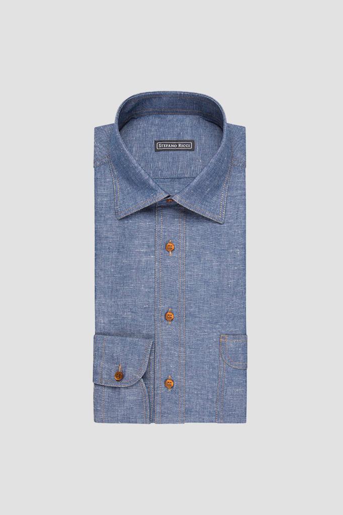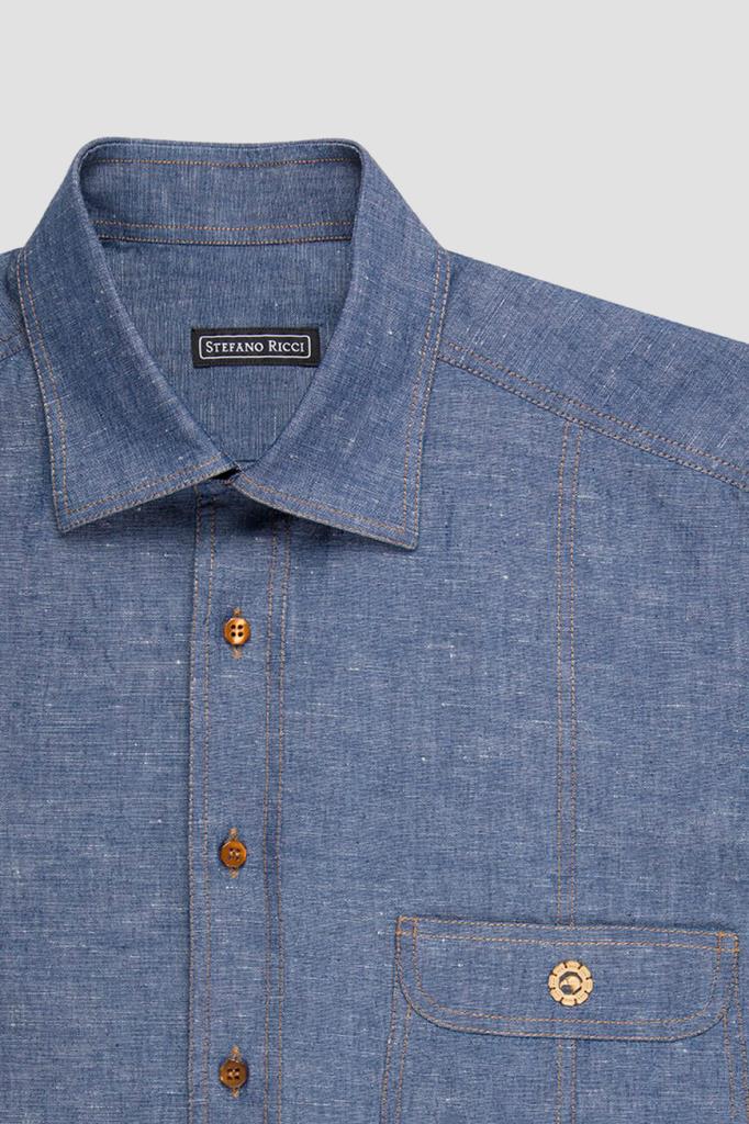 Рубашка Stefano Ricci с длинными рукавами. Для создания повседневной модели прямого силуэта используются мягкий хлопок и лён синего оттенка. Изделие интересно табачной прострочкой на швах и наличием неброского знакового декора - золотистой металлической детали с головой орла в центре на клапане нагрудного накладного кармана.