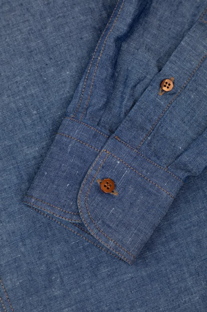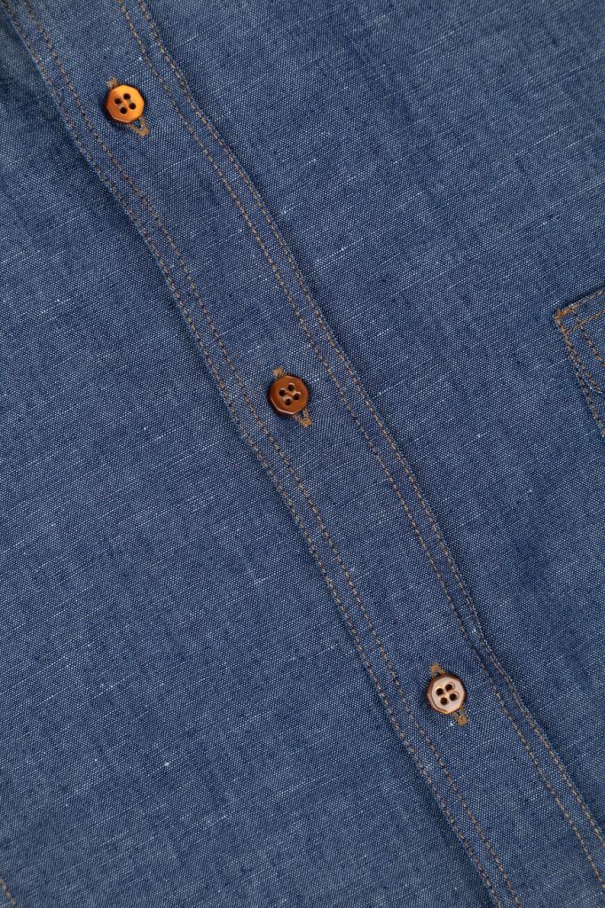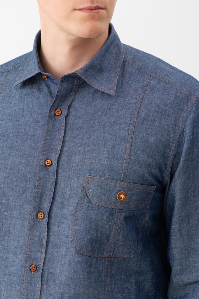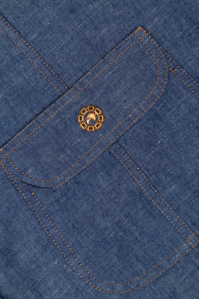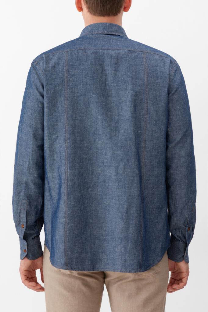 Рубашка Stefano Ricci с длинными рукавами. Для создания повседневной модели прямого силуэта используются мягкий хлопок и лён синего оттенка. Изделие интересно табачной прострочкой на швах и наличием неброского знакового декора - золотистой металлической детали с головой орла в центре на клапане нагрудного накладного кармана.