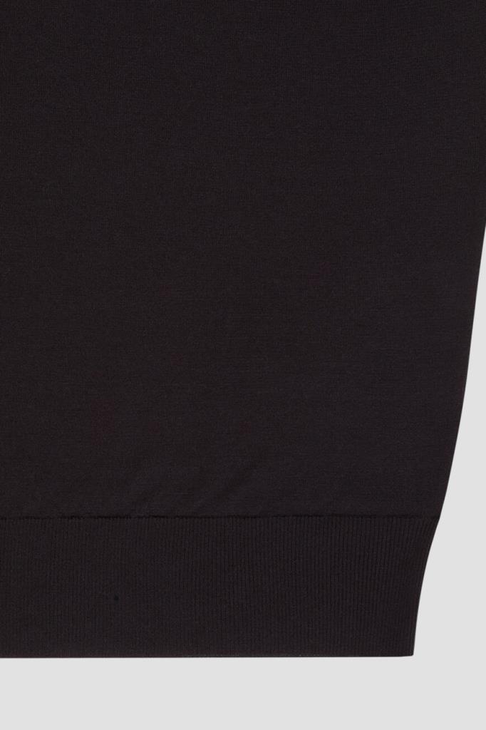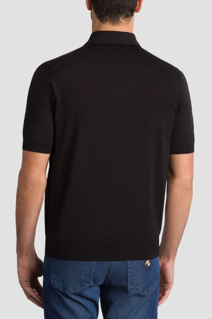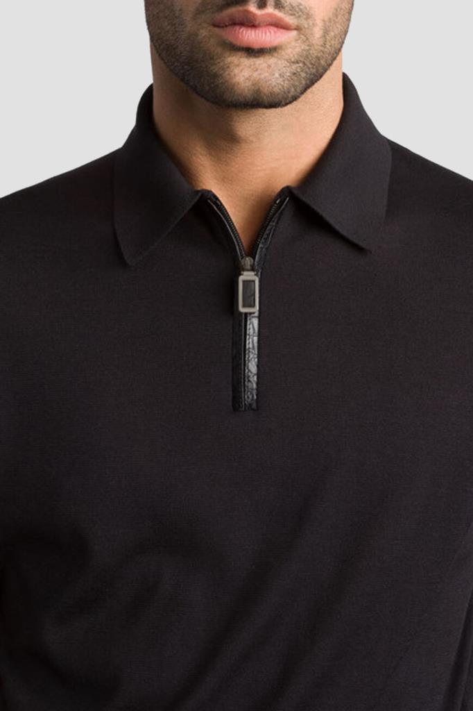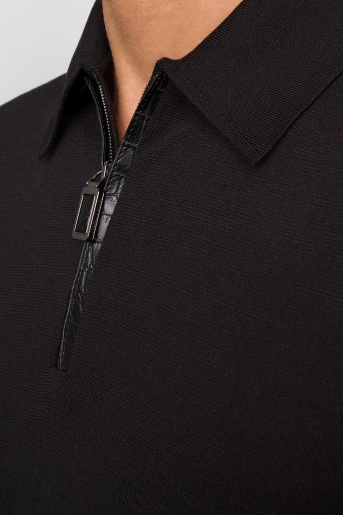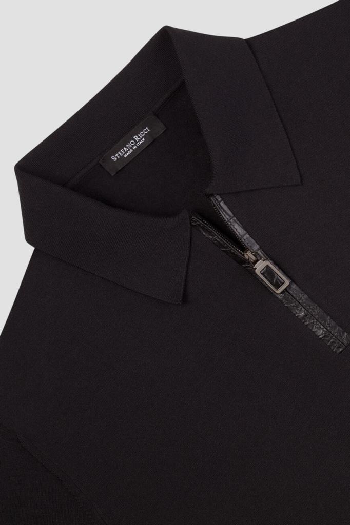 Чёрное поло прямого силуэта от Stefano Ricci. Конструкция повседневной модели, выполненной из гладкого шелкового трикотажа, характеризуется наличием короткой застёжки-молнии с пуллером из металла с гальваническим покрытием и гравировкой сбоку и классического отложного воротника на резинке. В качестве неброского декора выступает вставка из фактурной кожи крокодила на уровне планки шнуровки в тон.