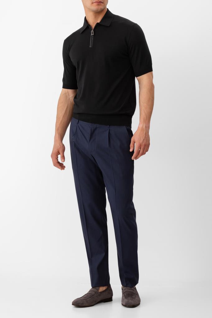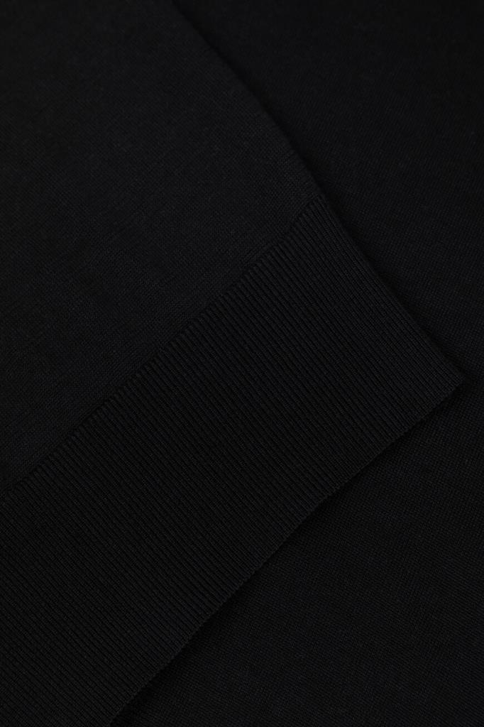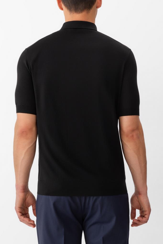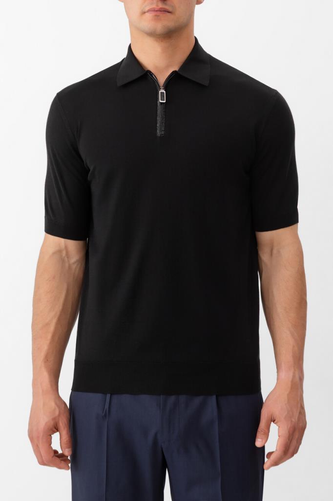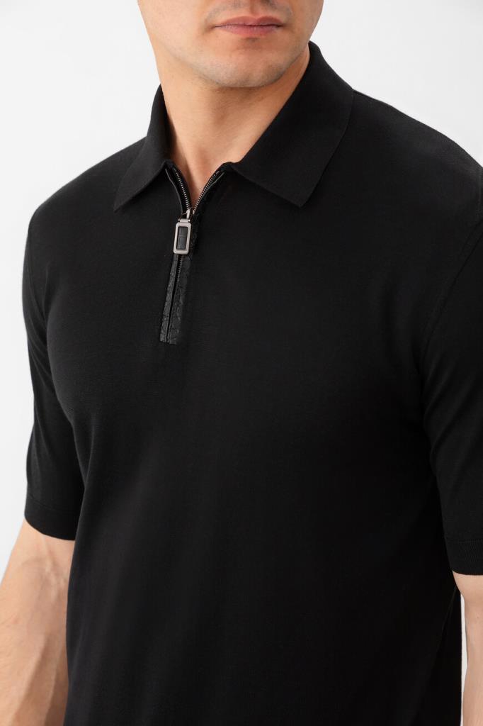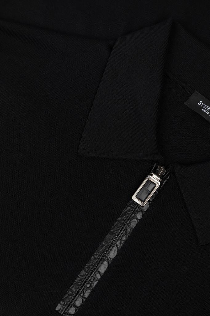 Чёрное поло прямого силуэта от Stefano Ricci. Конструкция повседневной модели, выполненной из гладкого шелкового трикотажа, характеризуется наличием короткой застёжки-молнии с пуллером из металла с гальваническим покрытием и гравировкой сбоку и классического отложного воротника на резинке. В качестве неброского декора выступает вставка из фактурной кожи крокодила на уровне планки шнуровки в тон.