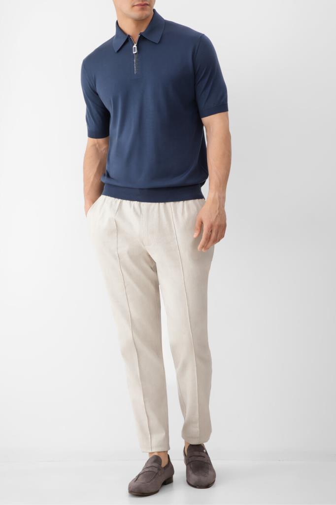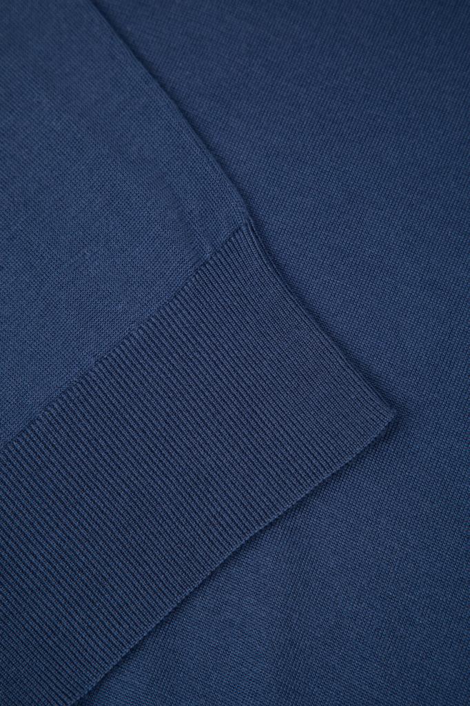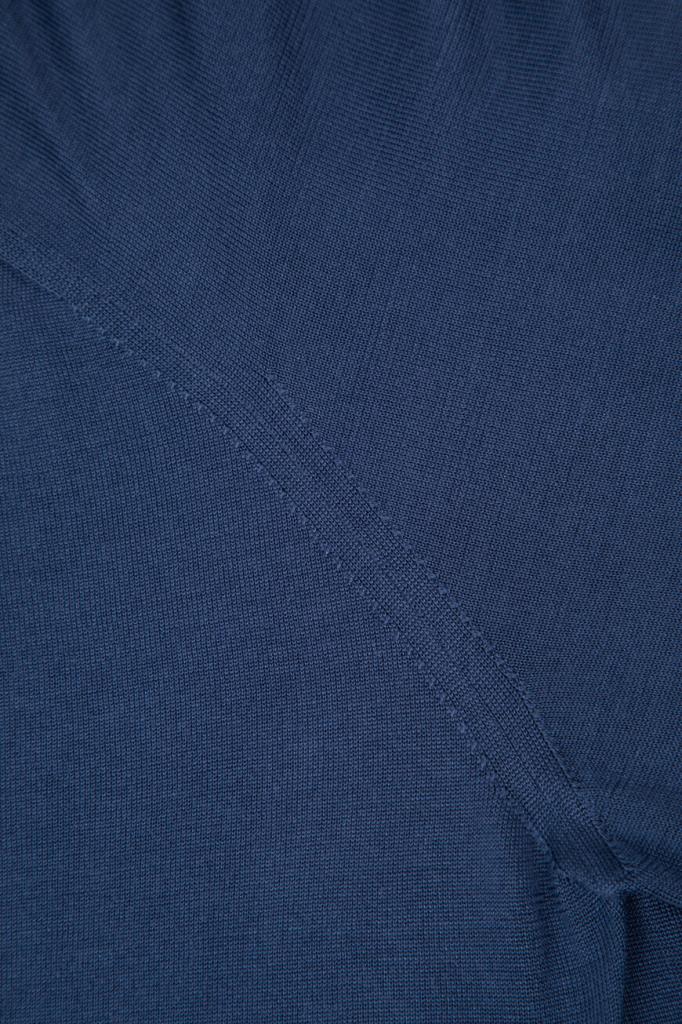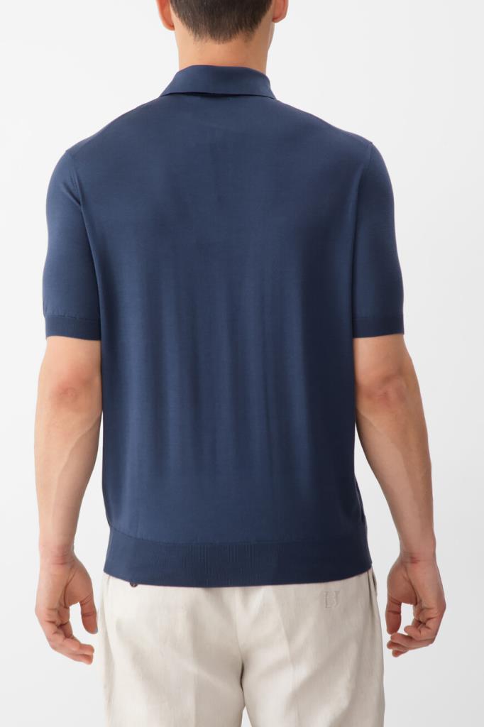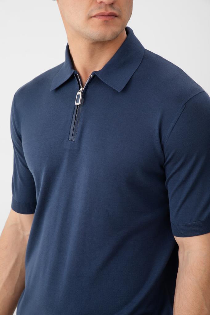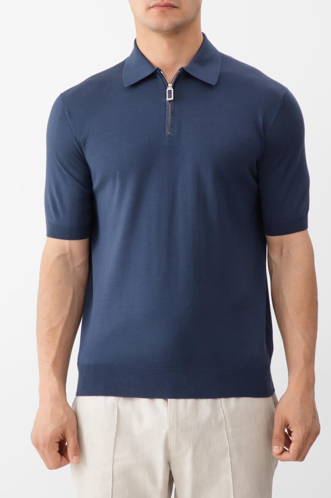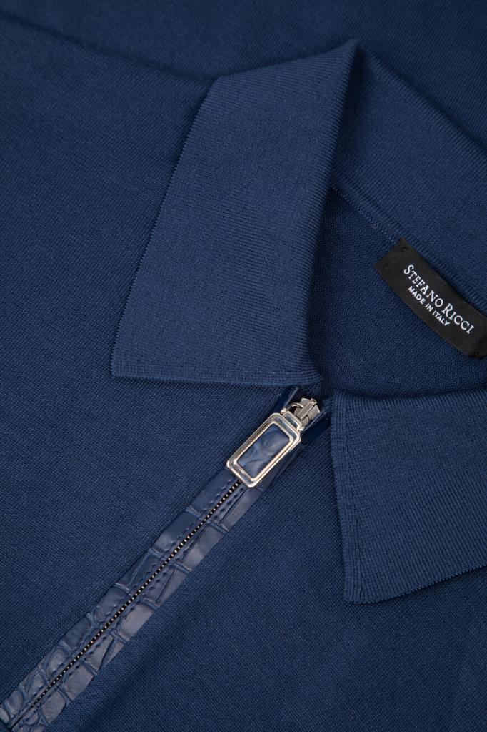 Прямое поло Stefano Ricci с широким эластичным поясом и манжетами на резинке. Изделие сшито из мягкого шелкового трикотажа тёмно-синего цвета и украшено деталью из фактурной кожи крокодила на уровне планки шнуровки в тон. Принадлежность модели Дому деликатно обозначена пуллером из металла с гальваническим покрытием и гравировкой сбоку.
