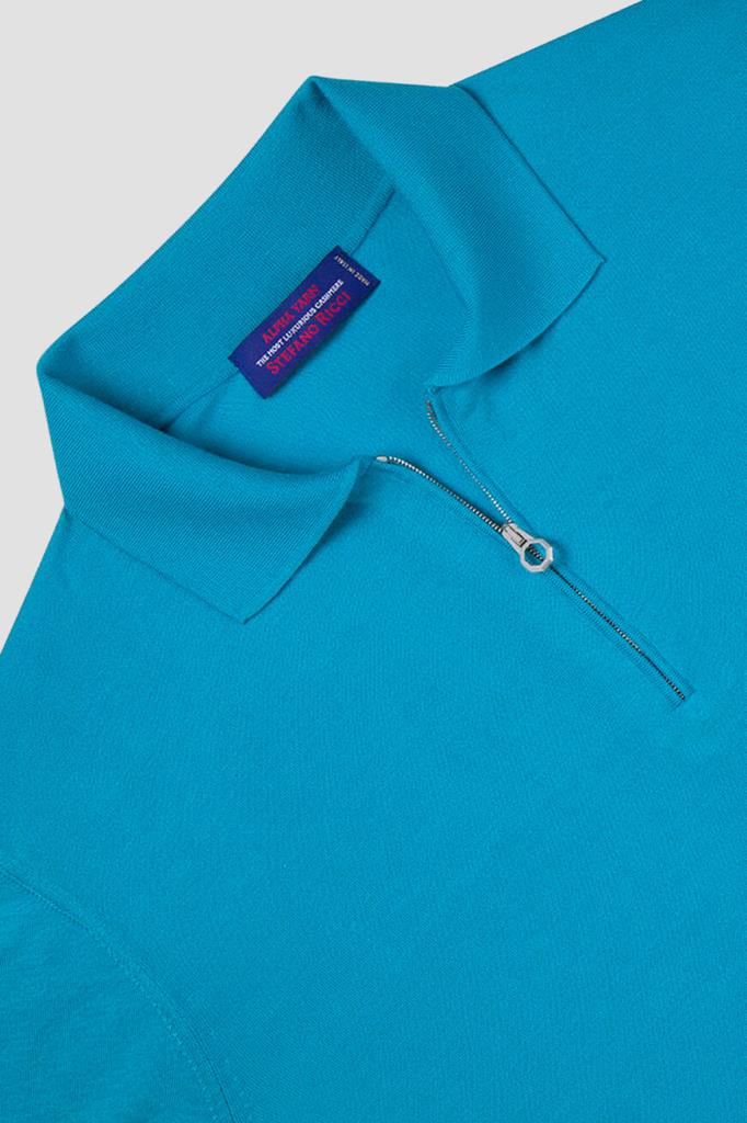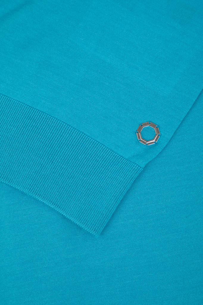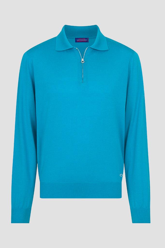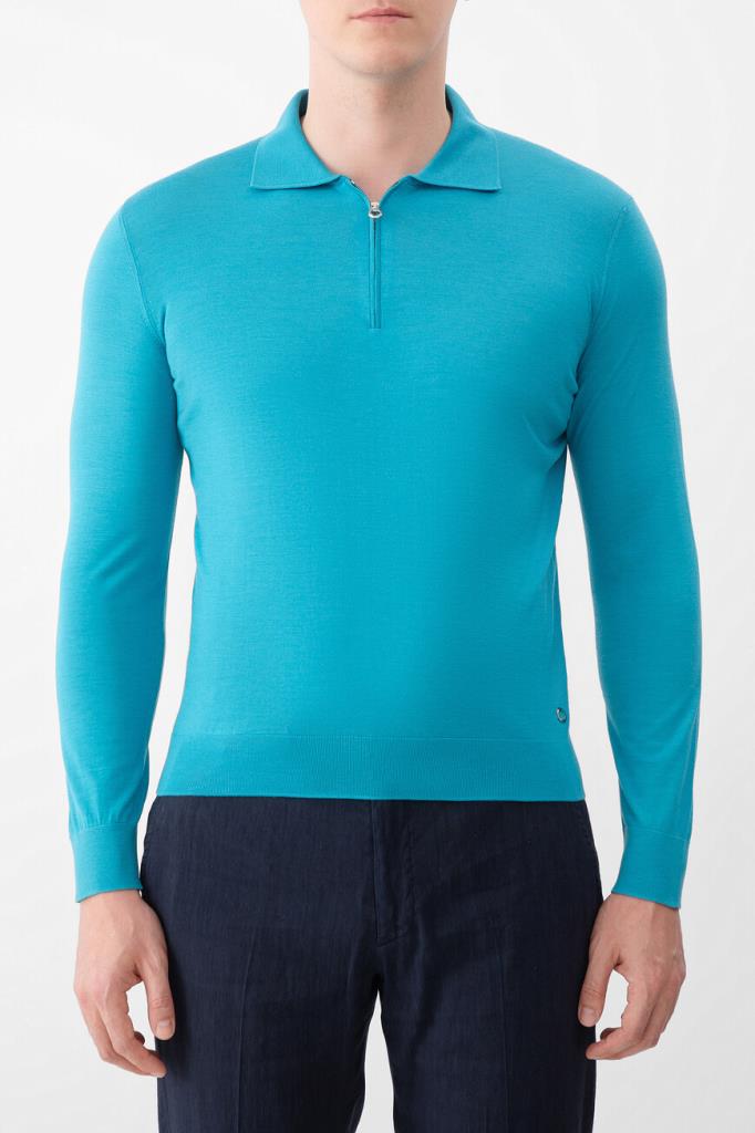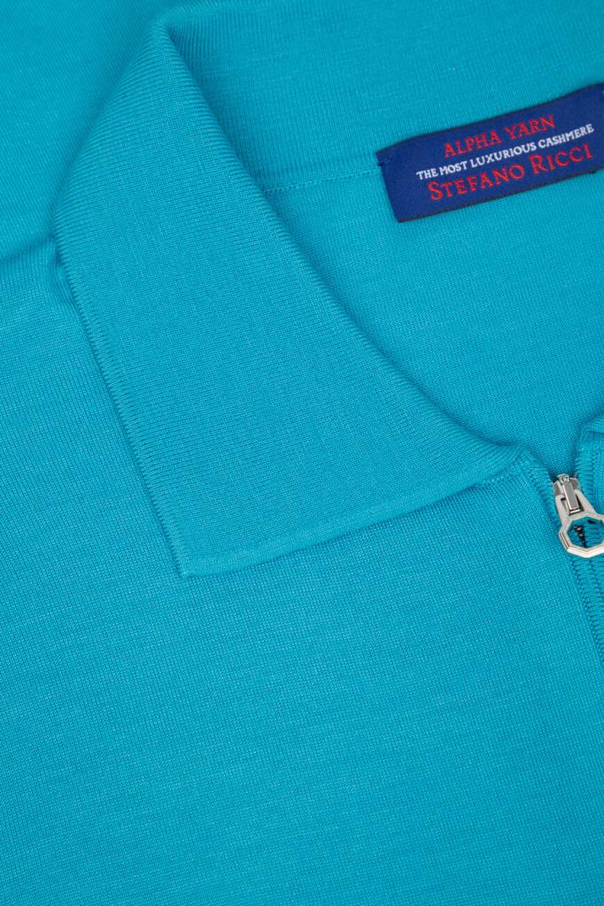 Поло Stefano Ricci голубого оттенка с длинными рукавами. Модель изготовлена из трикотажа на основе гладкого шёлка, пряжи из тончайшего кашемира Alpha Yarn диаметром 13,5 микрон и мягкой шерсти чулочной вязкой. Изделие застёгивается на молнию с серебристым металлическим пуллером-восьмигранником и характеризуется гладкой на ощупь текстурой. Атрибутом Дома также выступает деталь с гальваническим покрытием спереди слева.