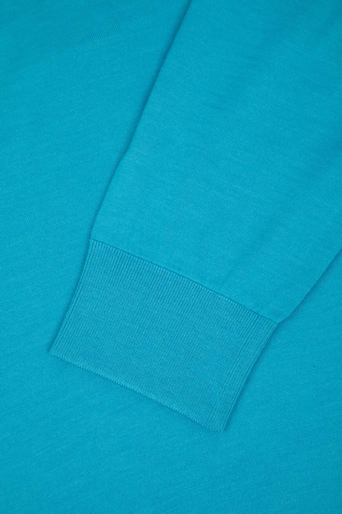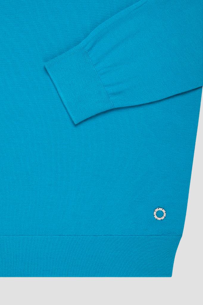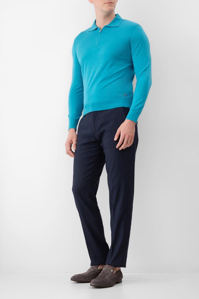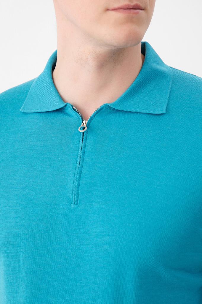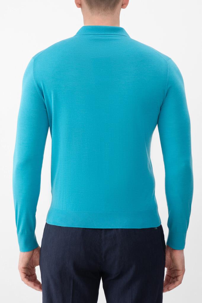 Поло Stefano Ricci голубого оттенка с длинными рукавами. Модель изготовлена из трикотажа на основе гладкого шёлка, пряжи из тончайшего кашемира Alpha Yarn диаметром 13,5 микрон и мягкой шерсти чулочной вязкой. Изделие застёгивается на молнию с серебристым металлическим пуллером-восьмигранником и характеризуется гладкой на ощупь текстурой. Атрибутом Дома также выступает деталь с гальваническим покрытием спереди слева.