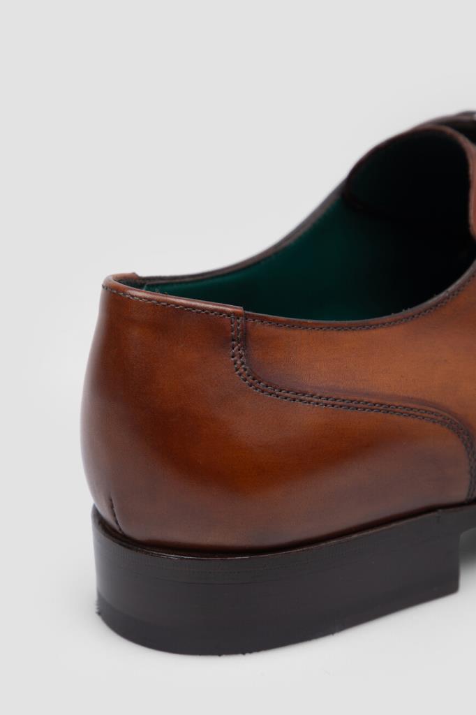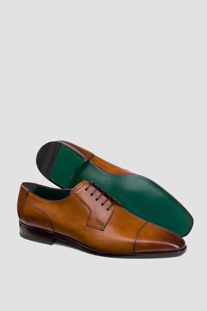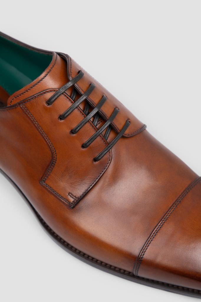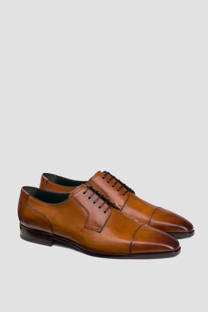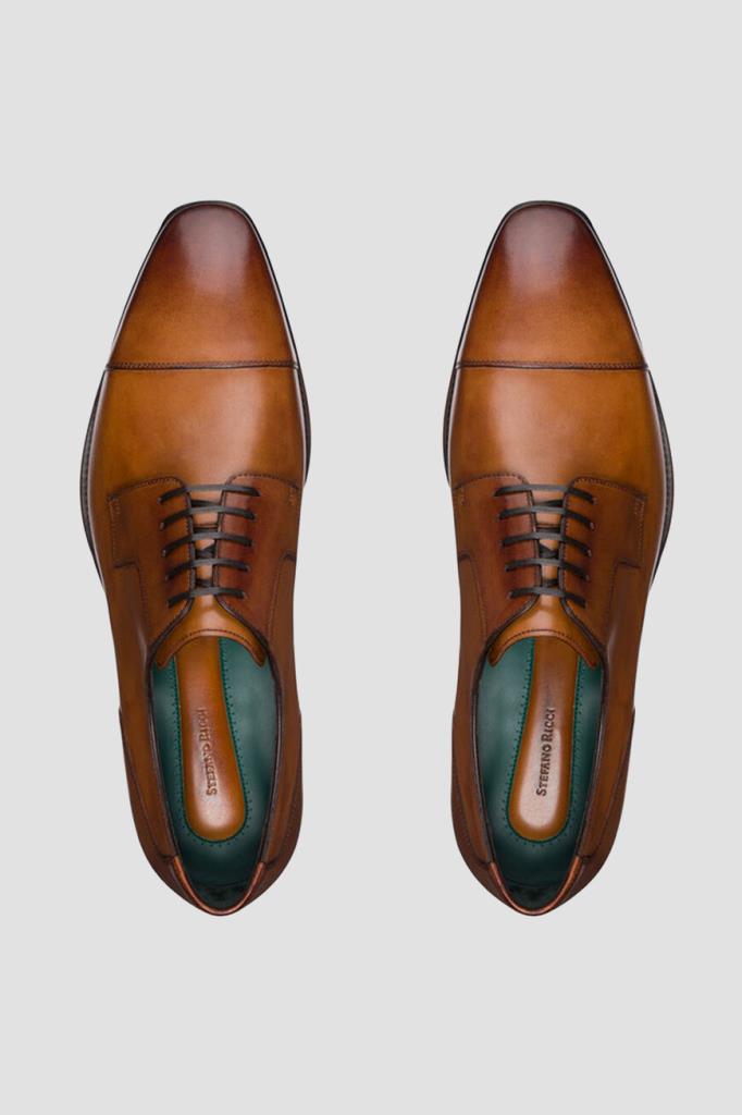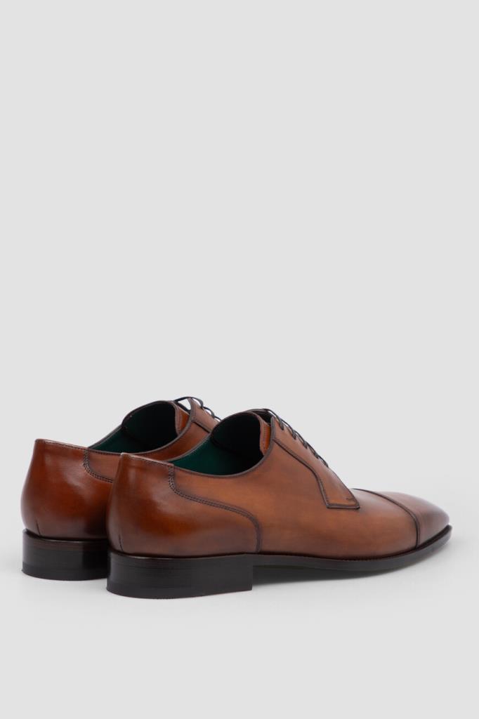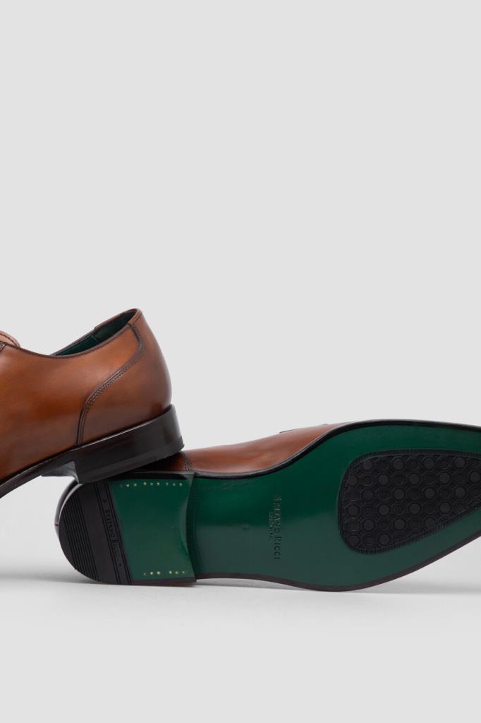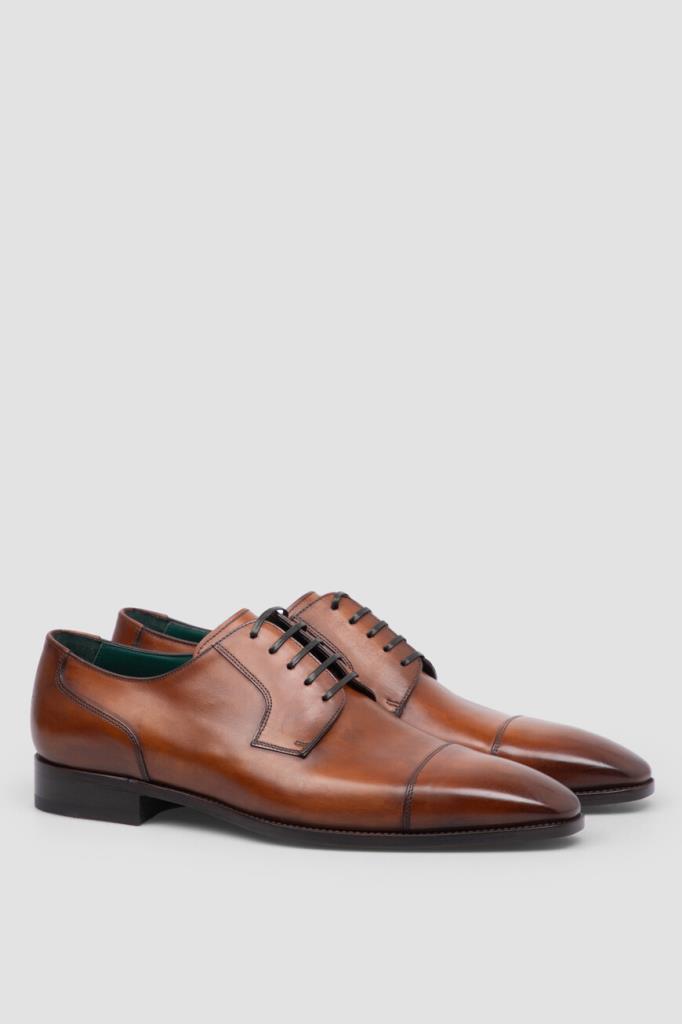 Коричневые дерби Stefano Ricci с патиной. Для создания удобной пары с традиционной для такого типа обуви открытой шнуровкой выбрана гладкая кожа телёнка. Изделие на гибкой чёрной подошве с устойчивым наборным каблуком станет незаменимой основой любого образа в стиле смарт-кэжуал.