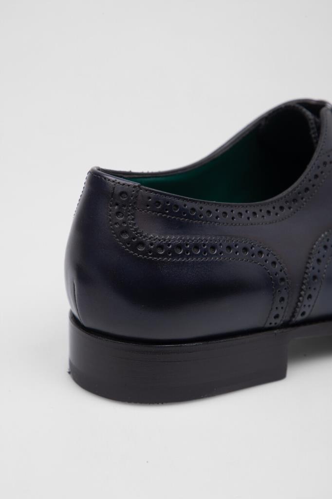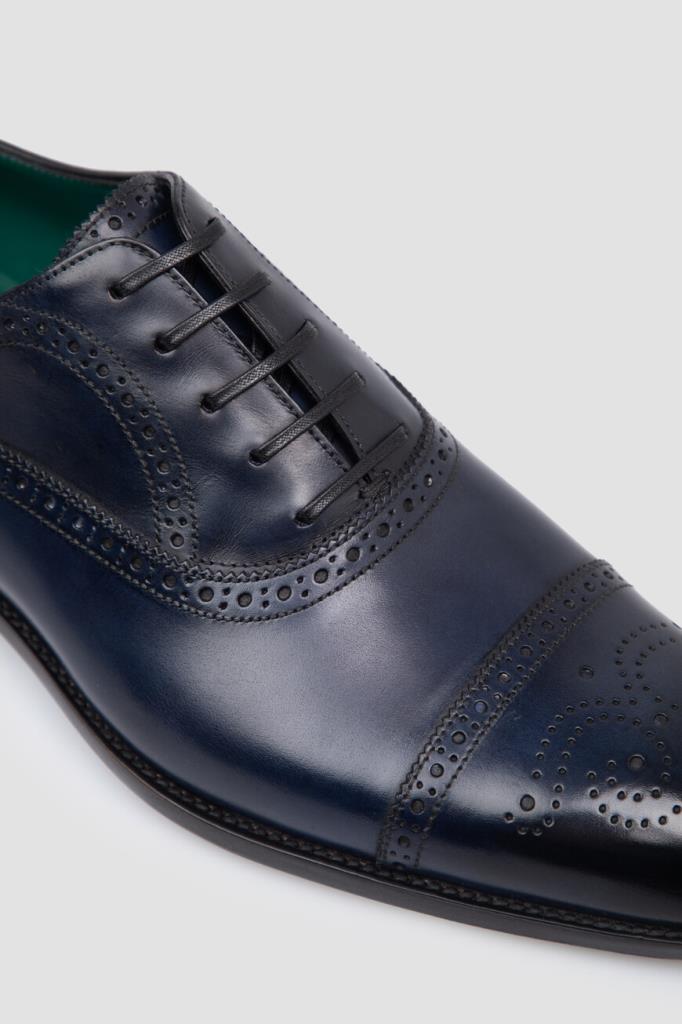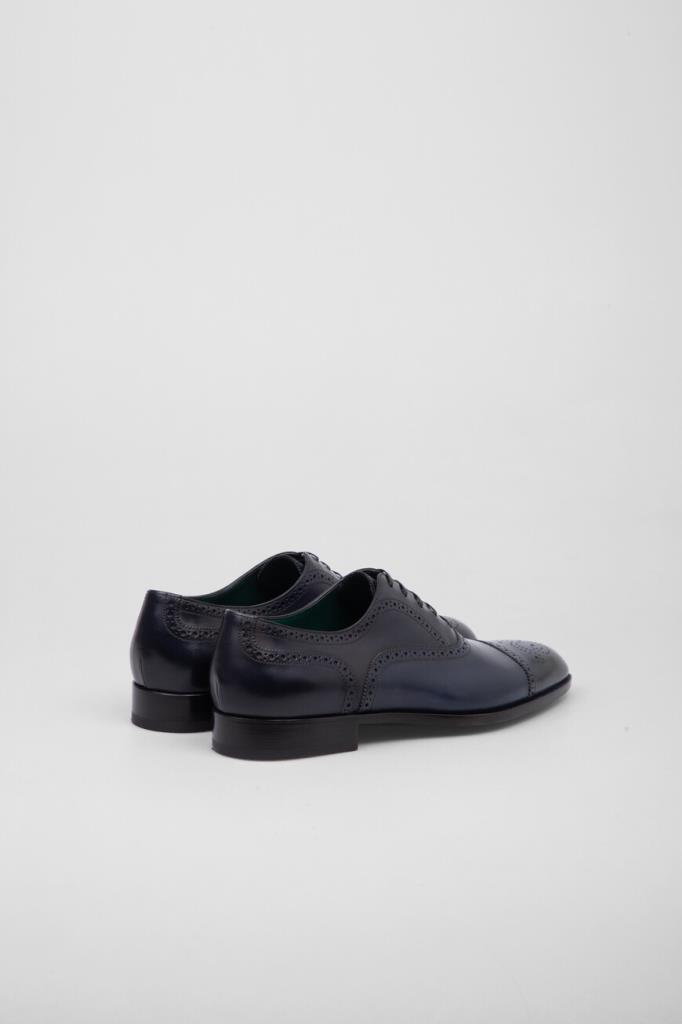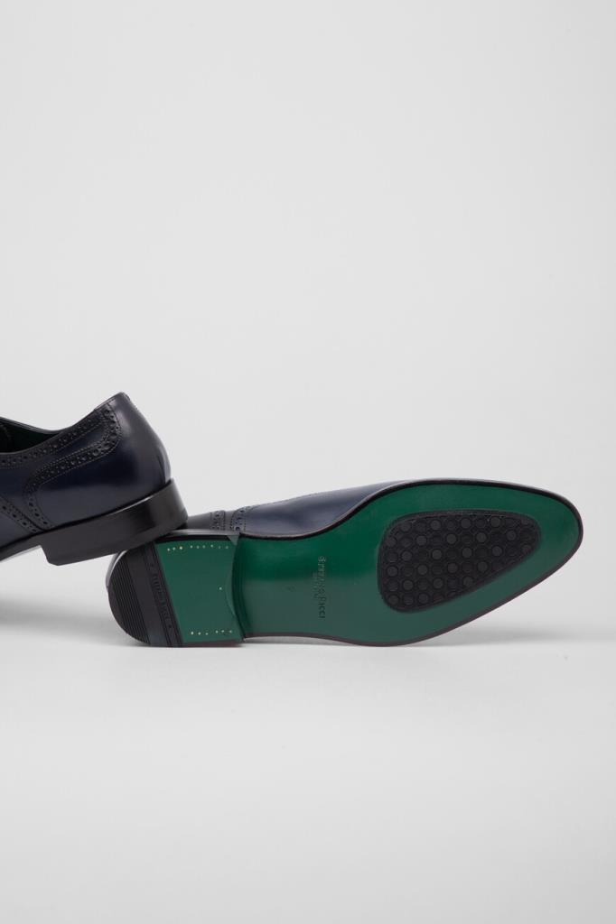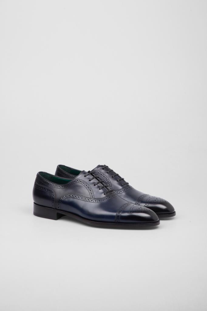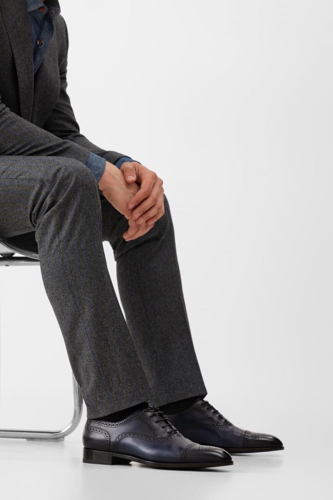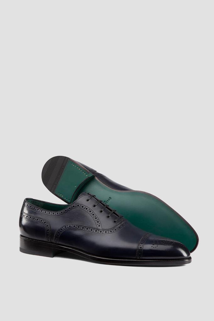 Оксфорды Stefano Ricci, отполированные до деликатного блеска. Для производства изделия тёмно-синего цвета используется гладкая телячья кожа. Декором выступает перфорированный геометрический узор-брогирование и зигзагообразный кант на язычке. Модель с миндалевидным носком будет смотреться уместно и в комплекте для офиса, и в образе для официального мероприятия.
