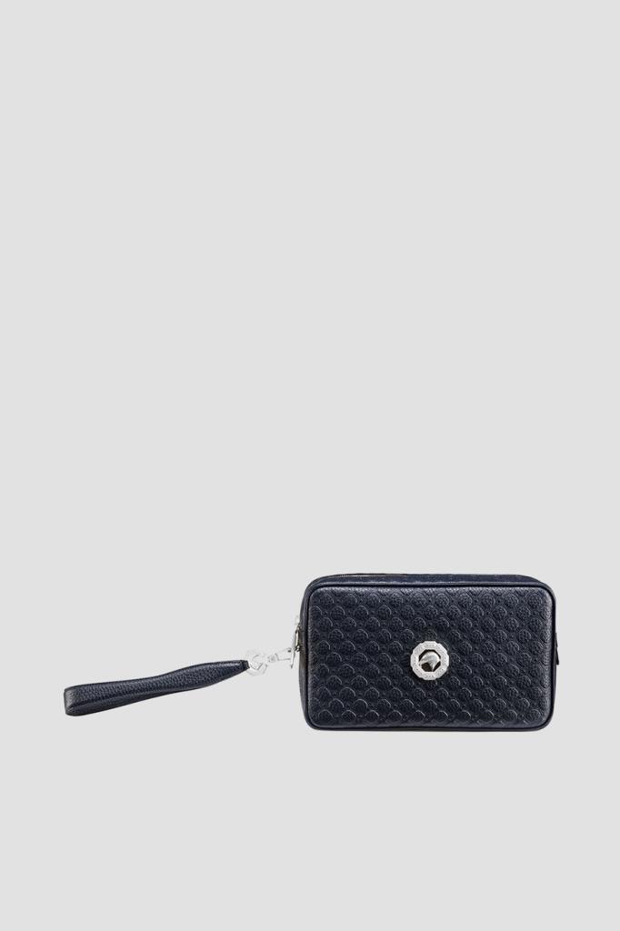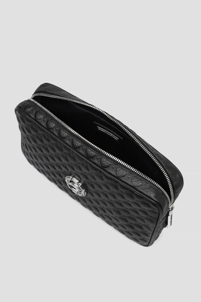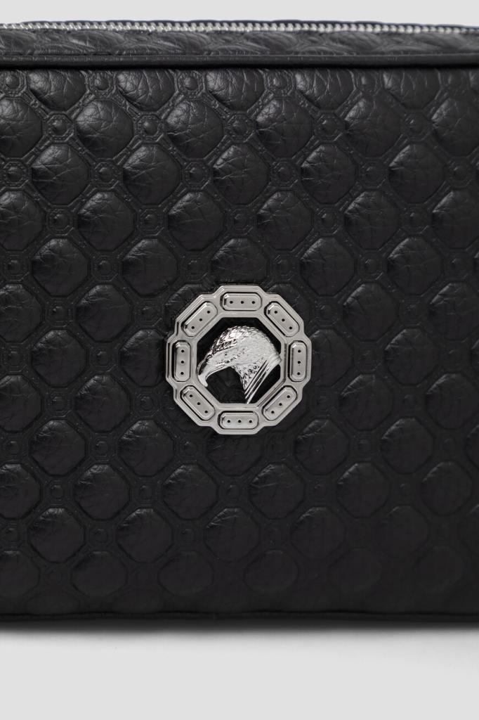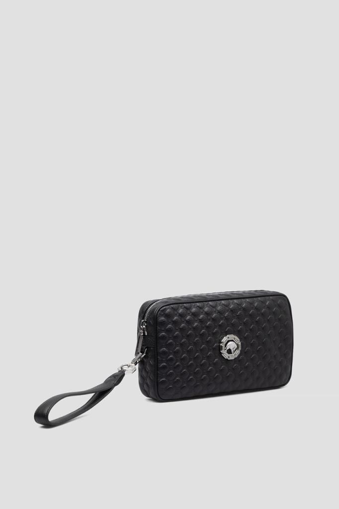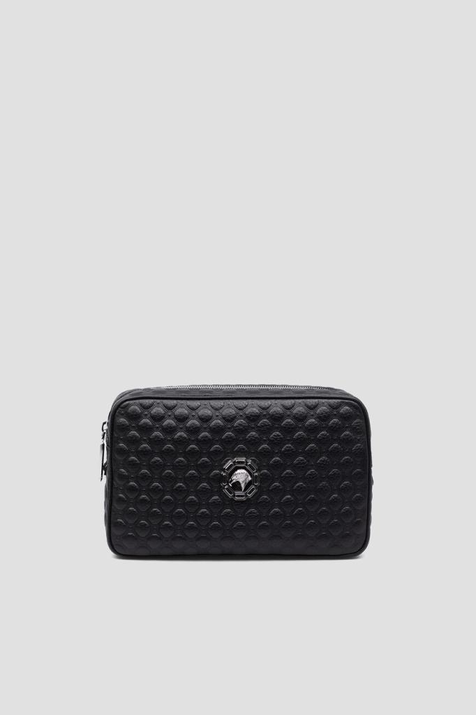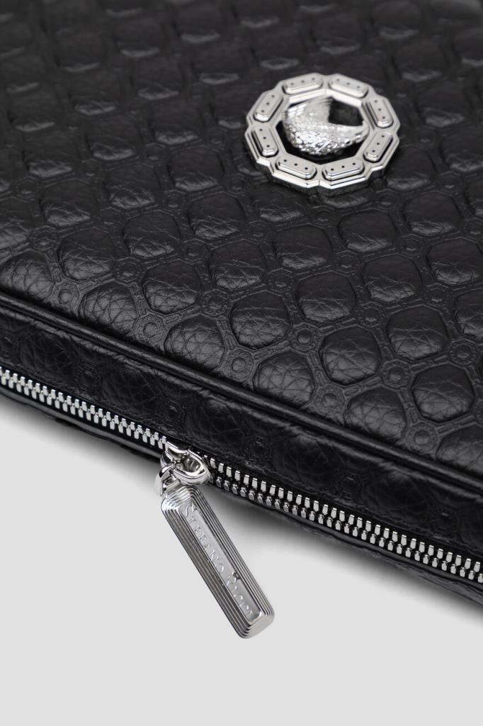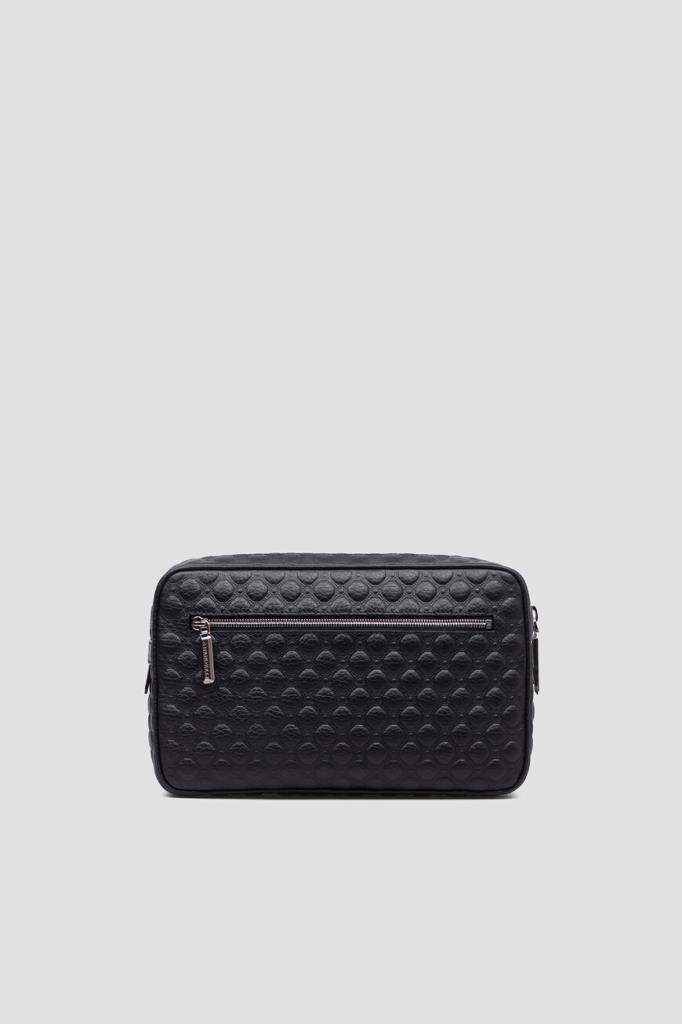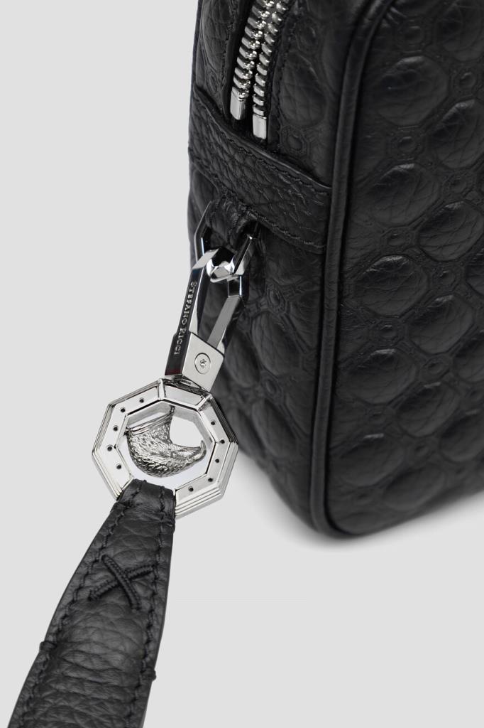 Чёрный несессер Stefano Ricci с декоративной палладиевой фурнитурой. Конструкция компактного аксессуара из фактурной матовой кожи телёнка характеризуется наличием просторного внутреннего отделения на молнии с брендированным металлическим пуллером. Поверхность модели покрыта геометрическим узором в тон. Для удобства переноски в изделии прямоугольного формата предусмотрена съёмная ручка-петля.