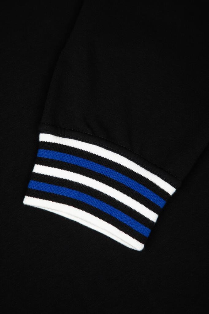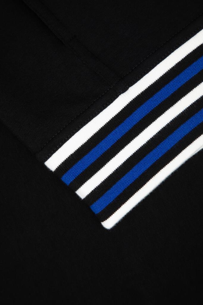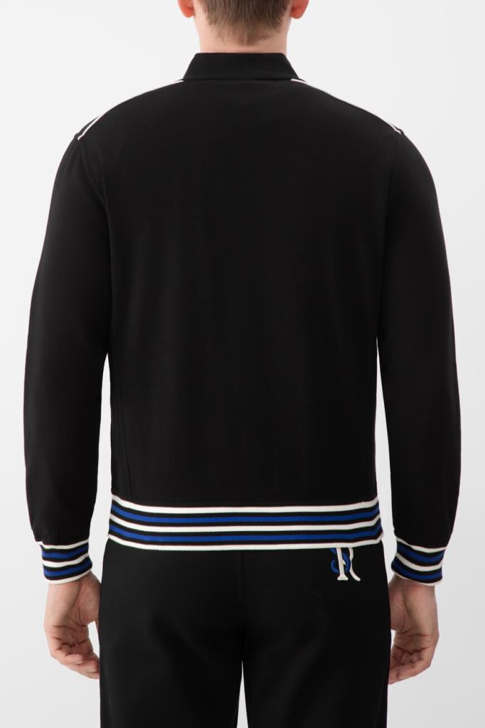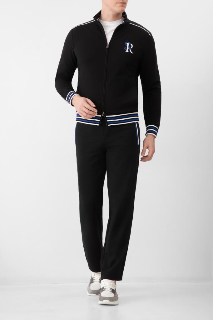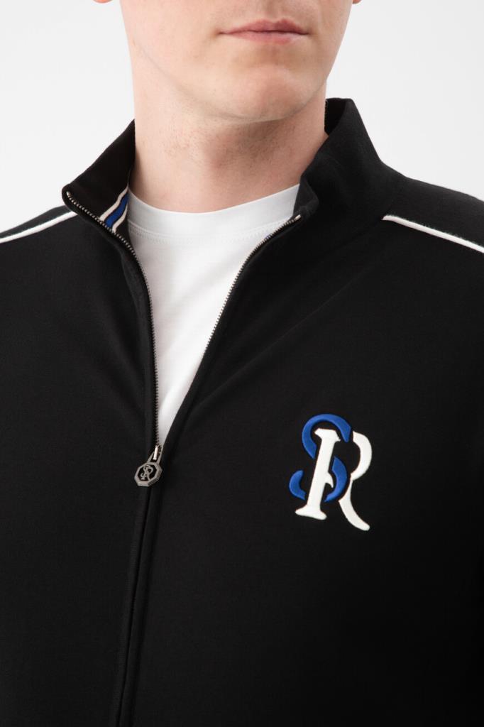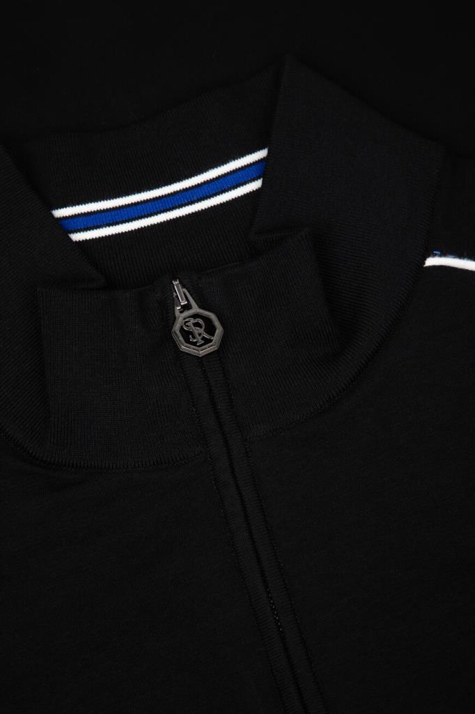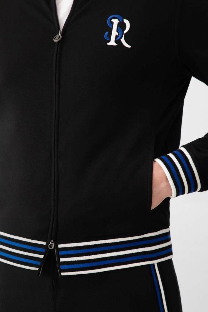 Толстовка из эластичного хлопкового трикотажа чёрного цвета от Stefano Ricci. Конструкция изделия прямого силуэта предполагает наличие воротника-стойки и застёжки на встречную молнию с двумя брендированными пуллерами. Отличительными делателями являются трёхцветный полосатый принт на внутренней стороне воротника, манжетах рукавов и широком поясе и крупная вышитая аббревиатура SR слева на груди. Дополните образ спортивными брюками на кулиске из той же коллекции.