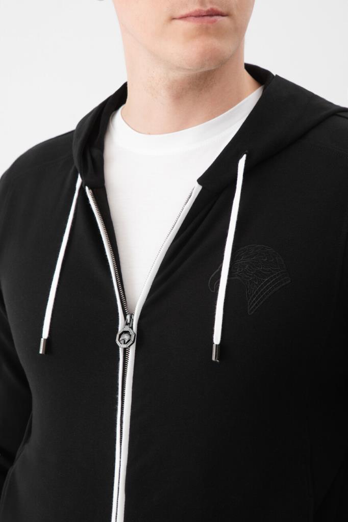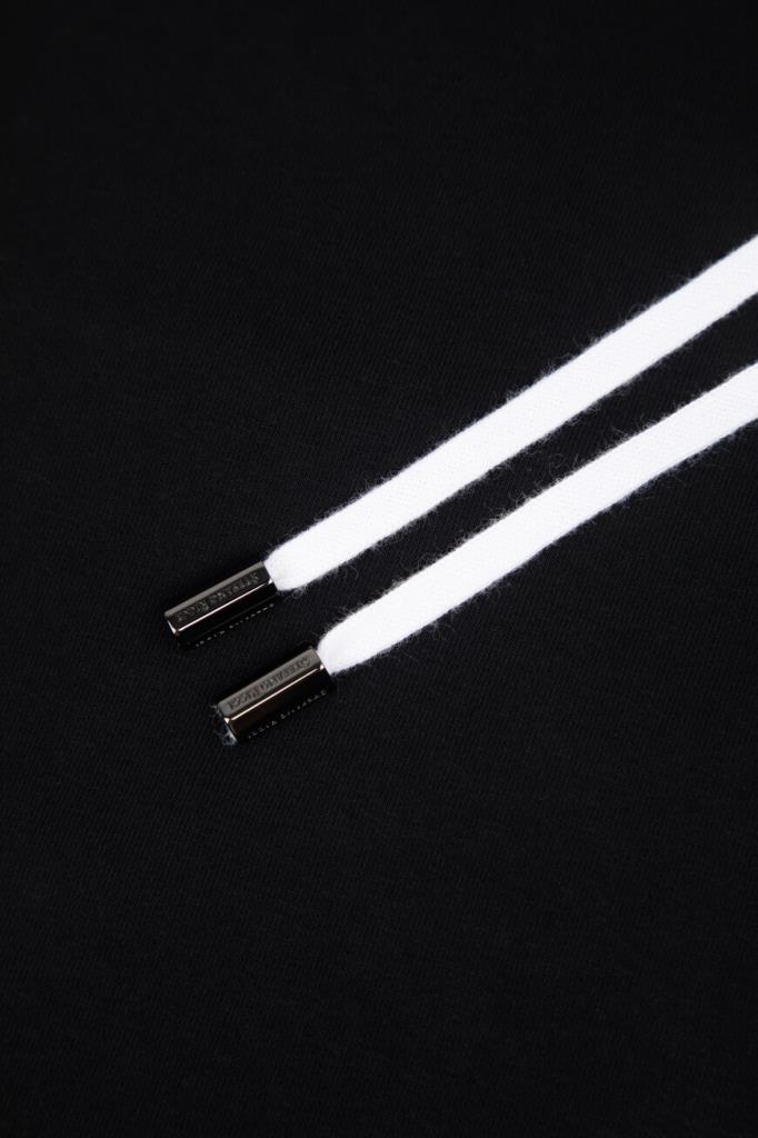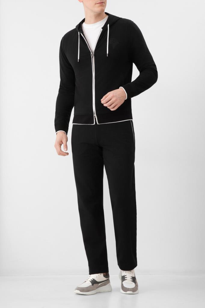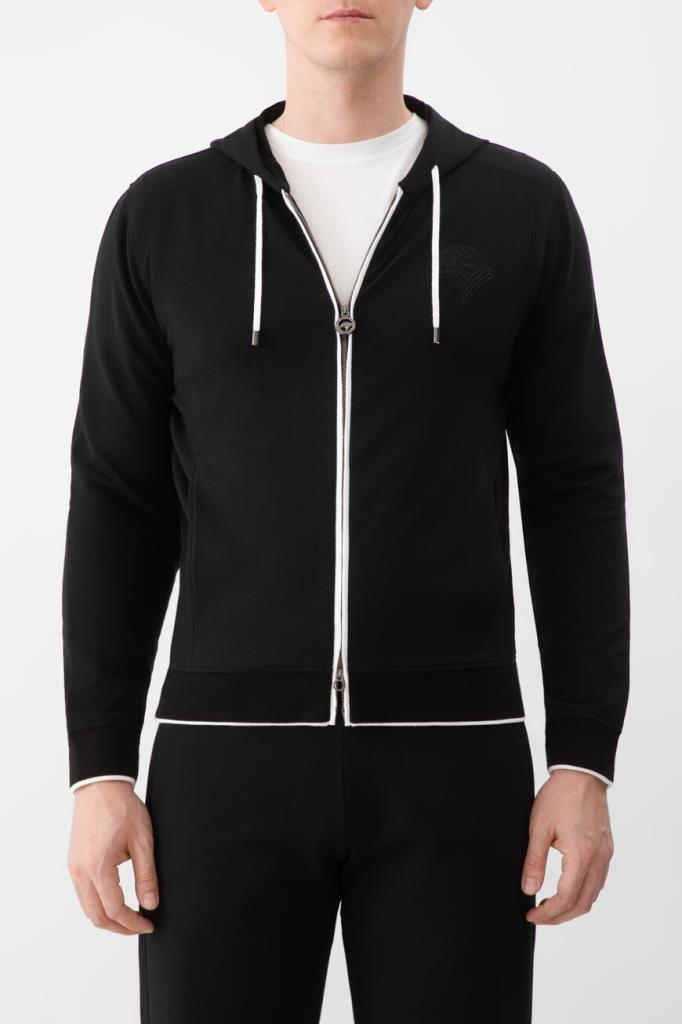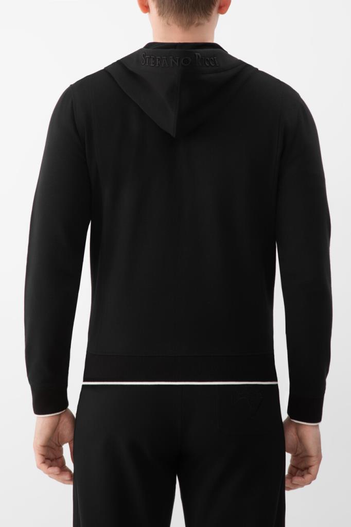 Стрейчевая толстовка чёрного цвета от Stefano Ricci. Для пошива модели прямого силуэта выбран мягкий хлопковый трикотаж. Декором выступают контрастные полосы-окантовка по обе стороны планки застёжки, на манжетах рукавов и широком поясе. Дополнительный комфорт и защиту от непогоды обеспечивает глубокий капюшон на белых завязках. Сочетайте изделие со спортивными брюками с тремя практичными карманами из той же коллекции.