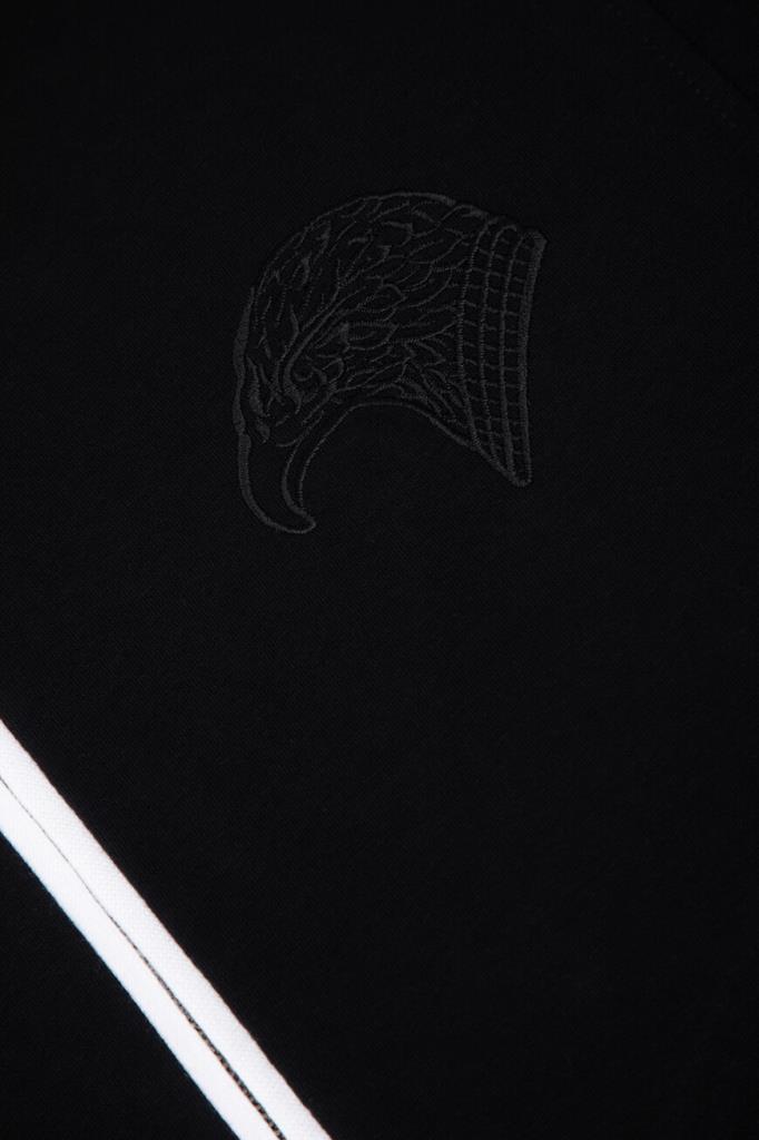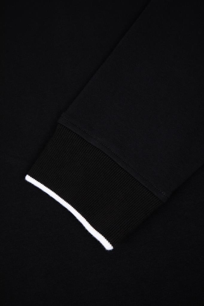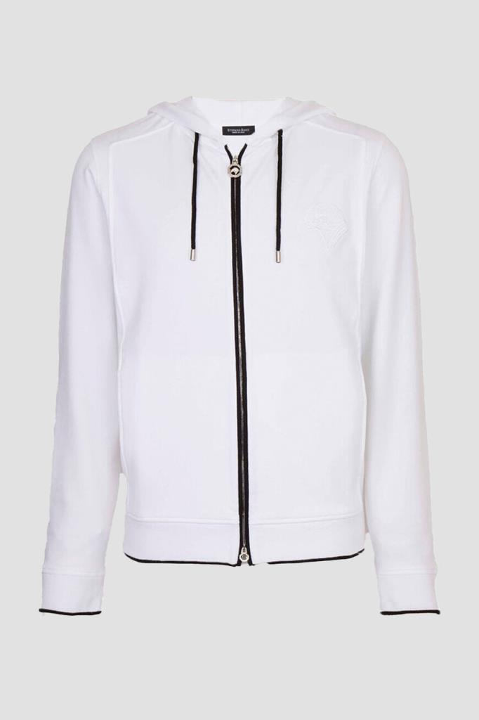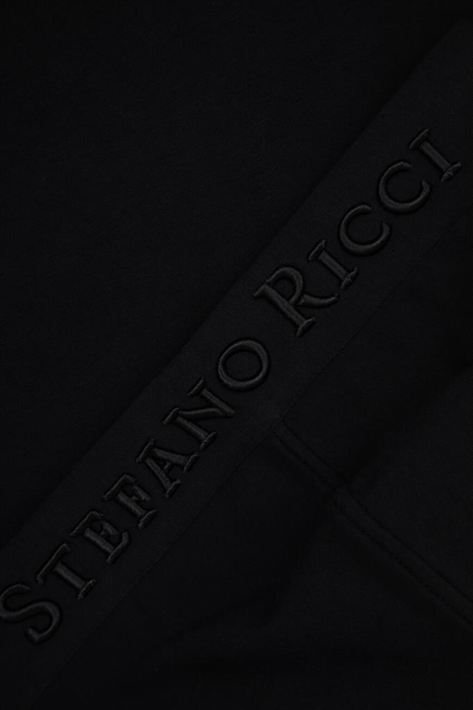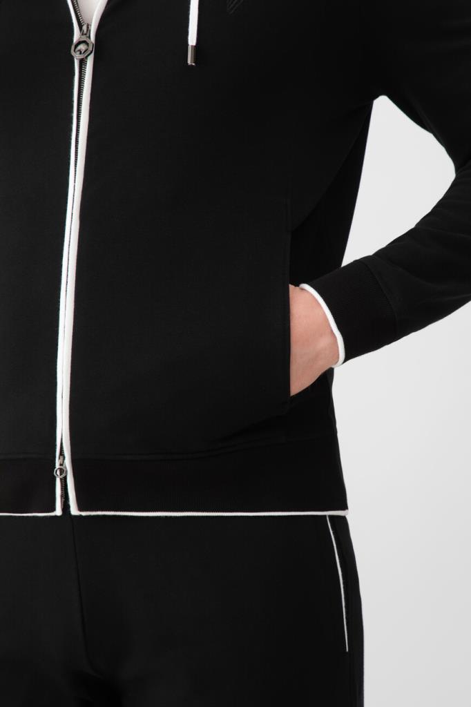 Стрейчевая толстовка чёрного цвета от Stefano Ricci. Для пошива модели прямого силуэта выбран мягкий хлопковый трикотаж. Декором выступают контрастные полосы-окантовка по обе стороны планки застёжки, на манжетах рукавов и широком поясе. Дополнительный комфорт и защиту от непогоды обеспечивает глубокий капюшон на белых завязках. Сочетайте изделие со спортивными брюками с тремя практичными карманами из той же коллекции.