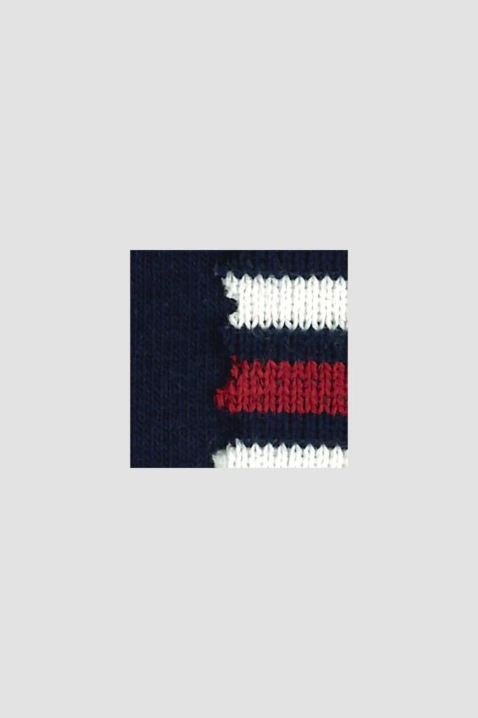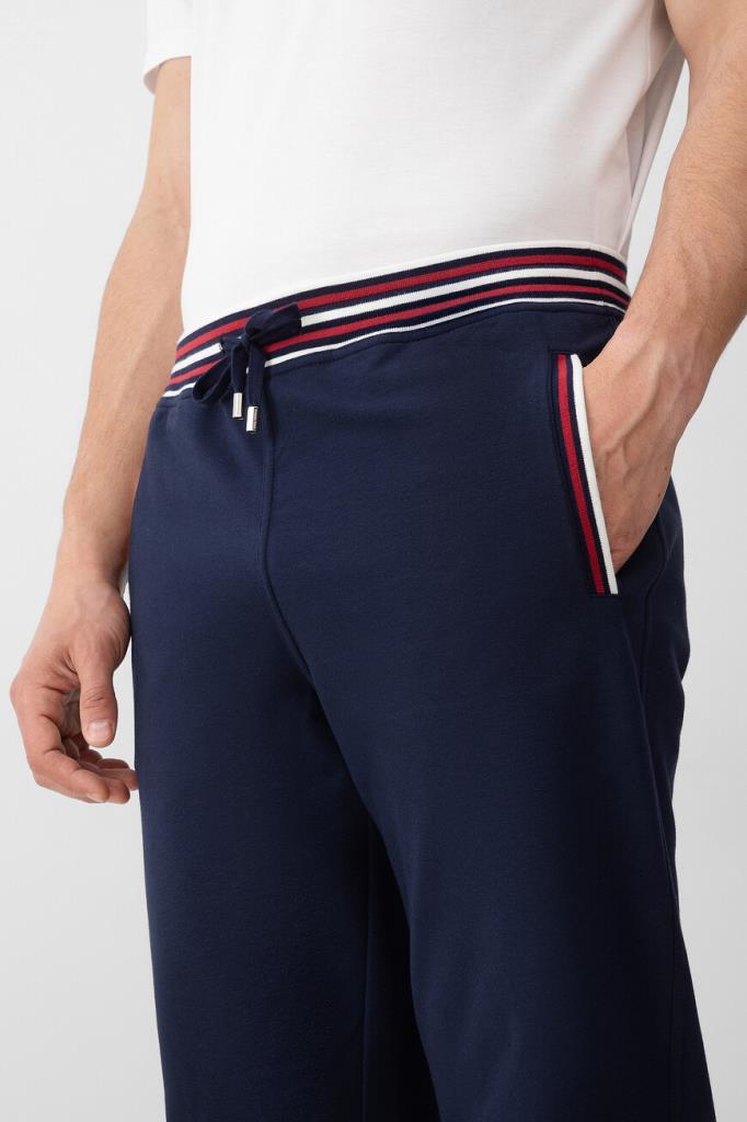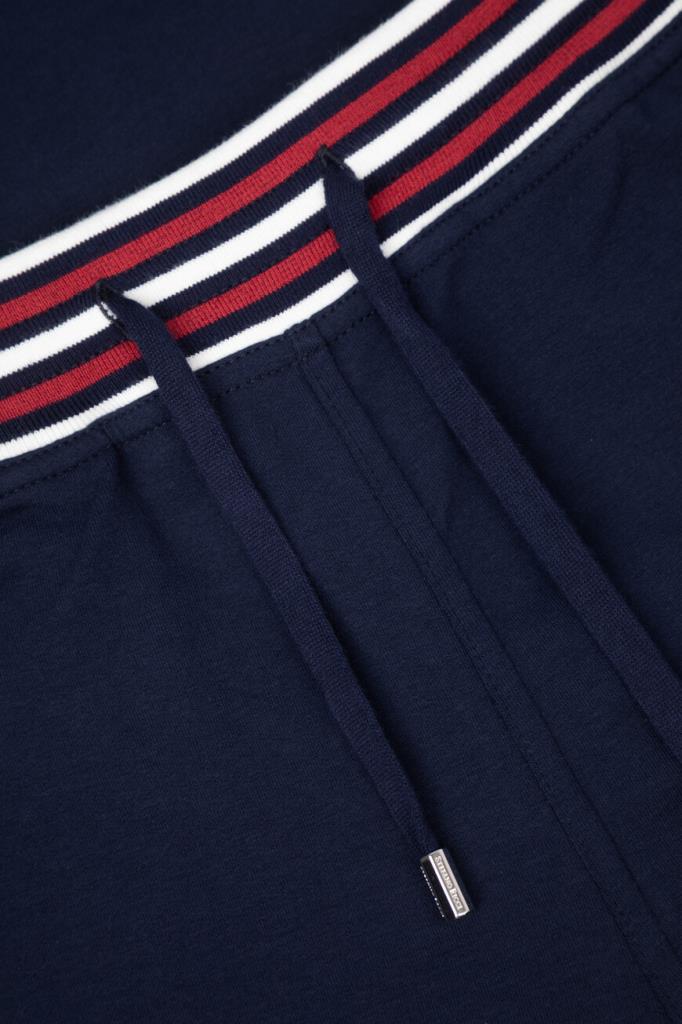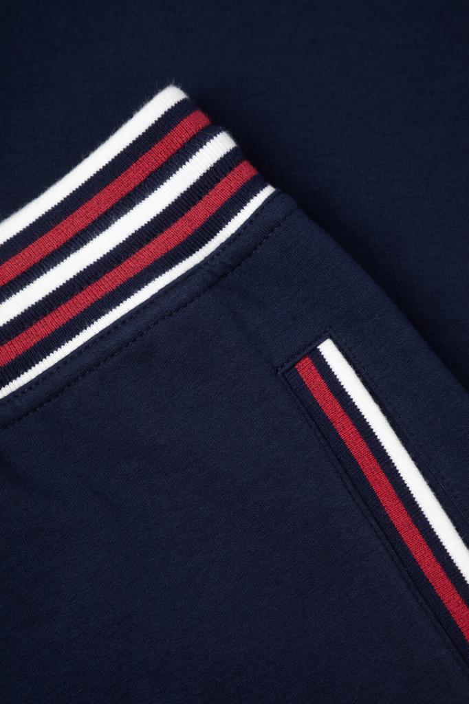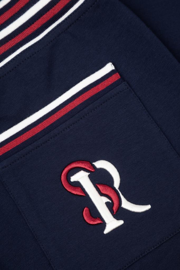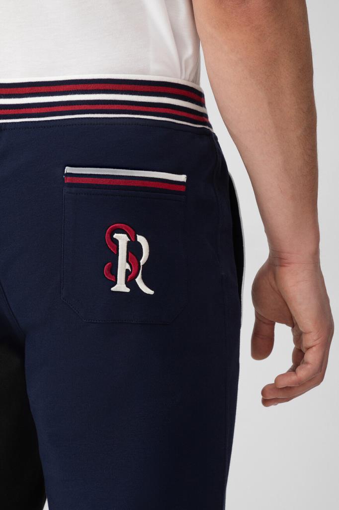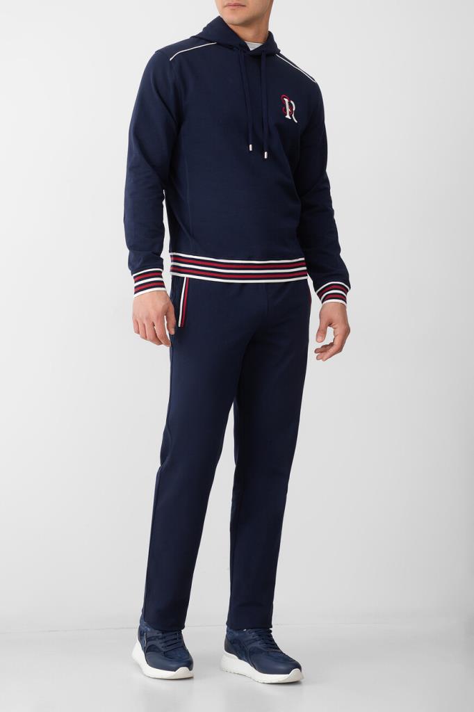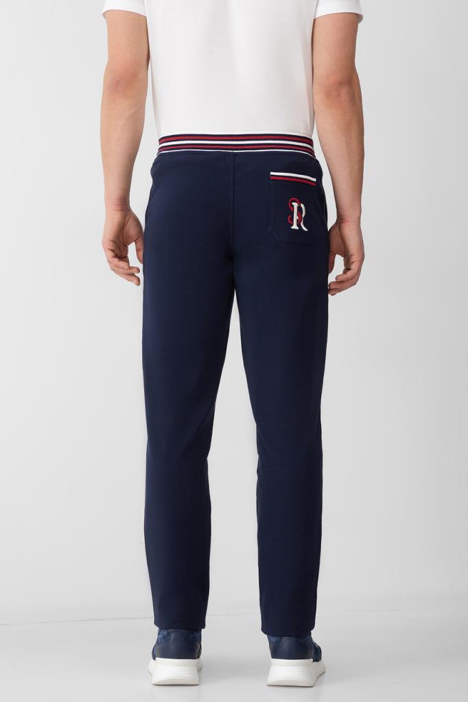 Прямые спортивные брюки Stefano Ricci с трёхцветным полосатым принтом. Модель изготовлена из эластичного хлопкового трикотажа тёмно-синего цвета и дополнена тремя карманами с отделкой в резинку: двумя прорезными по бокам и накладным с крупной вышитой аббревиатурой SR сзади справа. Образ можно завершить толстовкой на встречной молнии с двумя брендированными пуллерами из той же коллекции.