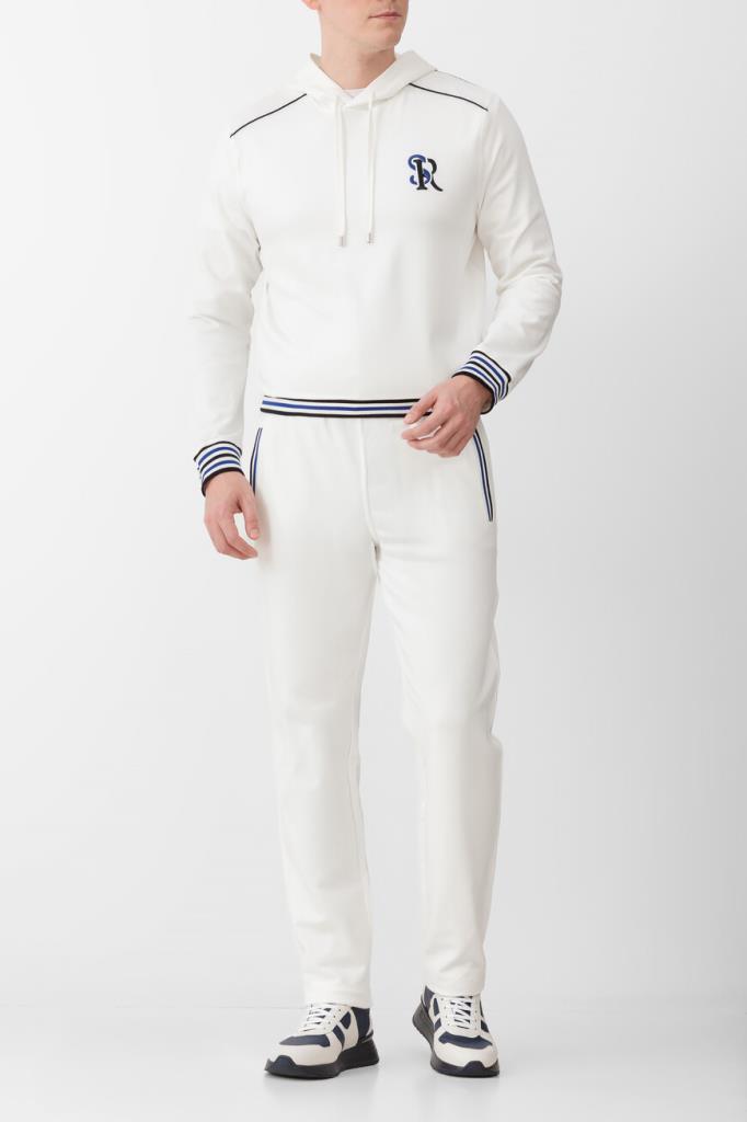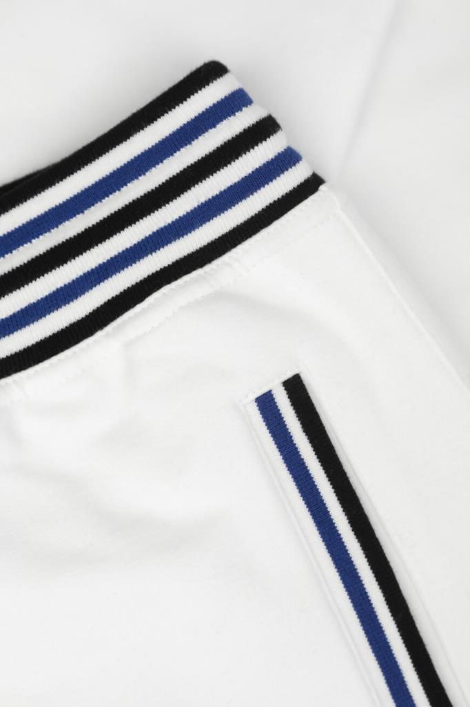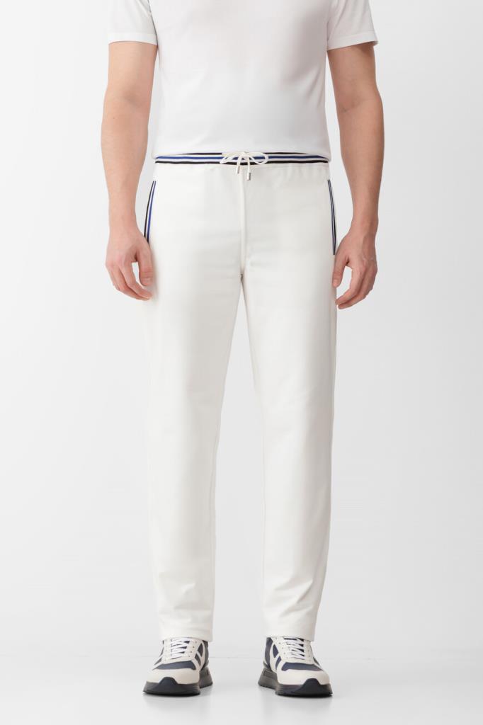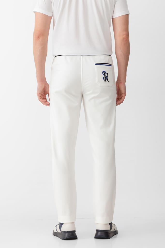 Брюки Stefano Ricci станут основой непринуждённого спортивного комплекта. Для создания изделия белого цвета выбран мягкий, немного эластичный трикотаж, сырьём для которого стал отборный длинноволокнистый хлопок. Широкий эластичный пояс, подобранный на кулиску, и три кармана подчёркнуты трёхцветным принтом в виде полос. В такой же палитре выполнена вышивка с лого-монограммой сзади.