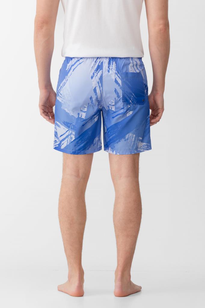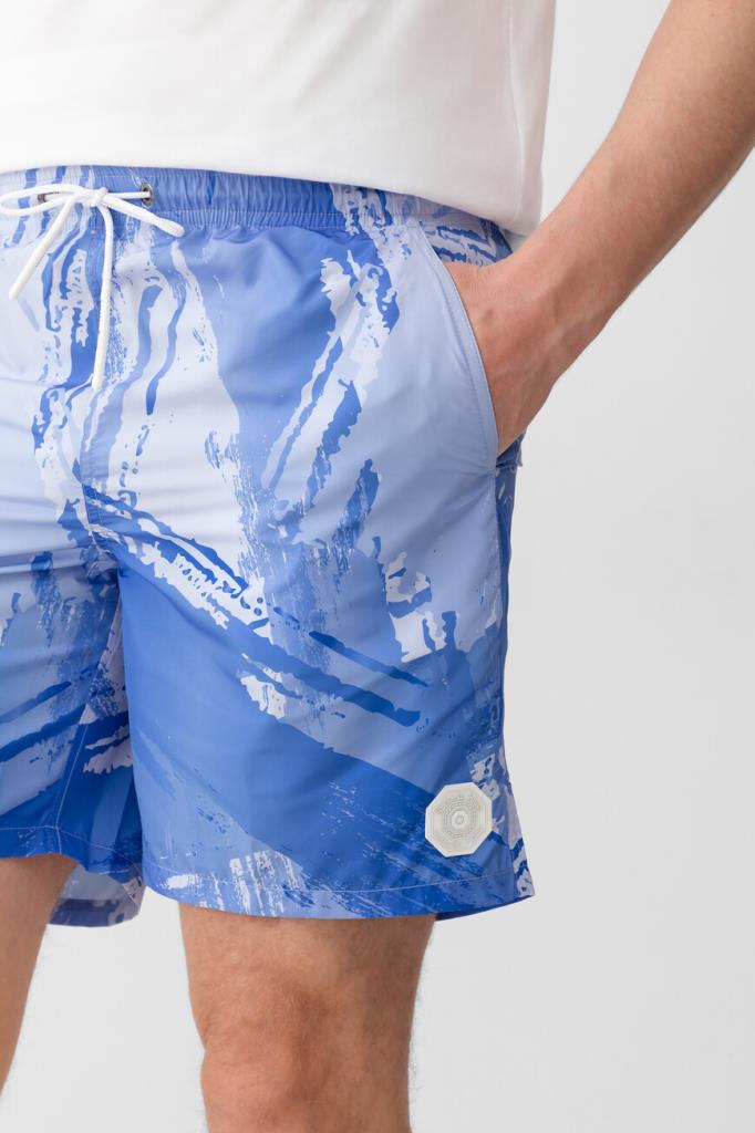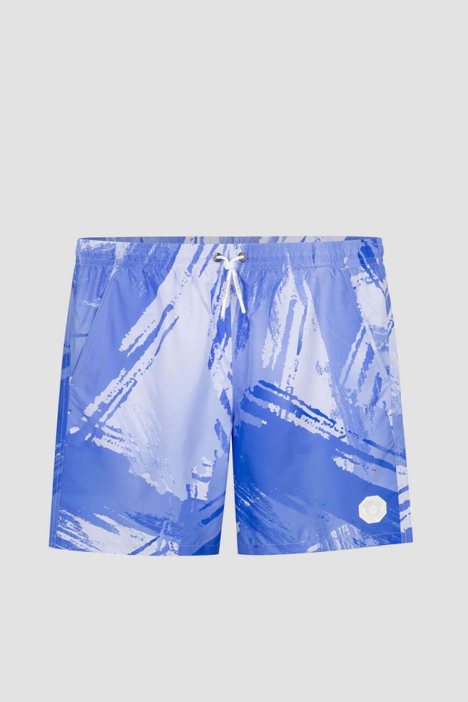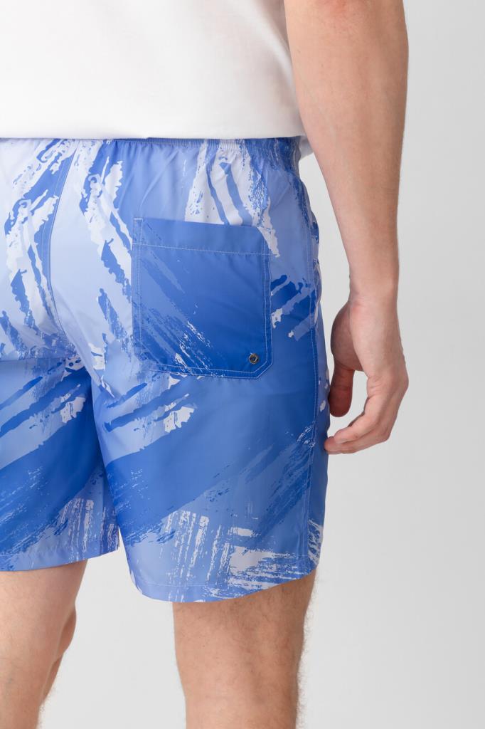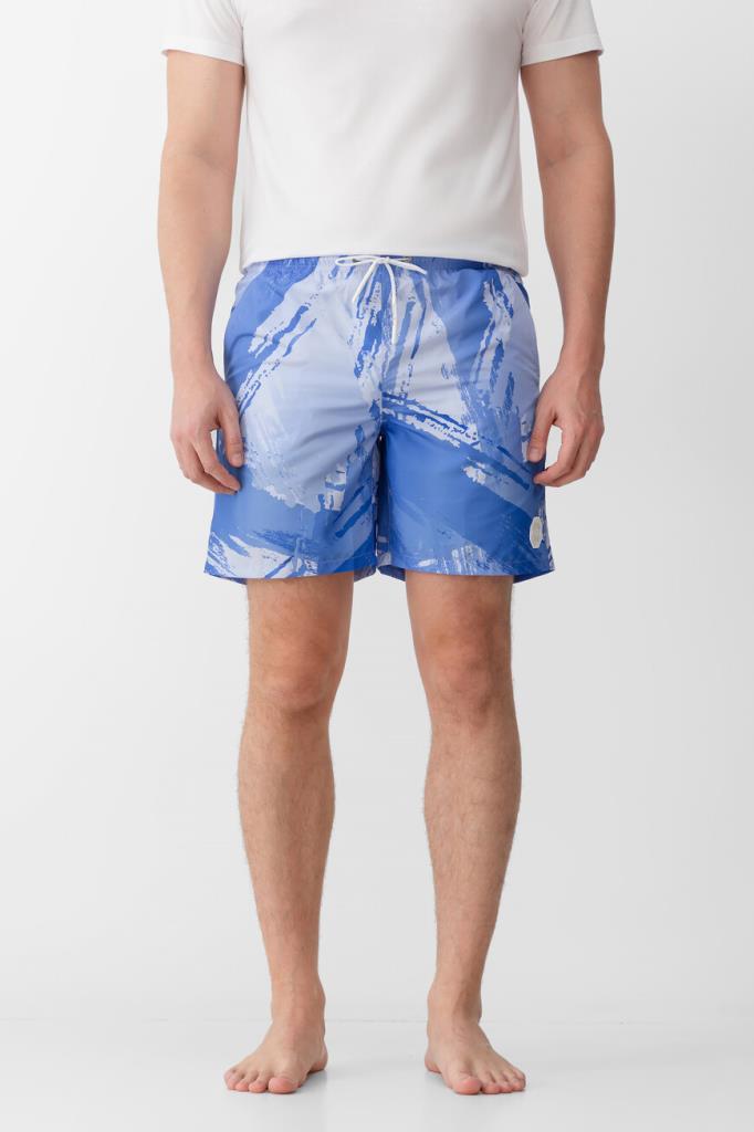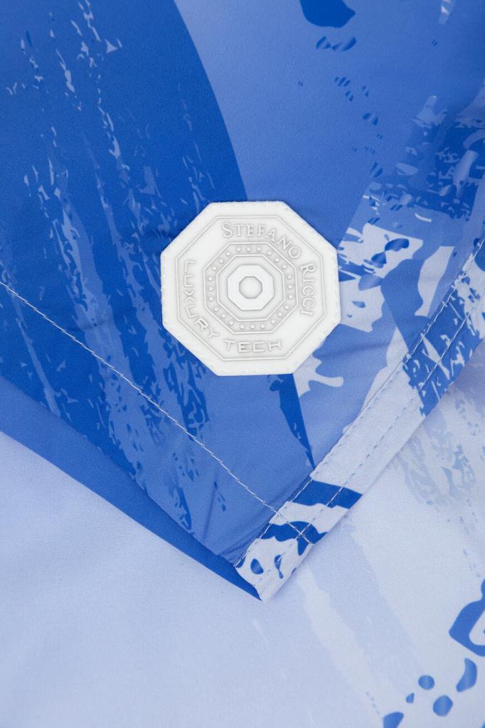 Принтованные плавки-шорты Stefano Ricci в синем и голубом тонах. Для производства модели с абстрактным геометрическим мотивом выбран лёгкий быстросохнущий полиэстер, устойчивый к солёной и хлорированной воде. Атрибутом Дома является крупная белая вставка-восьмигранник со знаковой символикой спереди. За оптимальную посадку изделия по фигуре отвечает широкий эластичный пояс на белых завязках.