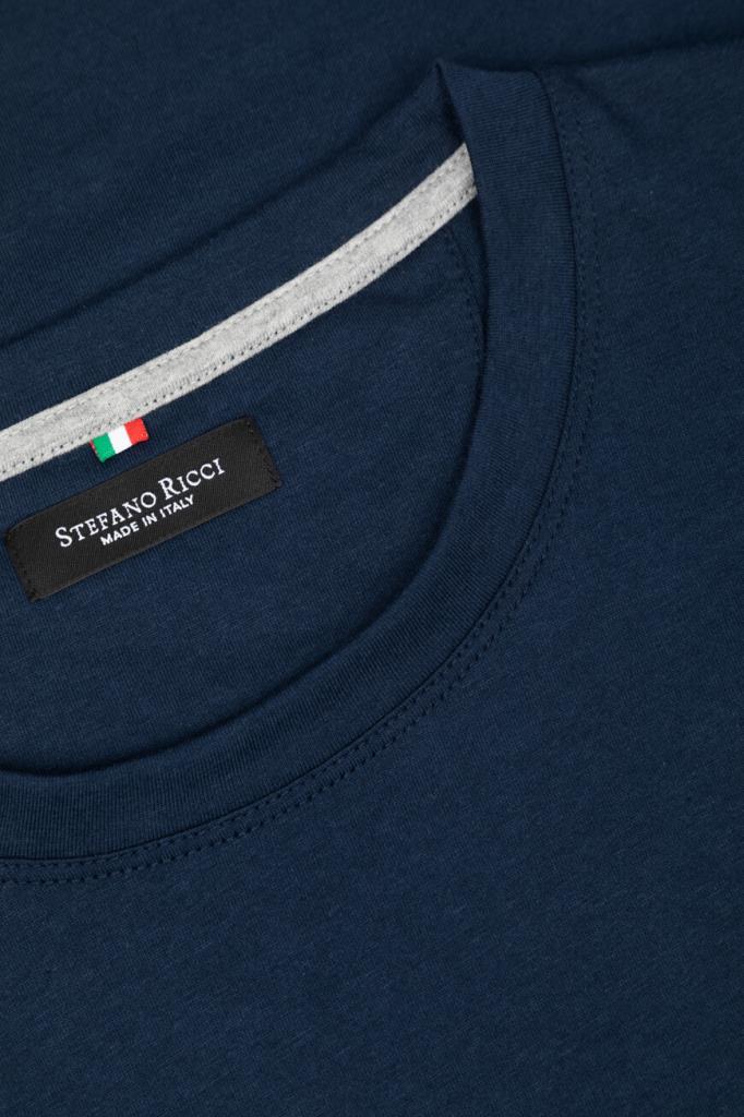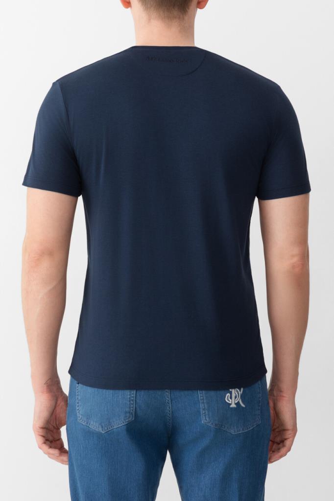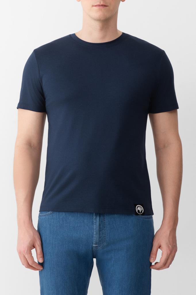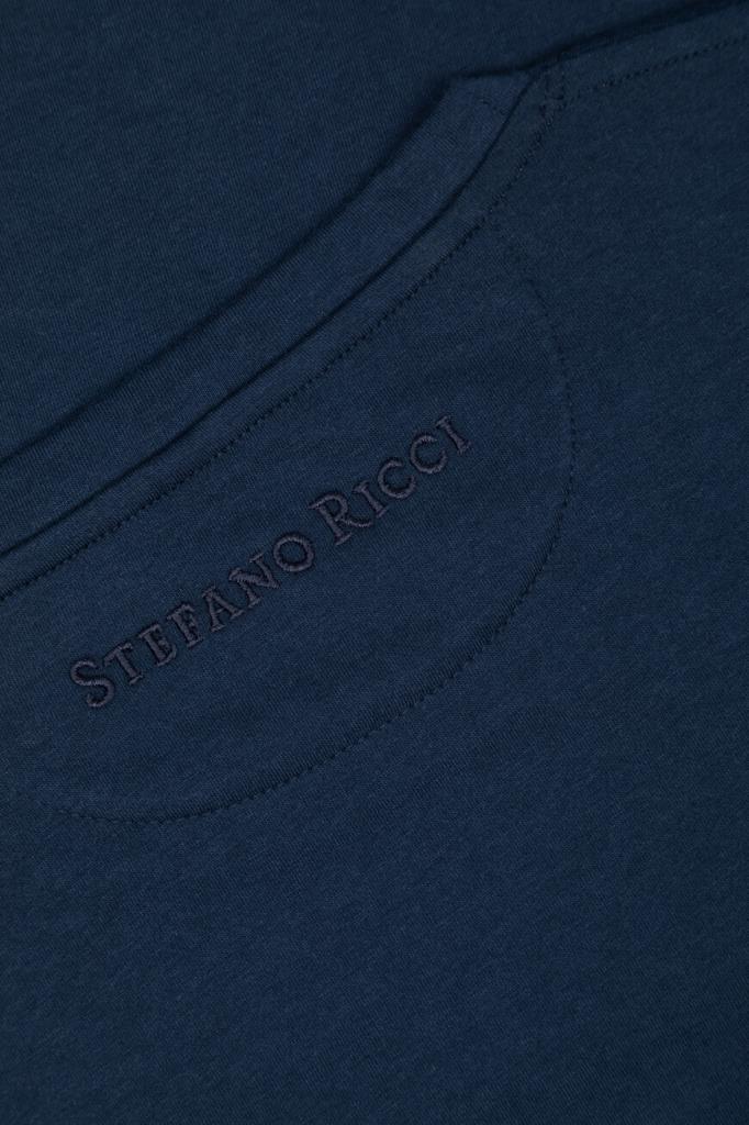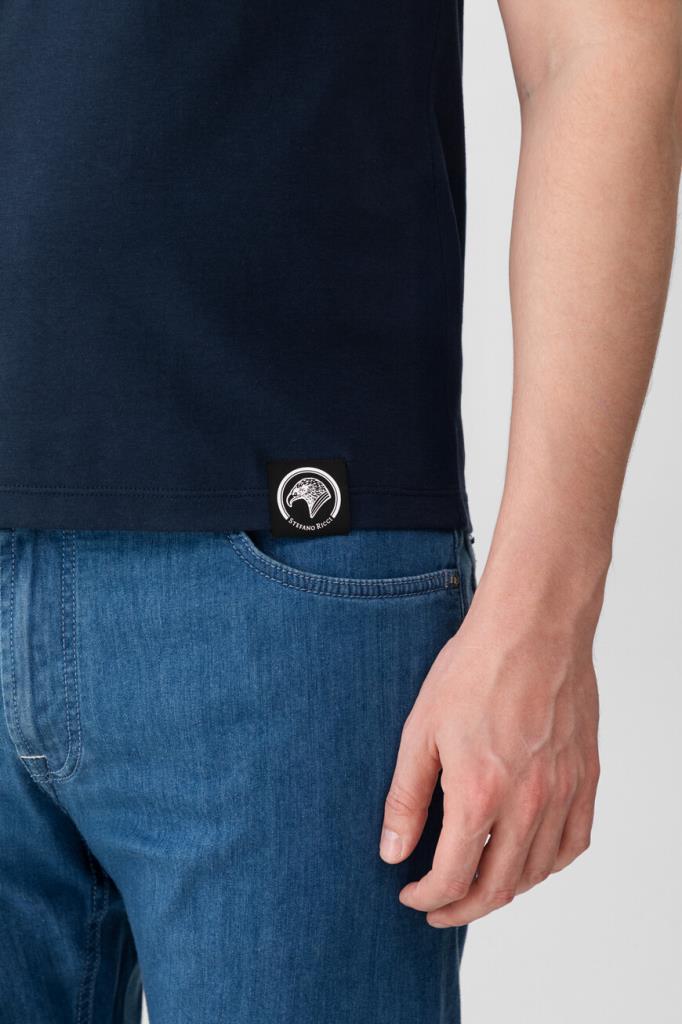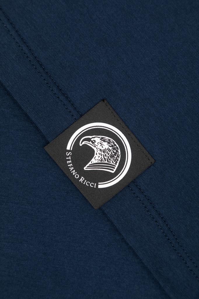Трикотажная футболка Stefano Ricci с неброской символикой Дома. Изделие прямого силуэта выполнено на основе хлопка и модала в глубоком тёмно-синем оттенке и дополнено круглым вырезом горловины на резинке. Спереди сбоку размещена чёрная вставка с контрастными логотипом и изображением головы орла.