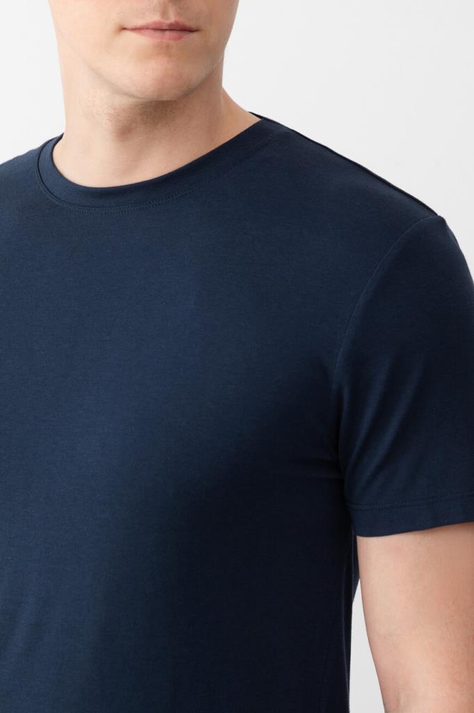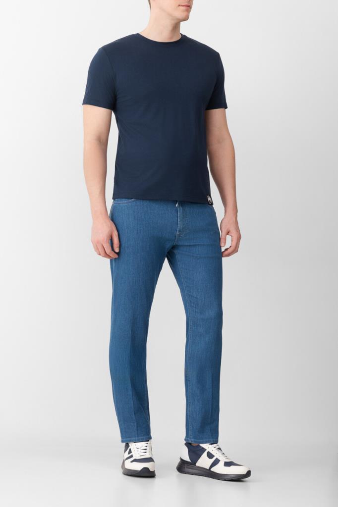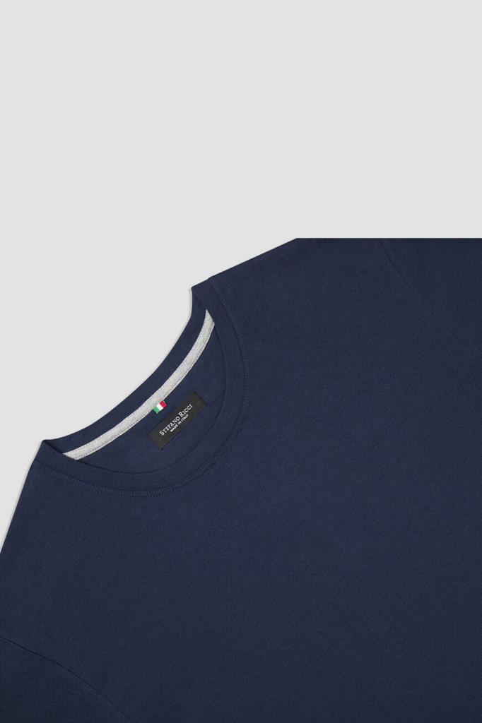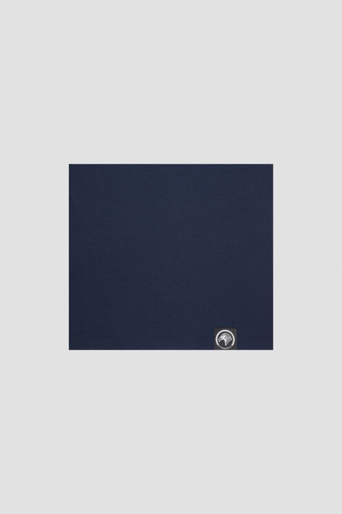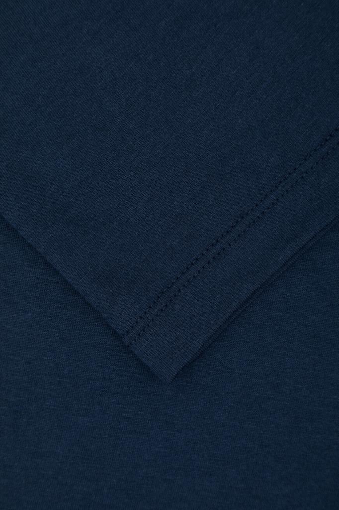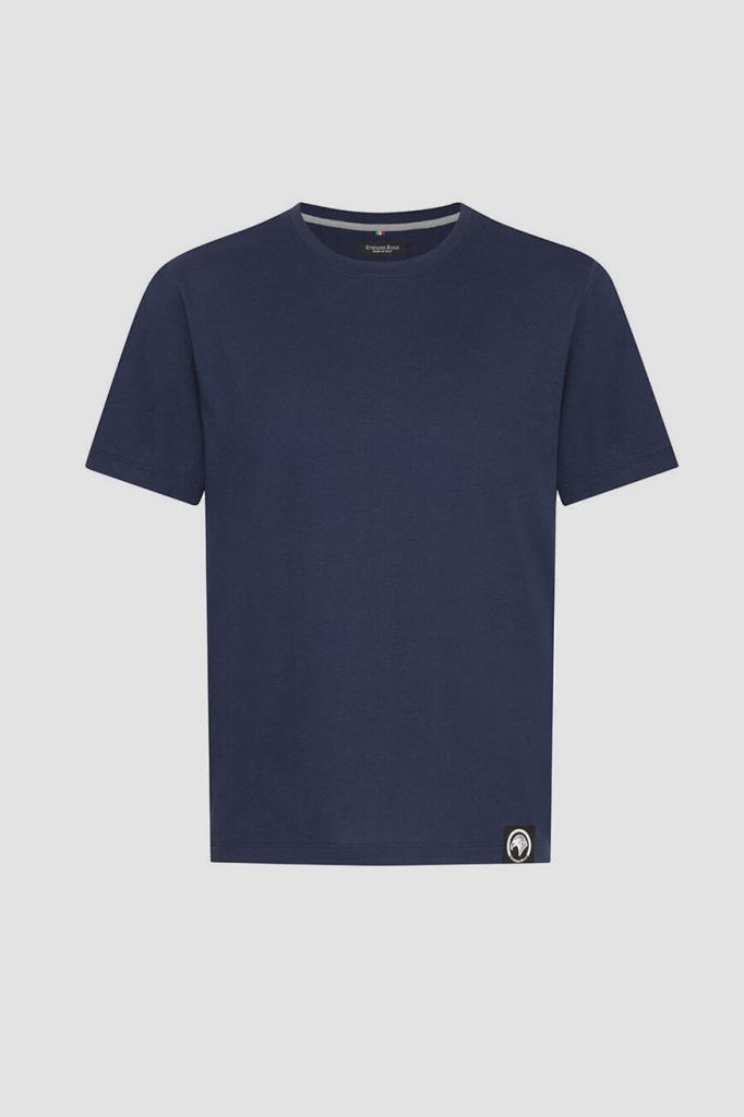 Трикотажная футболка Stefano Ricci с неброской символикой Дома. Изделие прямого силуэта выполнено на основе хлопка и модала в глубоком тёмно-синем оттенке и дополнено круглым вырезом горловины на резинке. Спереди сбоку размещена чёрная вставка с контрастными логотипом и изображением головы орла.