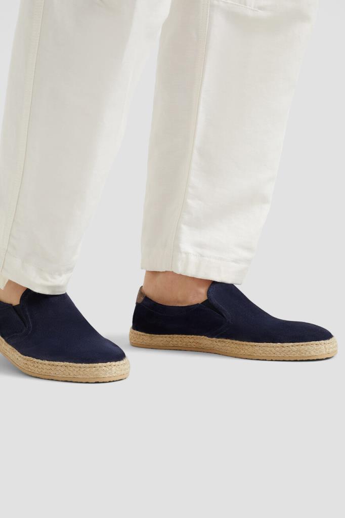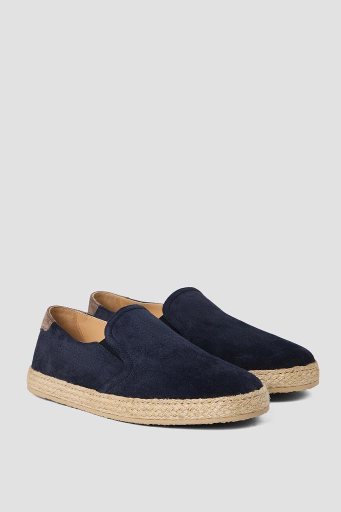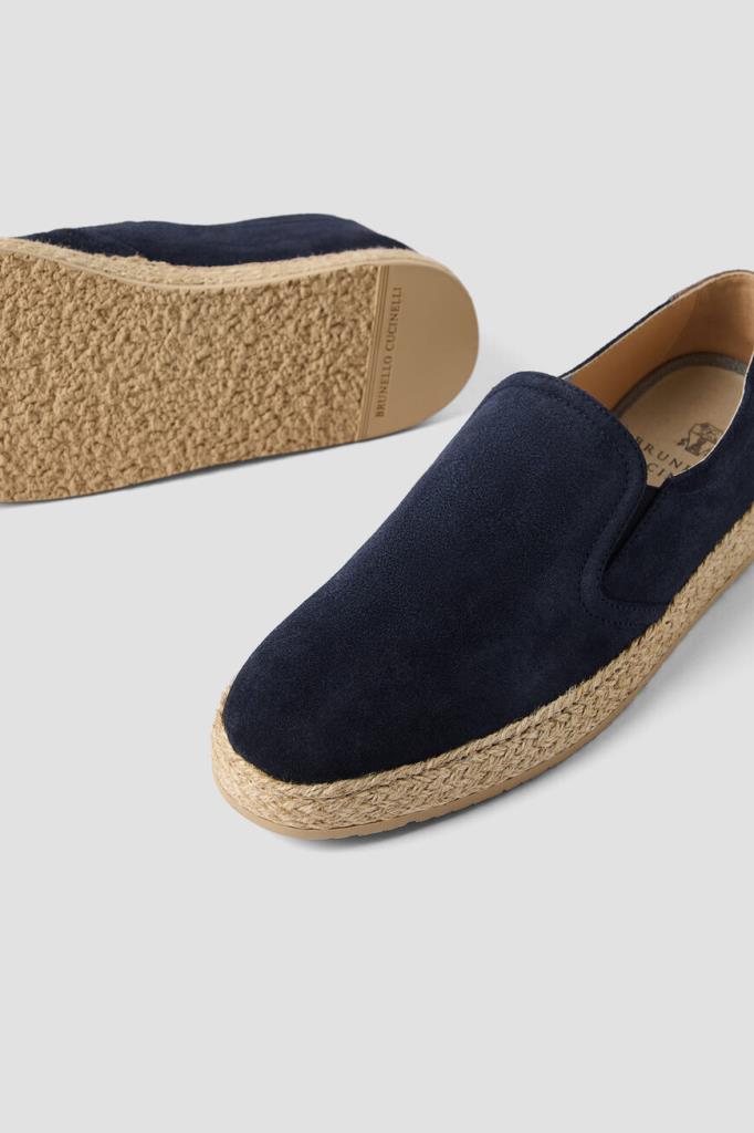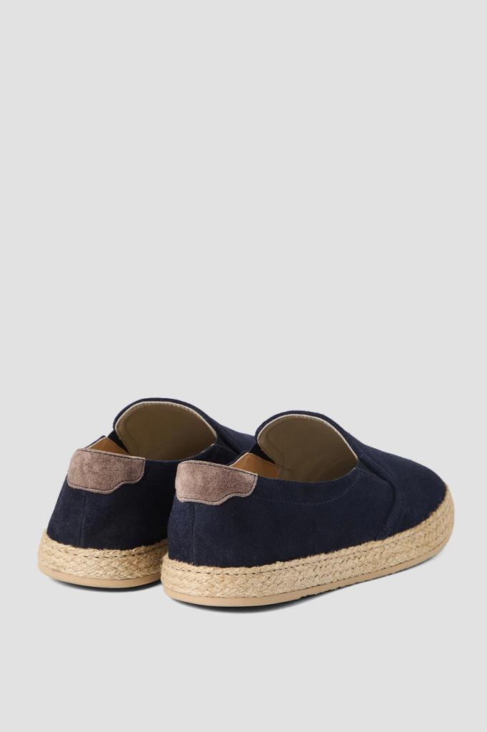 Слипоны Brunello Cucinelli впишутся в casual-образы любой степени сложности. Модель изготовлена из мягкой стираной замши тёмно-синего цвета без шнуровки. Отличительными особенностями изделия являются деталь тёмно-коричневого оттенка на заднике и плетёная светло-бежевая вставка из джута на подошве. Объединение материалов дополняет неформальный стиль удобной пары, напоминающей классические эспадрильи.