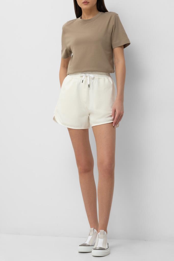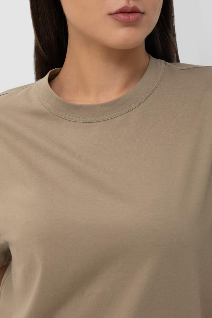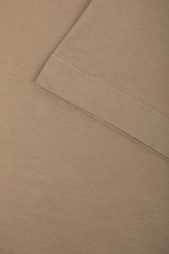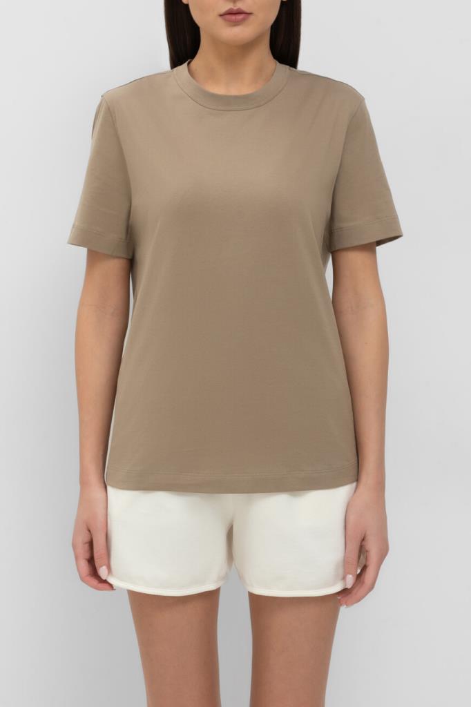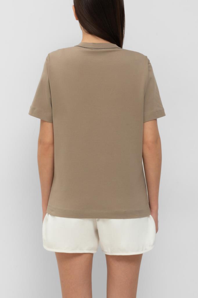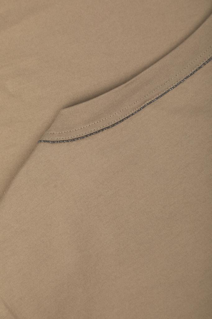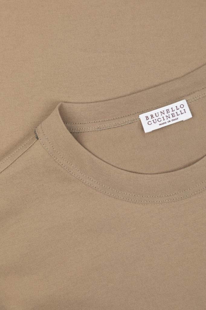 Прямая футболка BRUNELLO CUCINELLI с круглым вырезом горловины. Изделие сшито из мягкого хлопкового джерси бежевого оттенка и украшено декоративной цепочкой Мониль сзади вдоль нижнего края воротника. Однотонная модель из такой лёгкой и приятной на ощупь ткани идеально подойдёт для любого сезона.