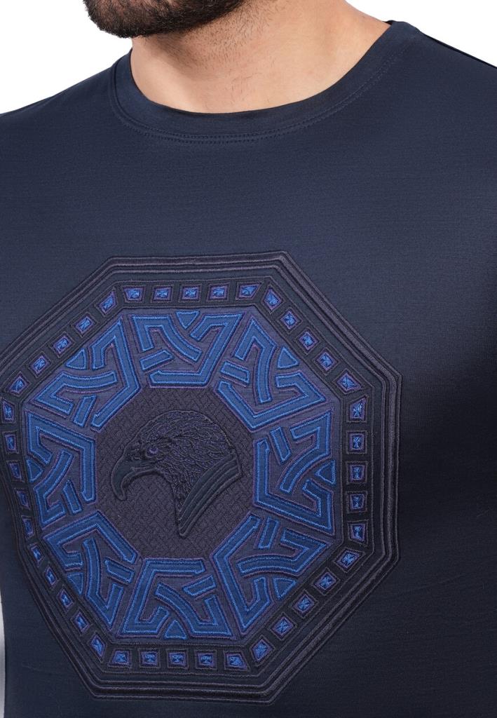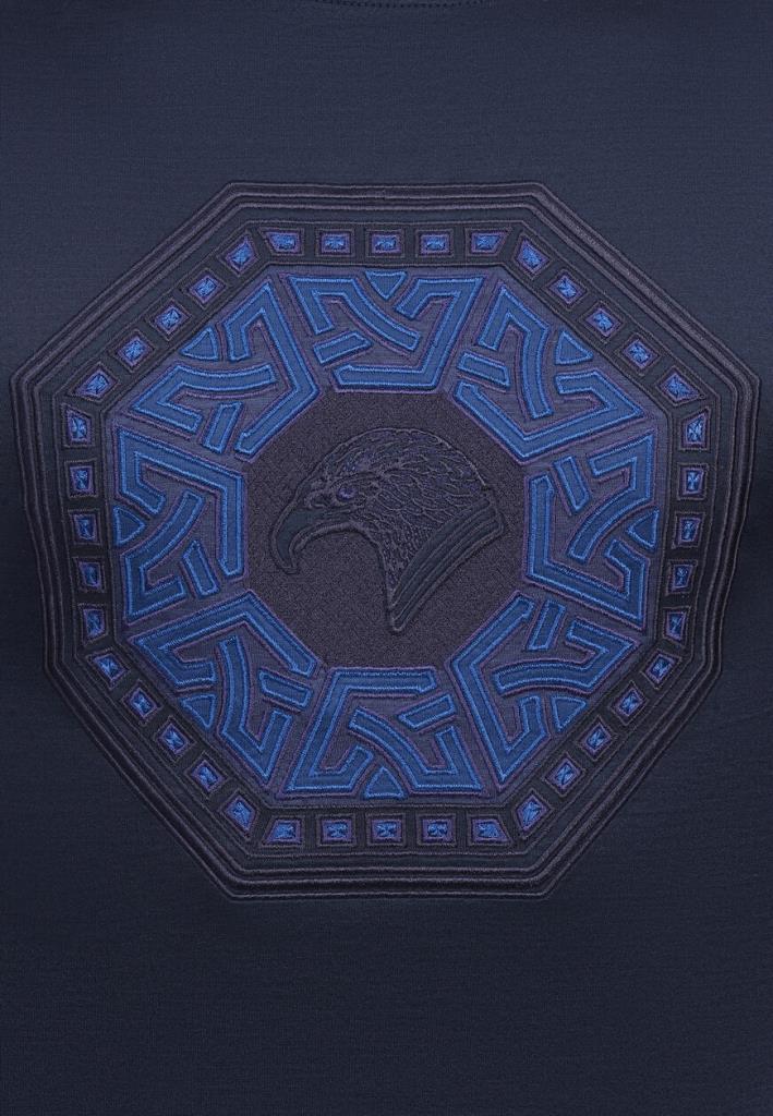 Футболка Stefano Ricci представляет собой изысканный микс современного дизайна и классического стиля. Насыщенный тёмно-синий цвет создаёт спокойный, но выразительный фон для центрального элемента дизайна – сложного геометрического узора, который окружает стилизованное изображение головы орла. Узор выполнен в глубоких синих и ярко-синих оттенках, создавая тонкий, но заметный контраст, который привлекает внимание и удерживает взгляд. Гладкость ткани и мастерская вышивка узора говорят о высоком качестве исполнения, которое является визитной карточкой бренда. Такая футболка несомненно дополнит образ современного мужчины, ценящего роскошь и уникальность.
