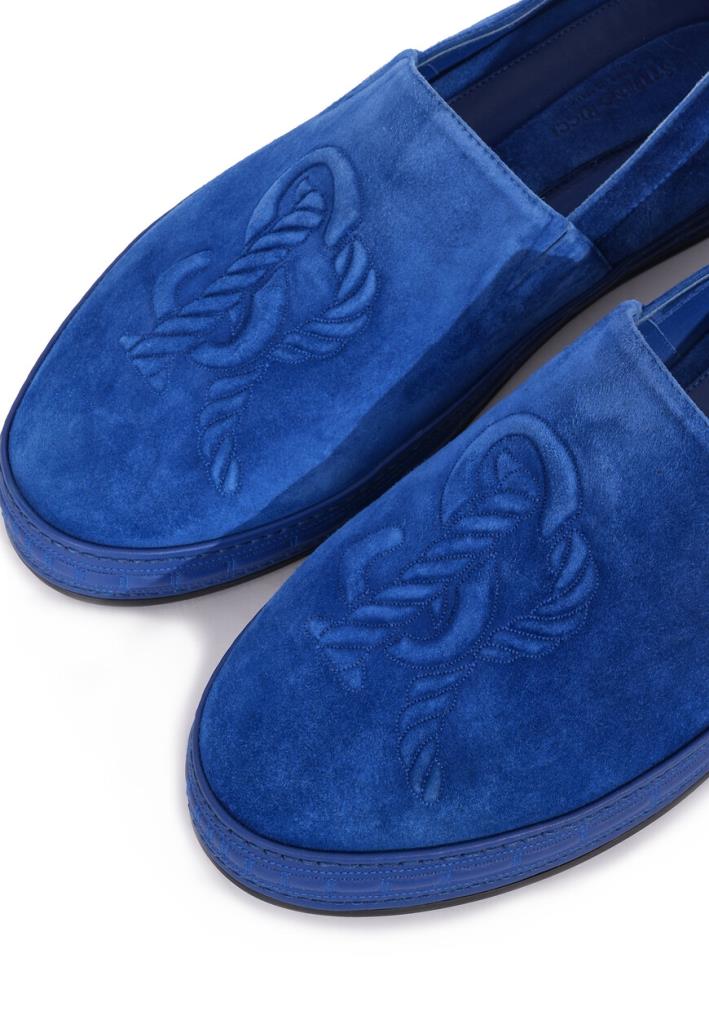 Слипоны синего цвета от Stefano Ricci – стильное сочетание утончённого дизайна и высокого качества исполнения. Верх выполнен из замши с мягкой бархатистой текстурой, обеспечивающей комфорт и изысканный внешний вид. Рельефная вышивка в виде знакового узора придаёт модели эксклюзивность и элегантность. Подошва изготовлена из лёгкой резины, декорированной рельефным рисунком, что подчёркивает премиальный стиль и гарантирует износостойкость. Боковые панели и задник выполнены с минималистичной строчкой, что обеспечивает изящную посадку. Внутренняя отделка из натуральной кожи обеспечивает высокий уровень комфорта и поддерживает оптимальный микроклимат для ног.