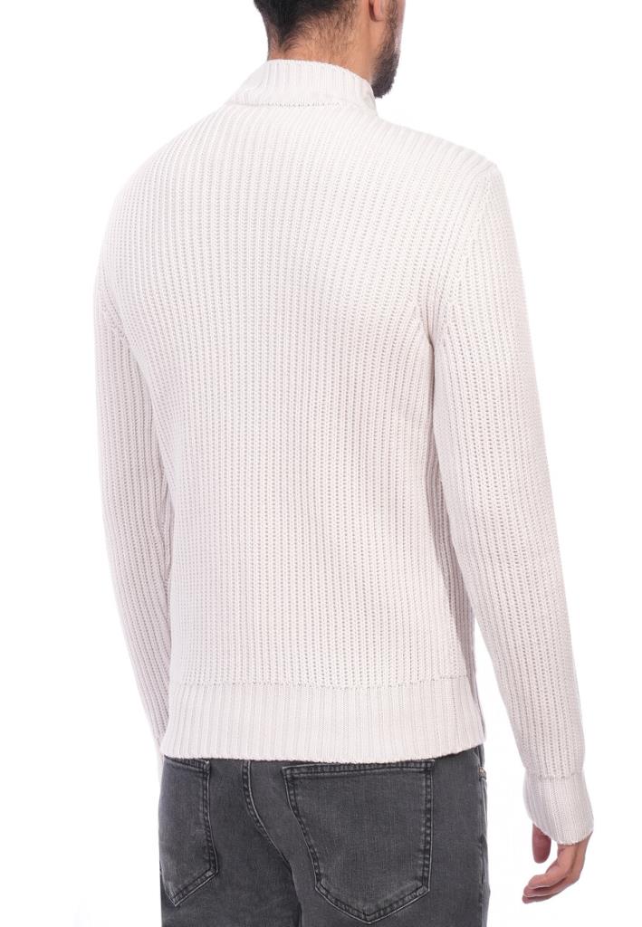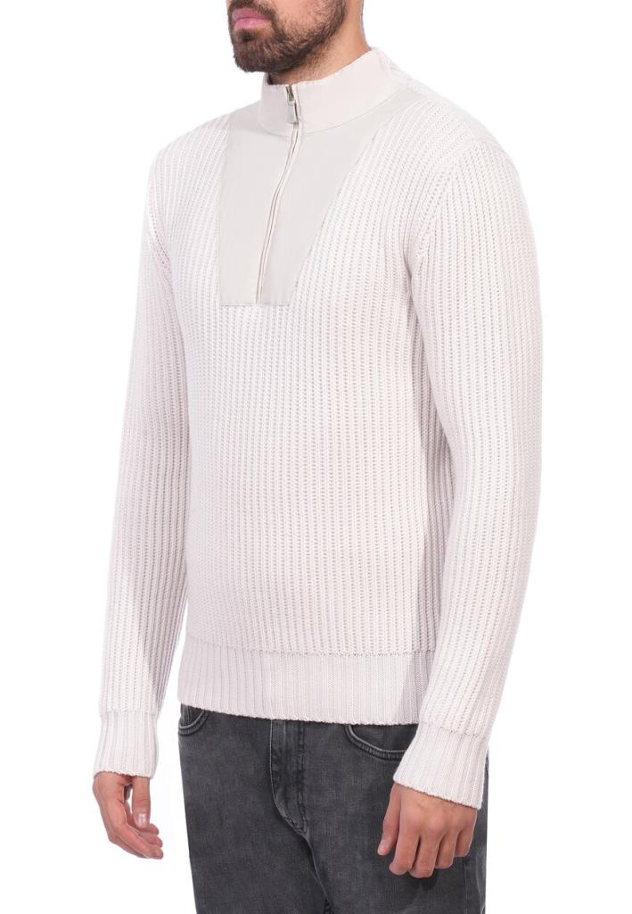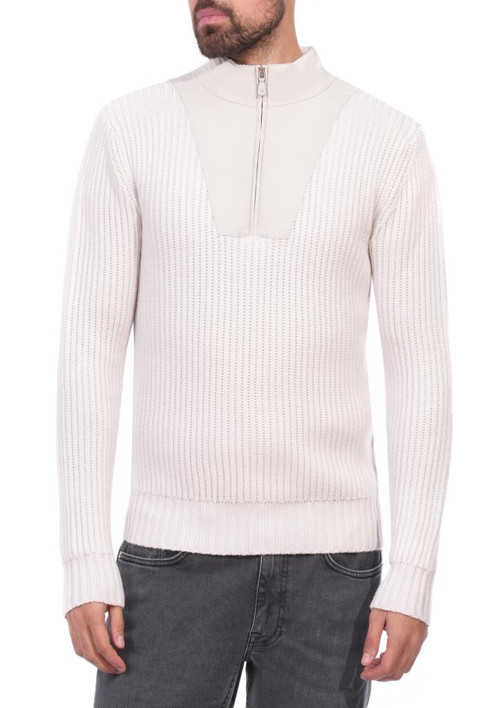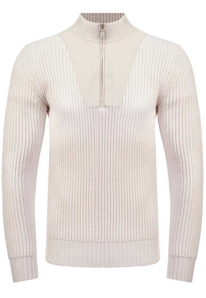 Пуловер Eleventy представляет собой изысканную комбинацию фактур и современного дизайна. Основное полотно выполнено из высококачественной пряжи с крупной вязкой в технике «английская резинка», что придаёт изделию объём и текстурный вид. Центральная вставка в зоне груди выполнена из гладкой ткани, создавая интересный контраст между текстурами и акцентируя внимание на изысканности кроя. Воротник-стойка на молнии добавляет пуловеру практичности и подчёркивает его универсальный стиль. Молния выполнена в тон изделию, с изящным бегунком, который дополняет общий лаконичный вид. Линия плеча тщательно обработана, обеспечивая идеальную посадку по фигуре. Рукава длинные, с манжетами из уплотнённой резинки, которые плотно прилегают к запястьям, предотвращая растяжение ткани. Низ пуловера также дополнен широкой резинкой, что сохраняет его форму и делает посадку более аккуратной. Нежный светлый оттенок придаёт пуловеру элегантность и универсальность, делая его подходящим как для повседневного, так и для полуформального образа. Пуловер идеально сочетается с узкими джинсами или классическими брюками для создания стильного повседневного образа. Для прохладной погоды дополните его пальто свободного кроя или лёгким пуховиком.