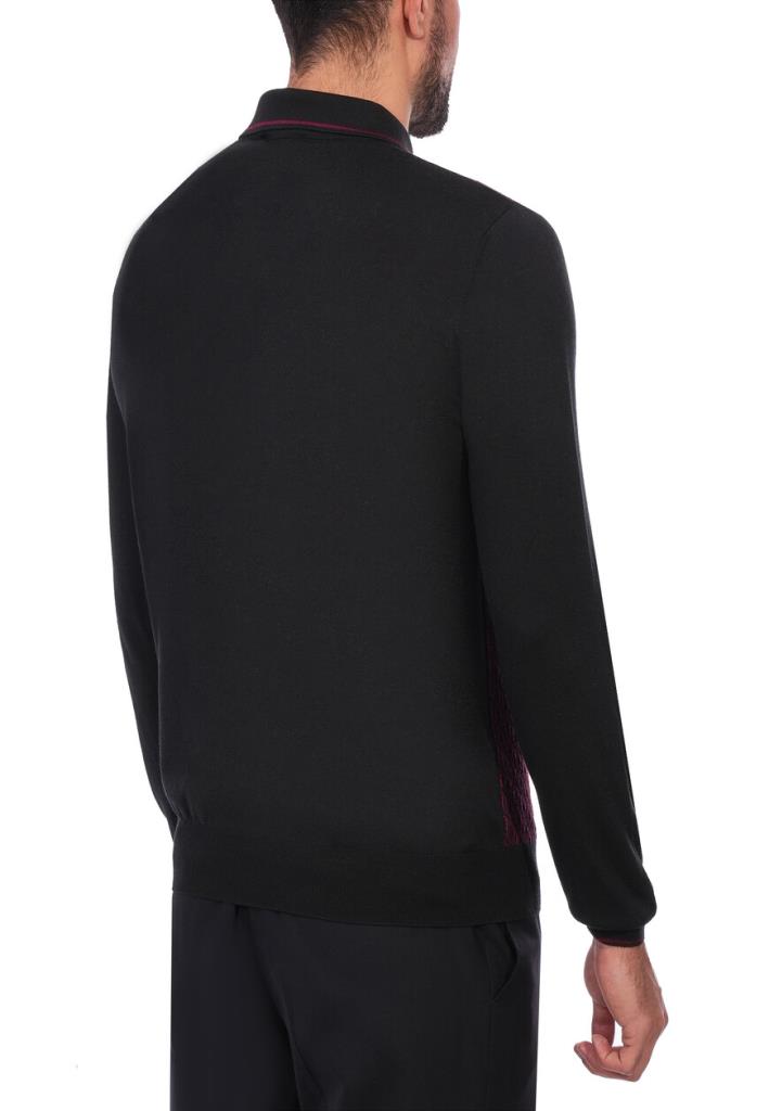 Черное поло от Mandelli выполнено из шерсти и шелка. Модель имеет прямой крой и классический силуэт. На передней части изделия расположен выразительный узор в бордовых тонах, который придаёт изделию яркий акцент. Контрастный отложной воротник с аккуратной молнией на груди подчеркивает стиль и элегантность. Длинные рукава выполнены в однотонном черном цвете и обеспечивают комфортное прилегание.