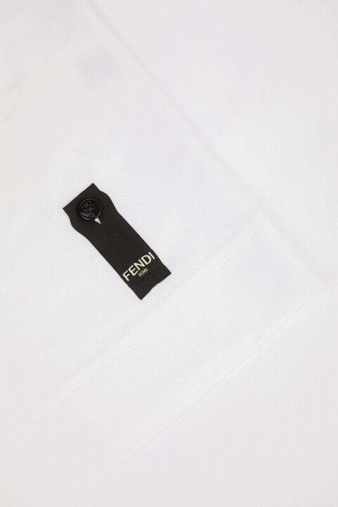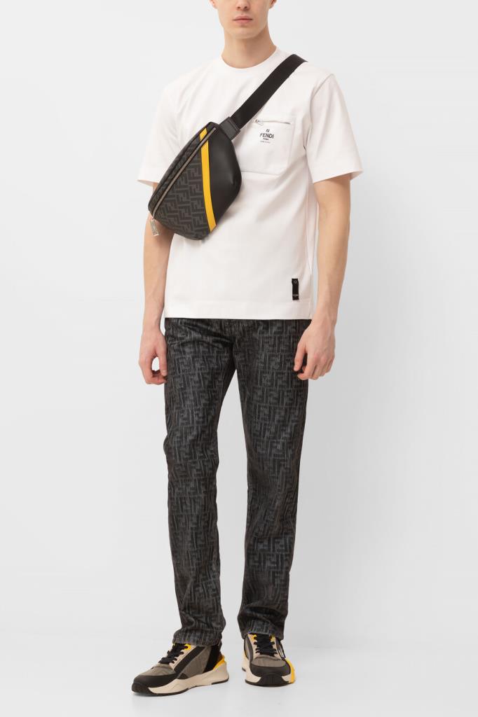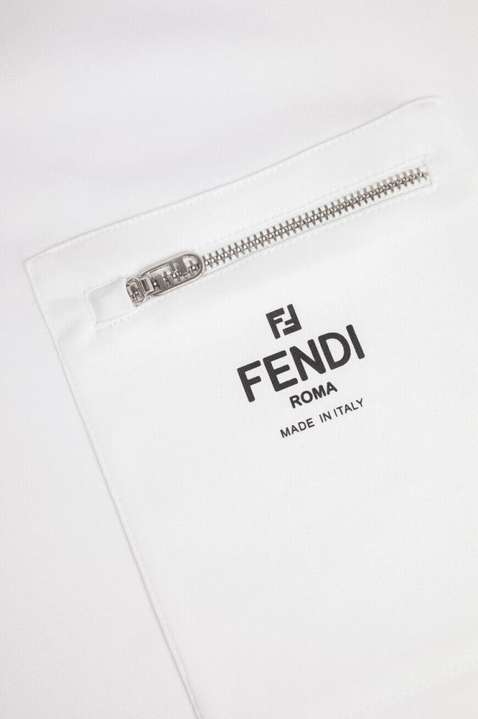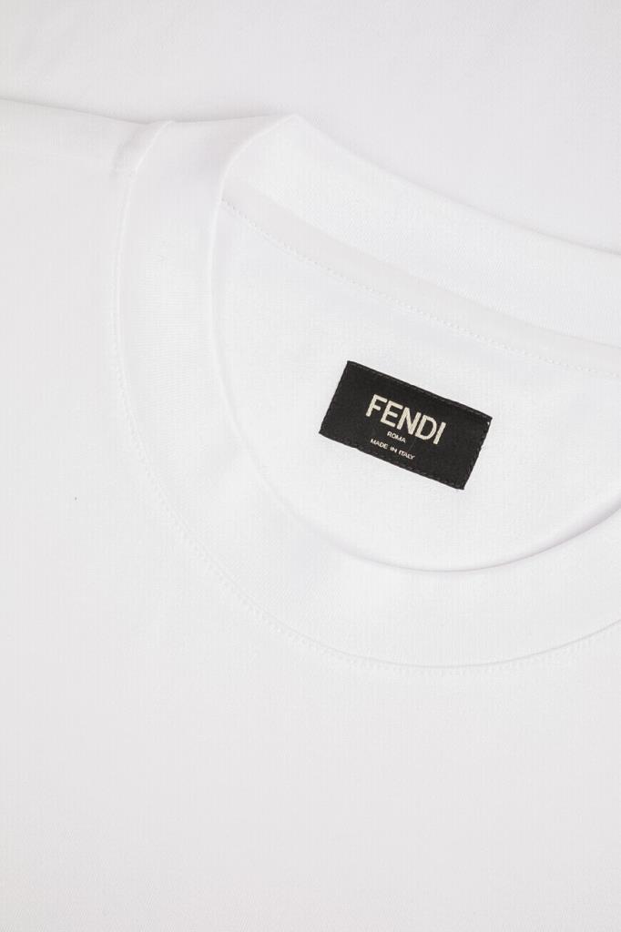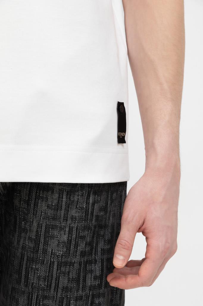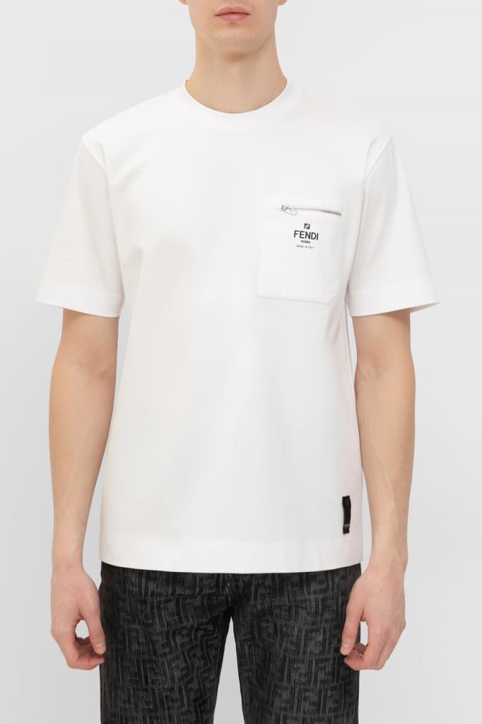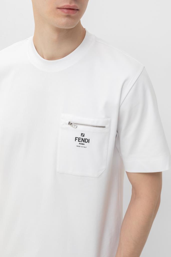 Белая футболка Fendi с нагрудным накладным карманом слева. Для пошива повседневной модели используется мягкий хлопковый трикотаж. Фасон изделия предполагает крой оверсайз и круглый вырез горловины. На принадлежность футболки Дому указывают контрастные надпись «Fendi Roma» и культовая аббревиатура «FF».