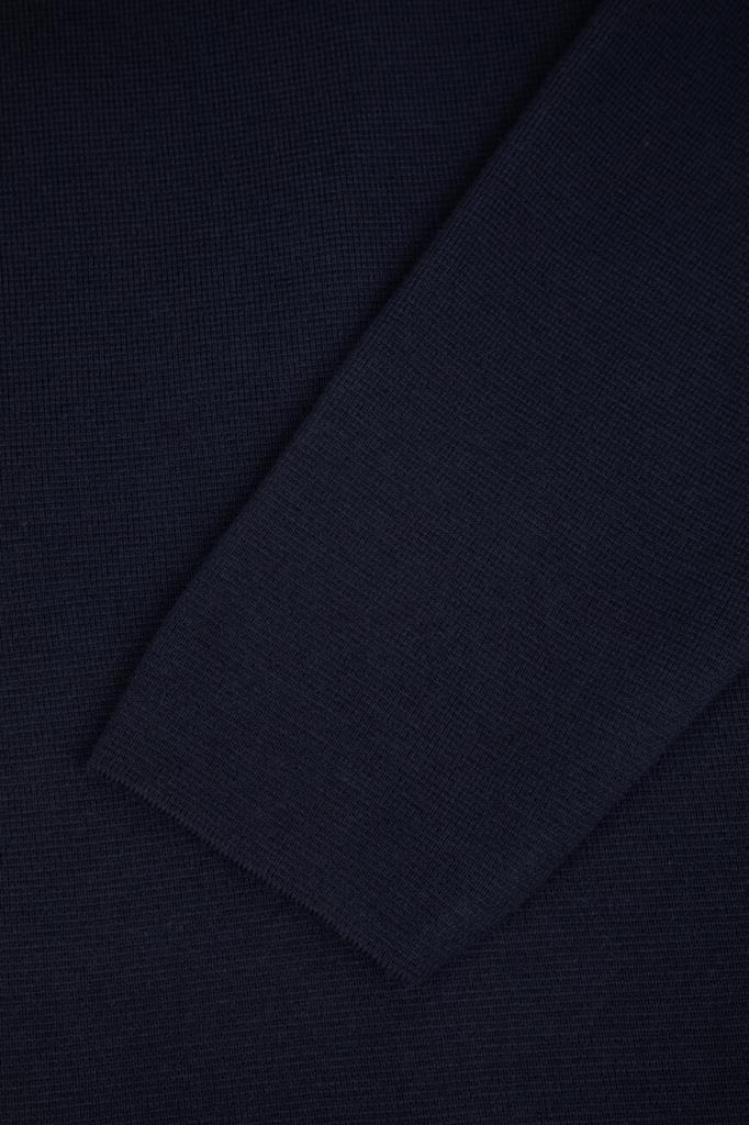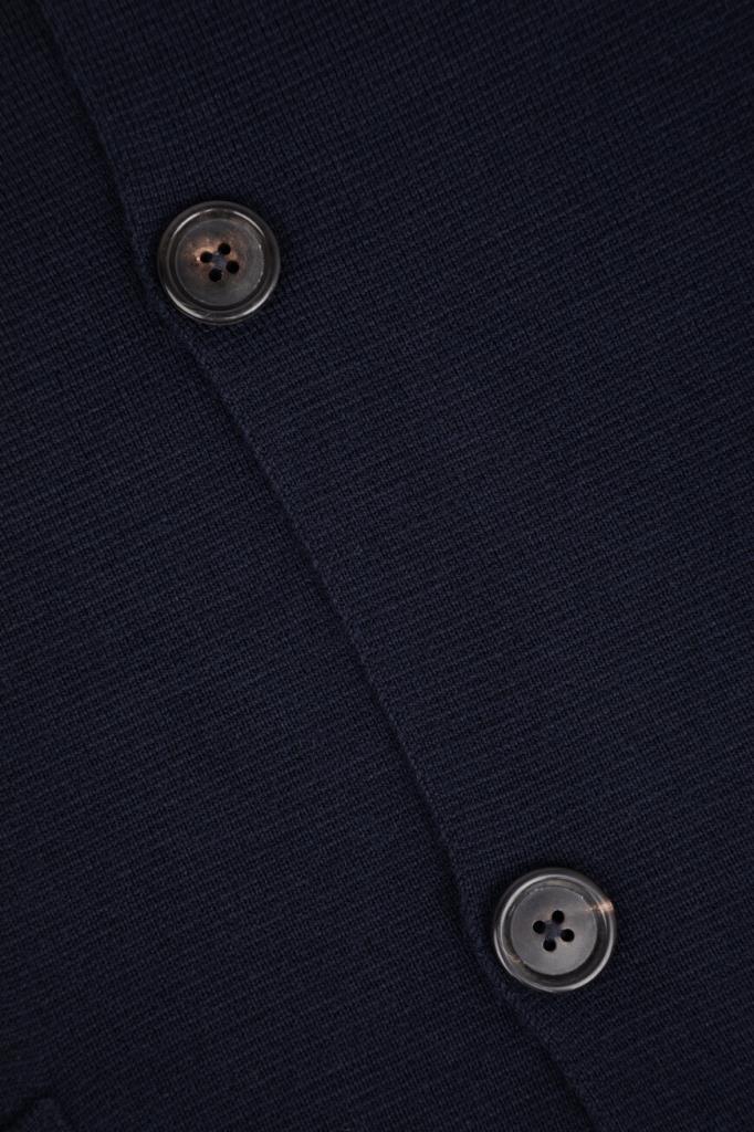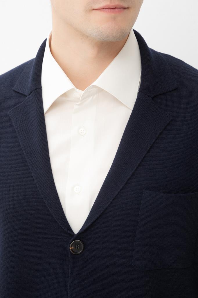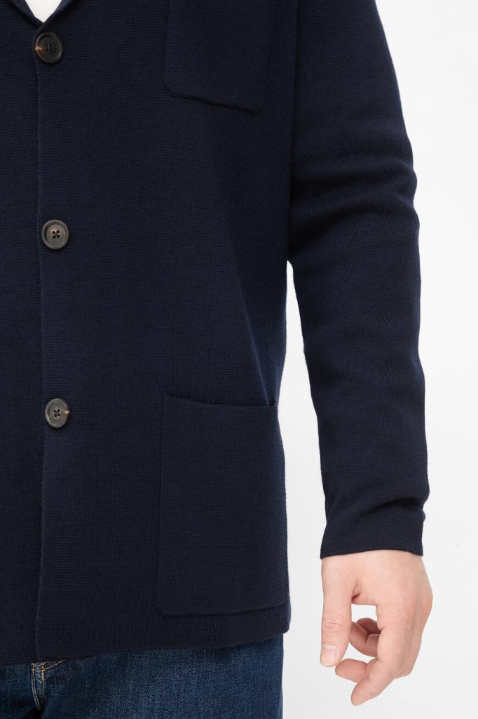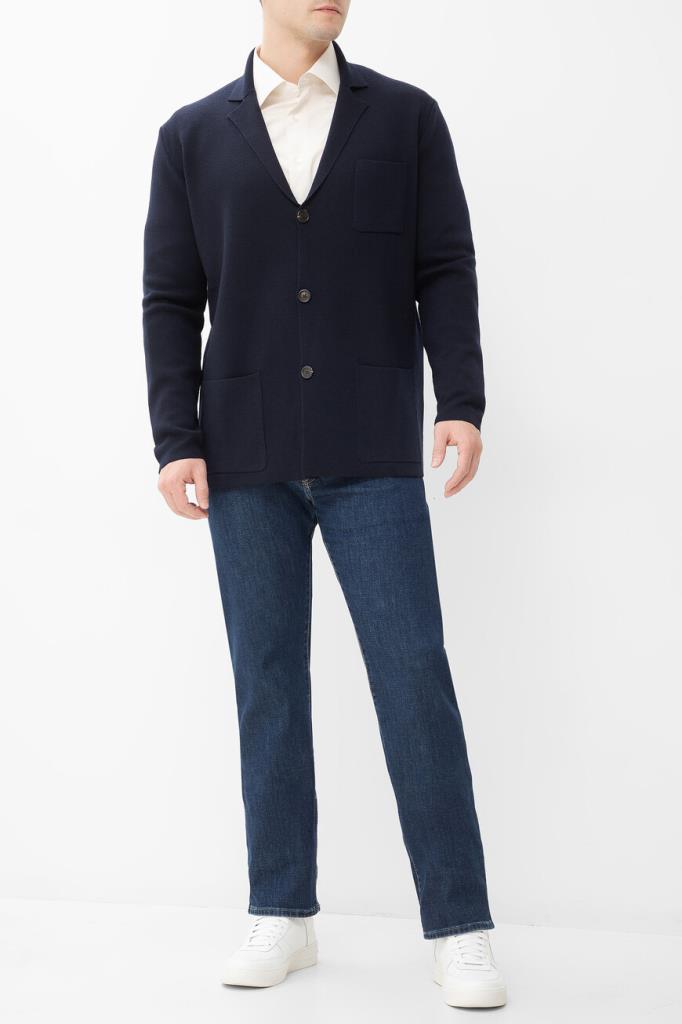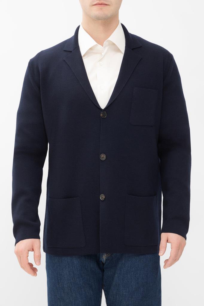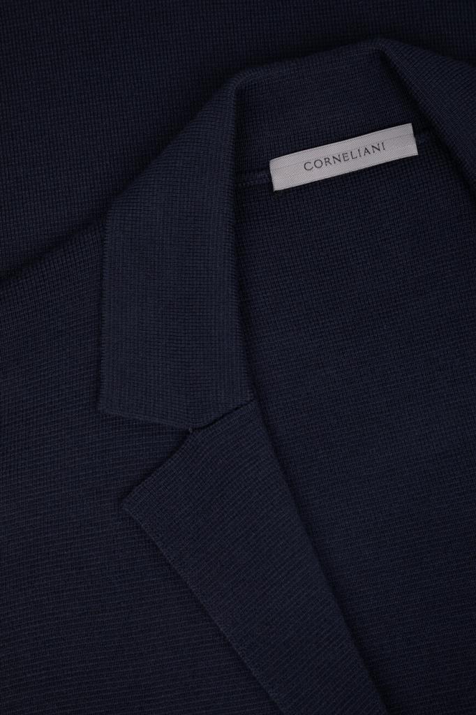 Шерстяной пиджак Corneliani с узкими лацканами. Однобортная модель тёмно-синего цвета выполнена без подкладки и дополнена тремя накладными карманами. Изделие с фактурным геометрическим узором в тон составит комфортный образ smart casual в комплекте с рубашкой или тонким трикотажем и заменит кардиган в образе с джинсами и кедами.
