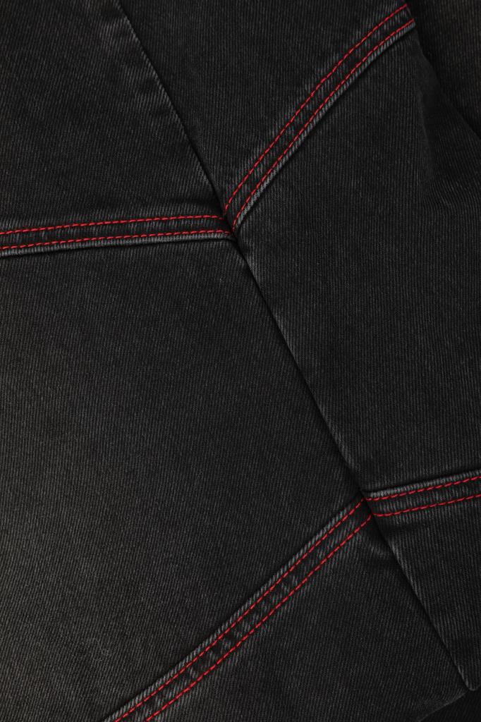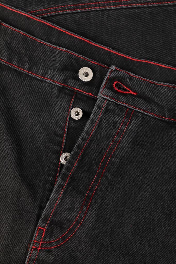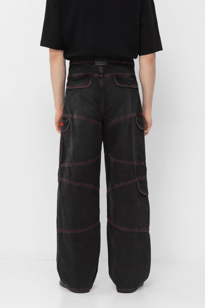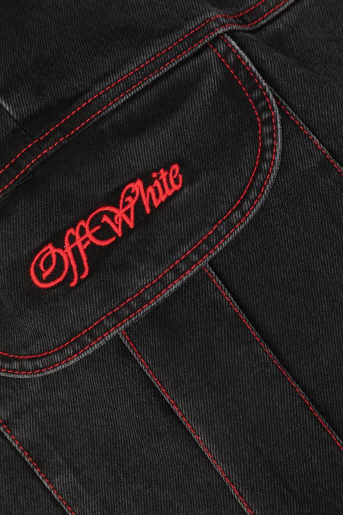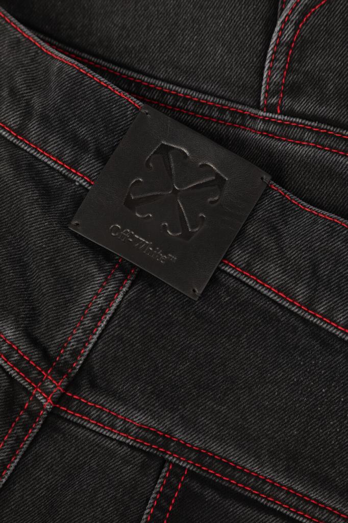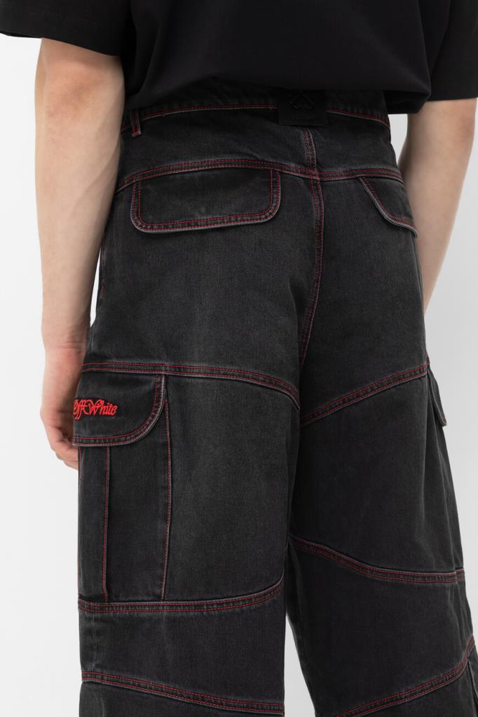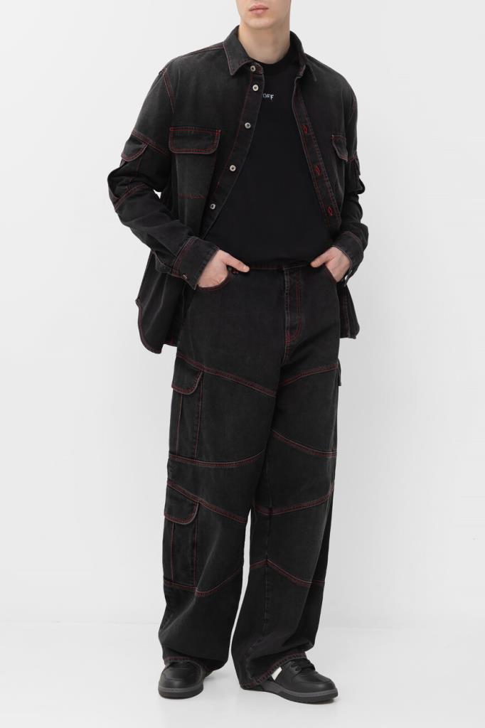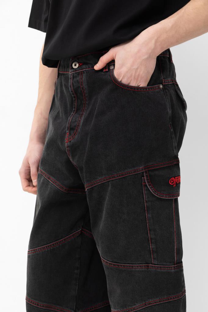 Джинсы Off-White с эффектом делаве и ярко-красной прострочкой на швах. Изделие, выполненное из мягкого хлопкового денима, отличается прямым кроем и наличием восьми карманов: двух прорезных по бокам, дополнительного накладного кармана спереди справа, трёх крупных накладных карго с клапанами чуть ниже по бокам и прорезных карманов с клапанами сзади. Создайте органичный тотал-деним образ с рубашкой на металлических пуговицах из той же коллекции.