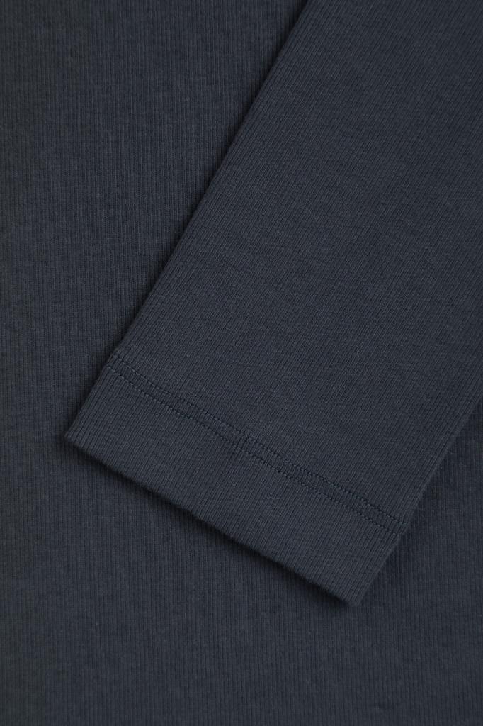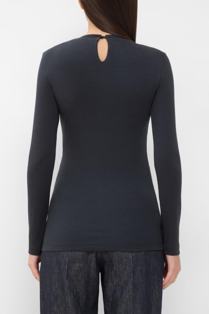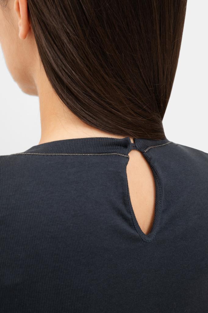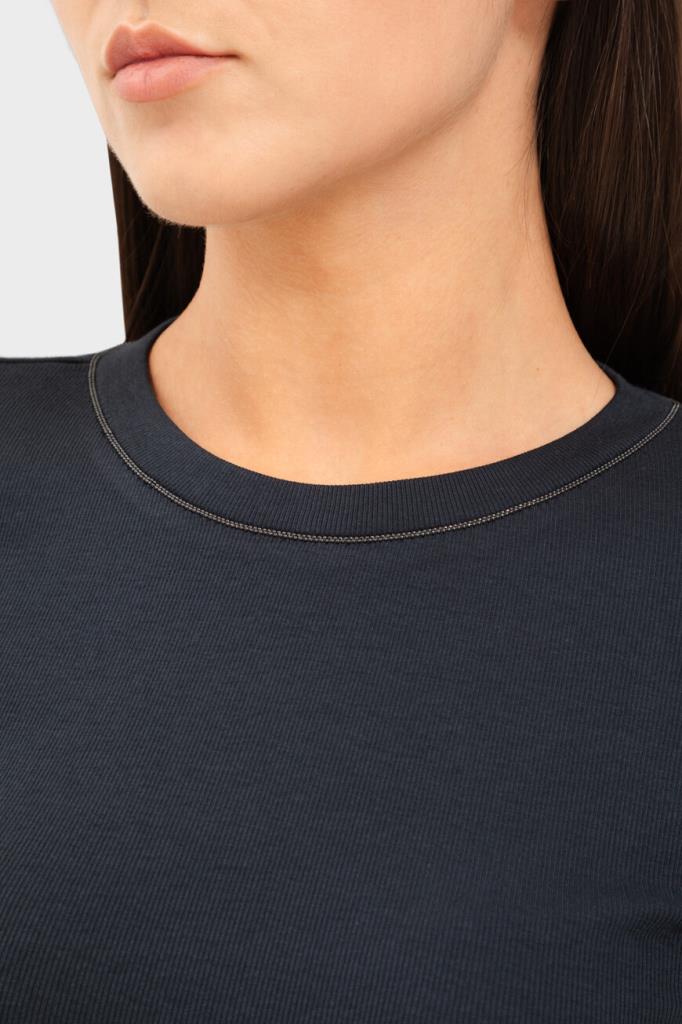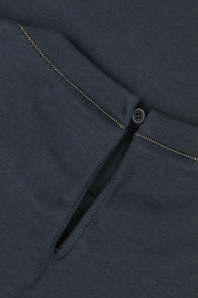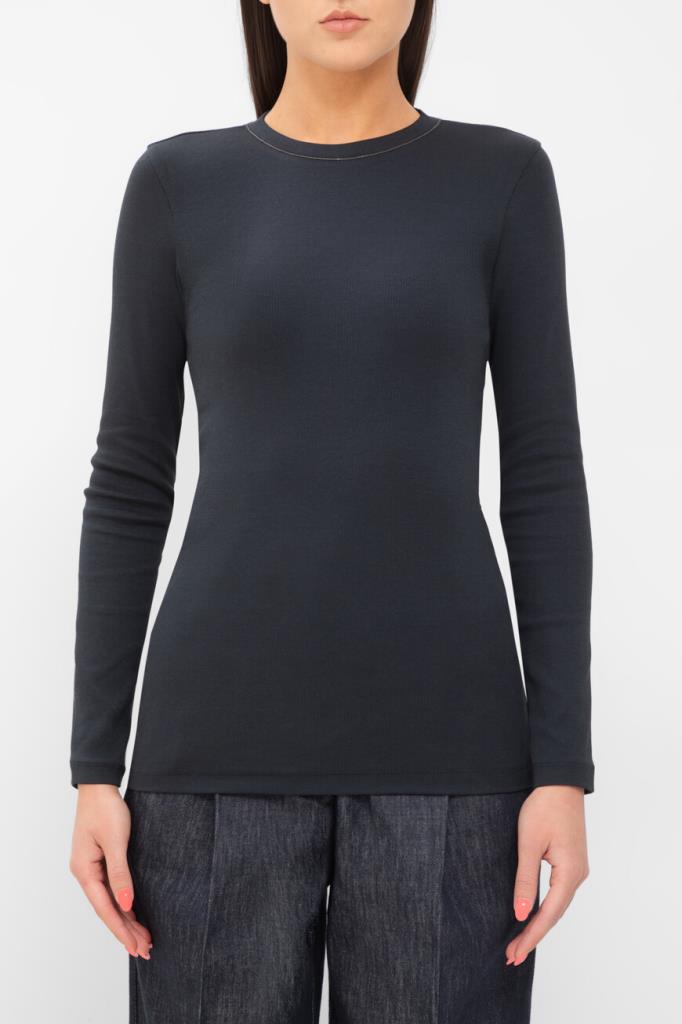 Лонгслив BRUNELLO CUCINELLI - это универсальный предмет женского гардероба. Для пошива облегающей модели выбран эластичный хлопковый трикотаж тёмно-синего цвета с ребристой текстурой. Отличительными деталями стали изящный вырез «капля» с застёжкой на роговую пуговицу сзади и вышивка из тонких рядов блестящей серебристой цепочки Мониль вдоль нижнего края воротника.