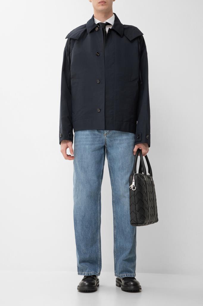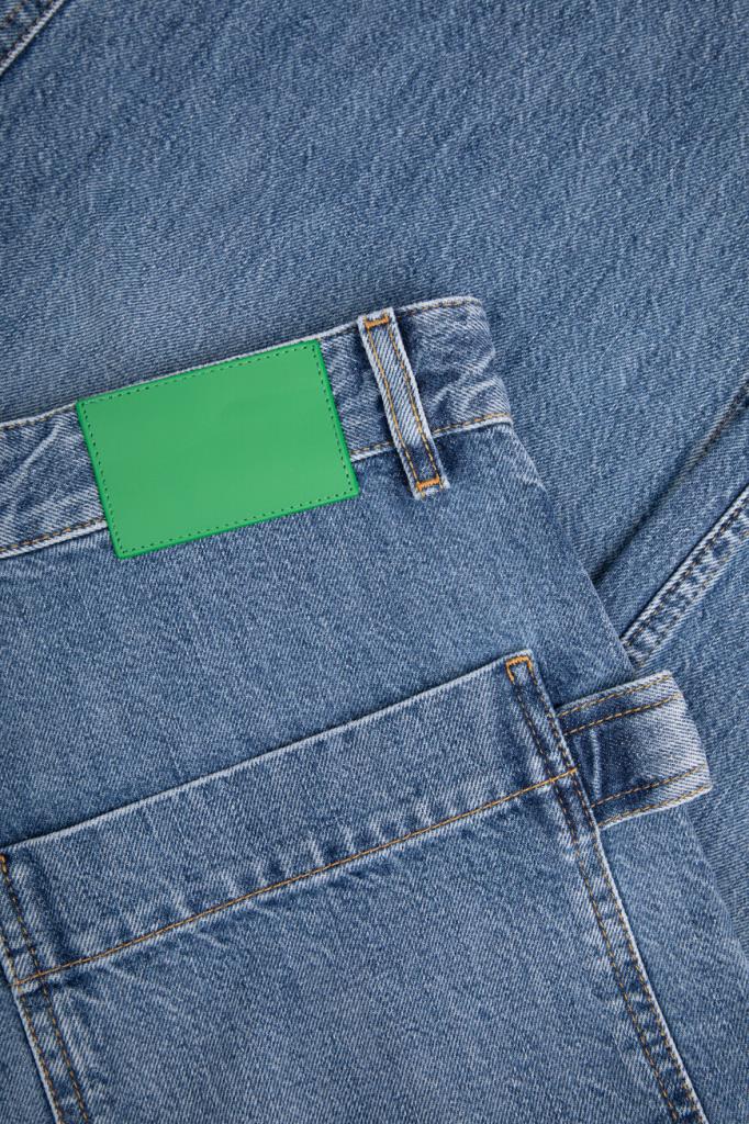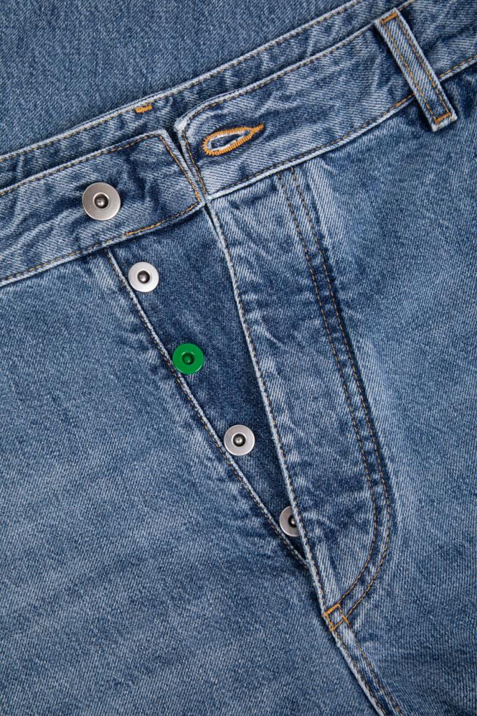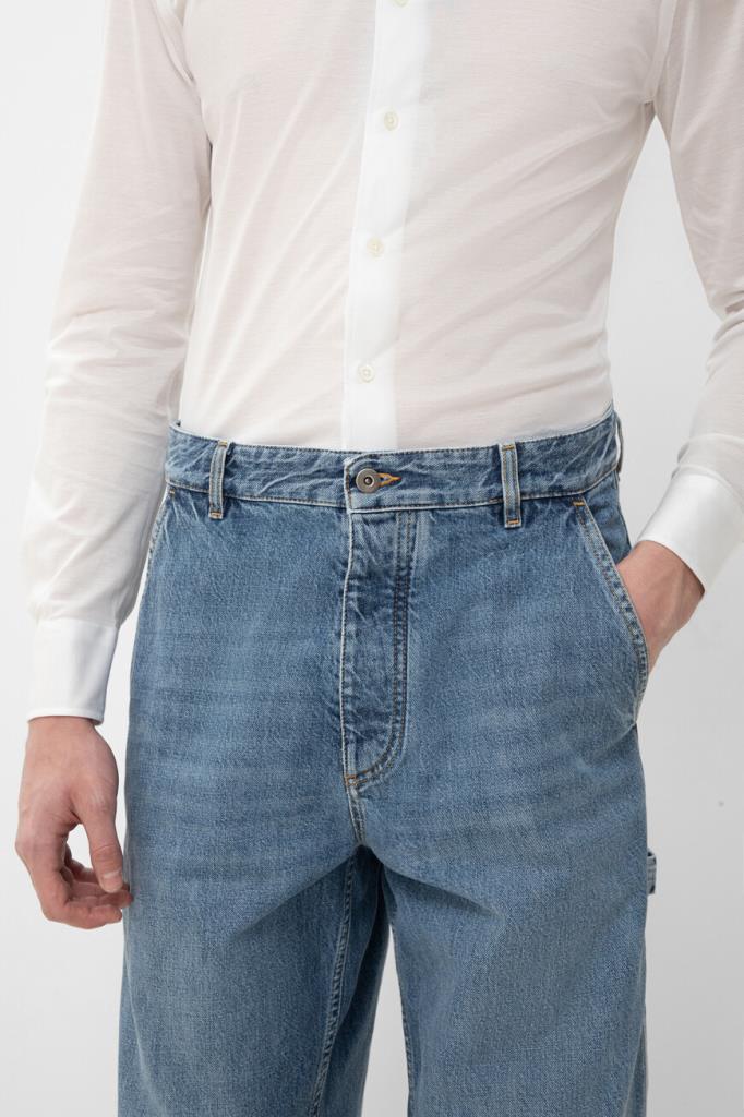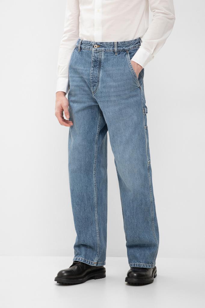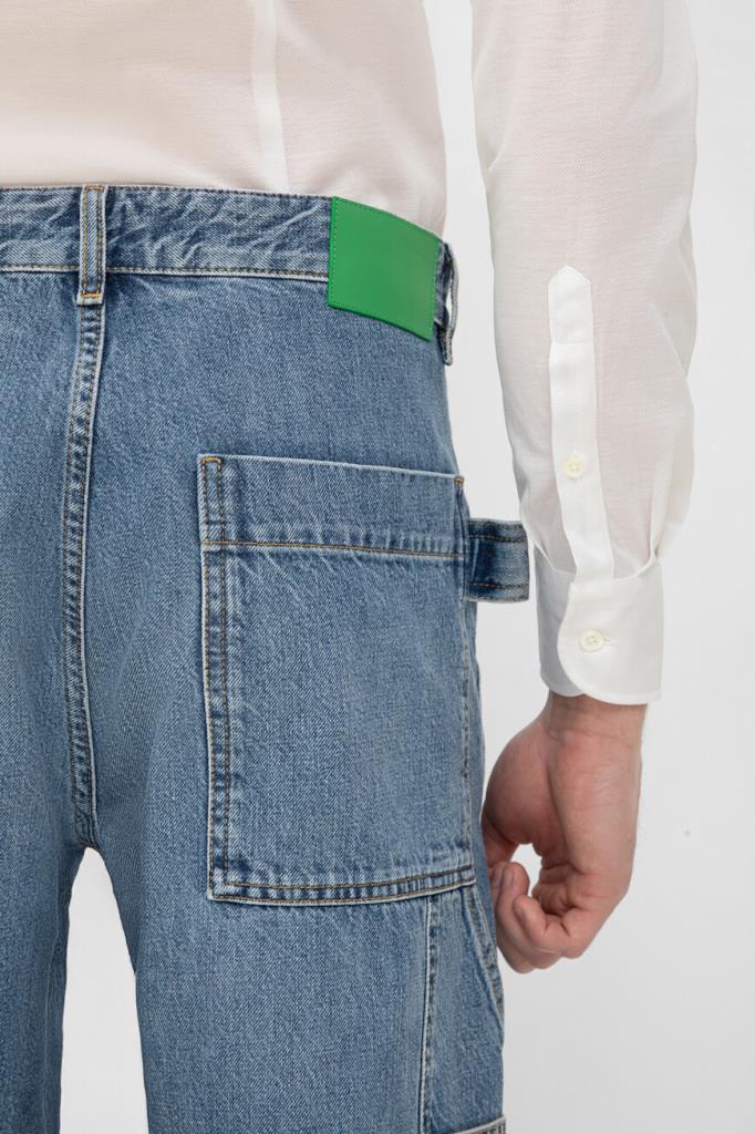 Джинсы карго прямого силуэта от BOTTEGA VENETA. Для пошива модели синего цвета выбран мягкий хлопковый деним с выбеленным эффектом. Изделие с семью карманами декорировано зелёной кожаной нашивкой на поясе сзади и дополнено оранжевой прострочкой на швах. Джинсы можно сочетать с винтажной рубашкой с длинным рукавом из той же коллекции Дома.