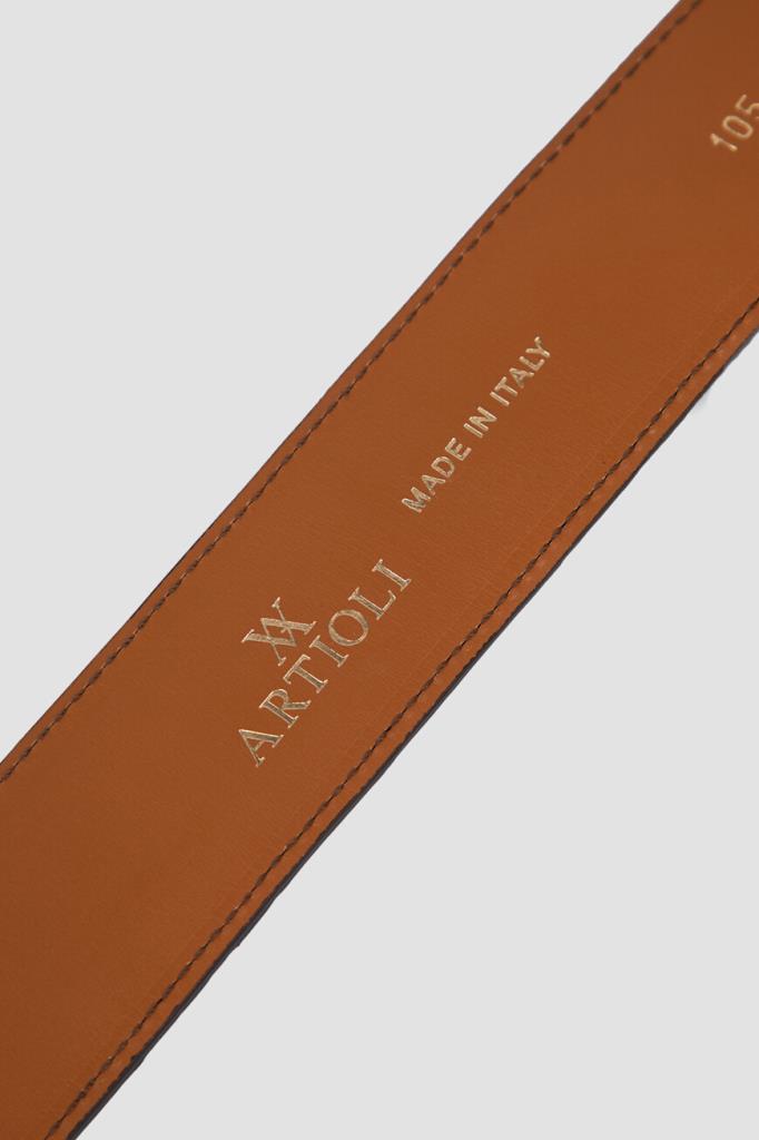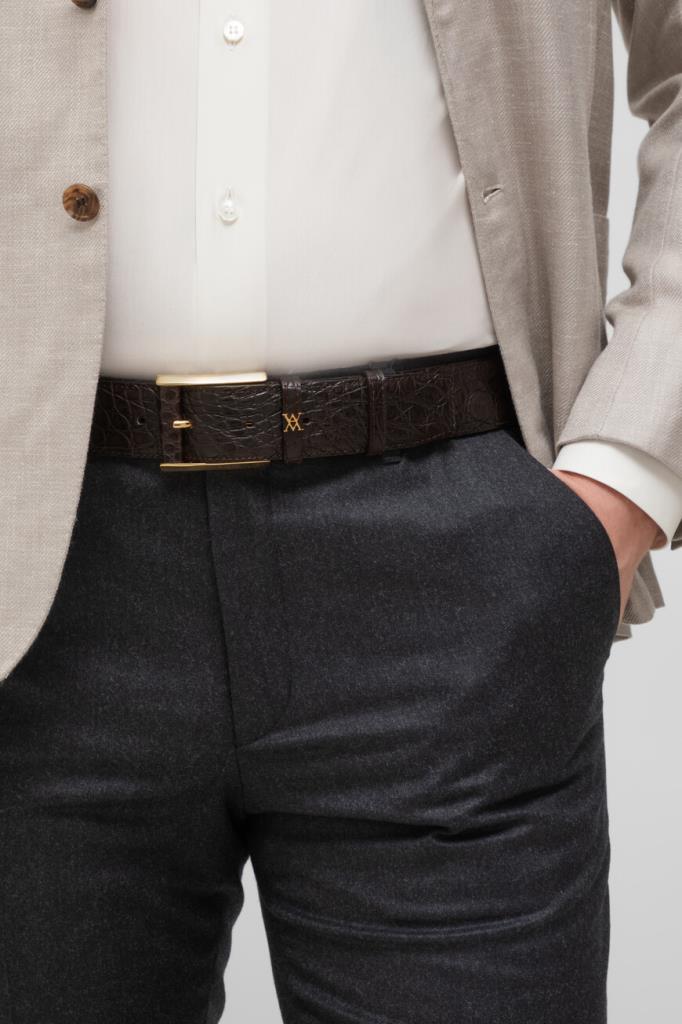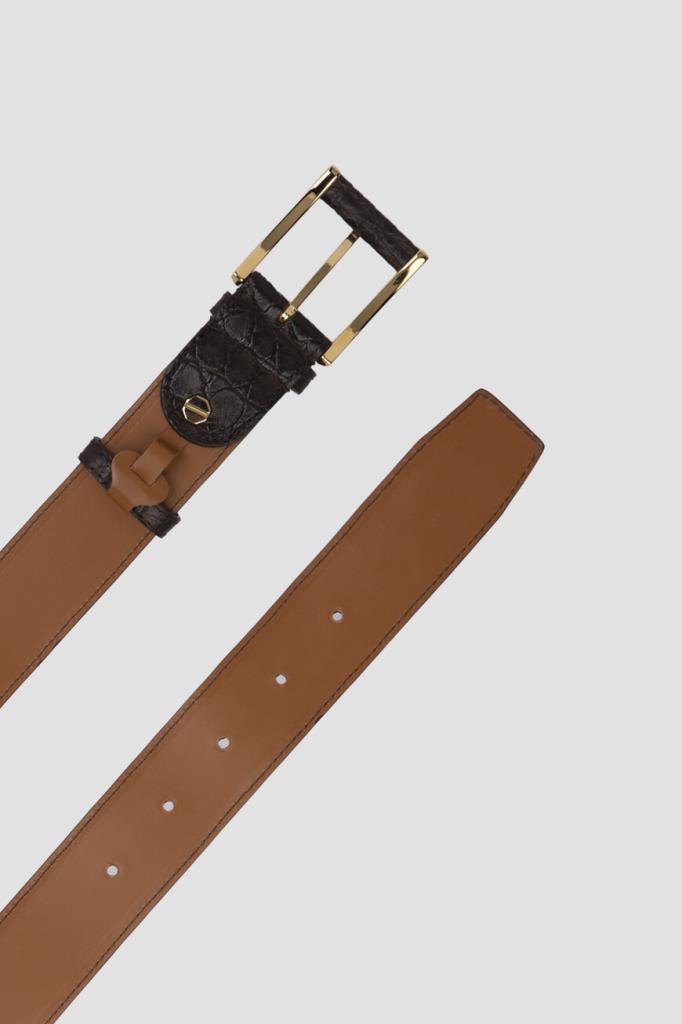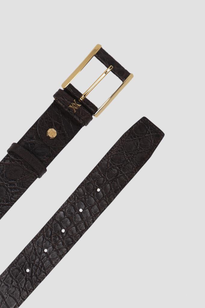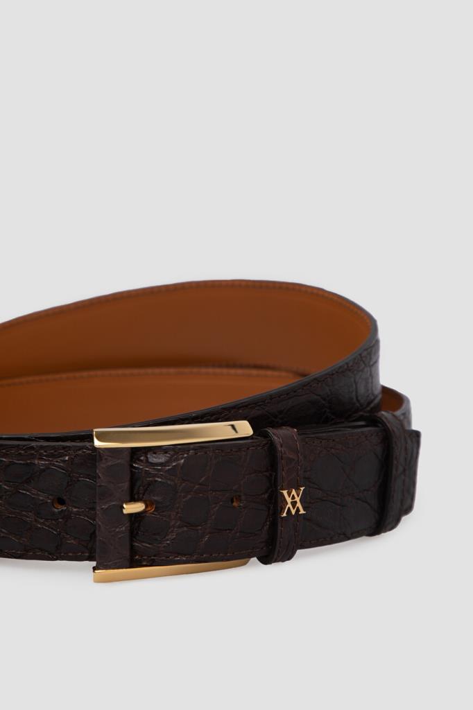 Тёмно-коричневый ремень Artioli с классической прямоугольной пряжкой. Модель изготовлена из мягкой фактурной кожи крокодила и дополнена культовыми металлическими лого-монограммами Дома золотого оттенка на месте крепления пряжки и тренчике. Аксессуар идеально подойдёт как для классических брюк, так и для джинсов.