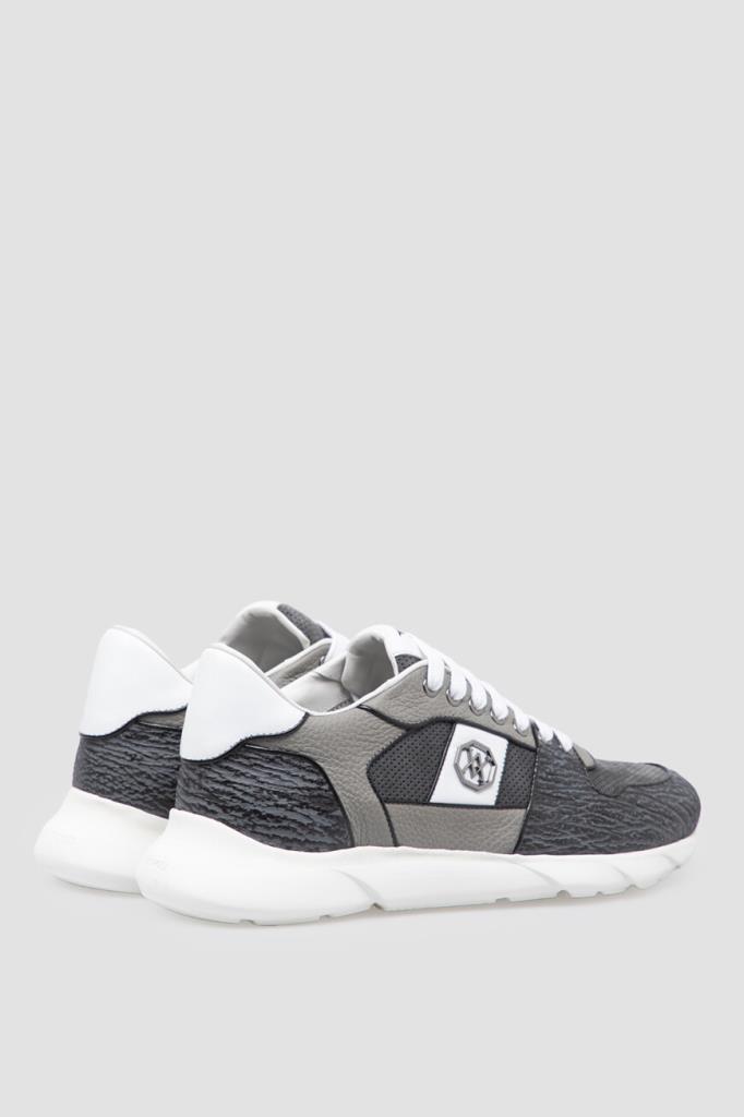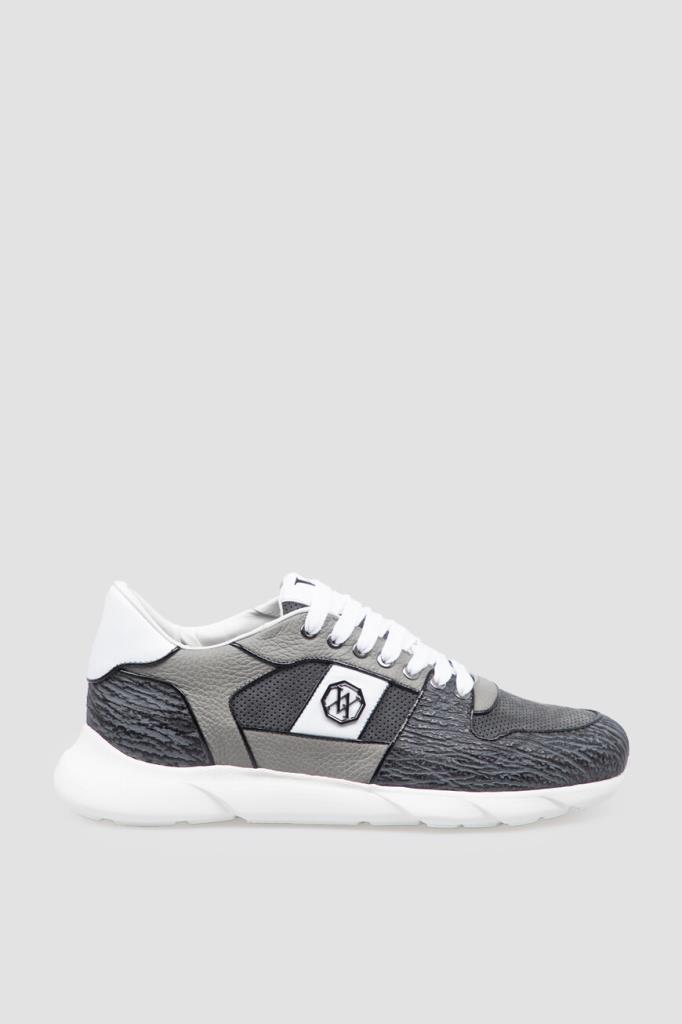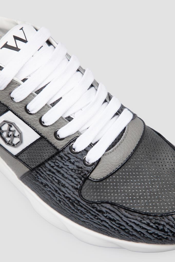 Кожаные сникеры ARTIOLI с разными текстурами и крупной символикой Дома. Изделие сочетает вставки с перфорацией на носке и боковинах, детали серого цвета с зернистой текстурой, гладкие вставки белого цвета на язычке и по бокам и детали из кожи акулы с характерным фактурным узором спереди и сзади. В роли знакового декора выступают серебристые металлические восьмигранники с лого-монограммой в центре, брендирование спереди и тиснёный логотип сзади на подошве.