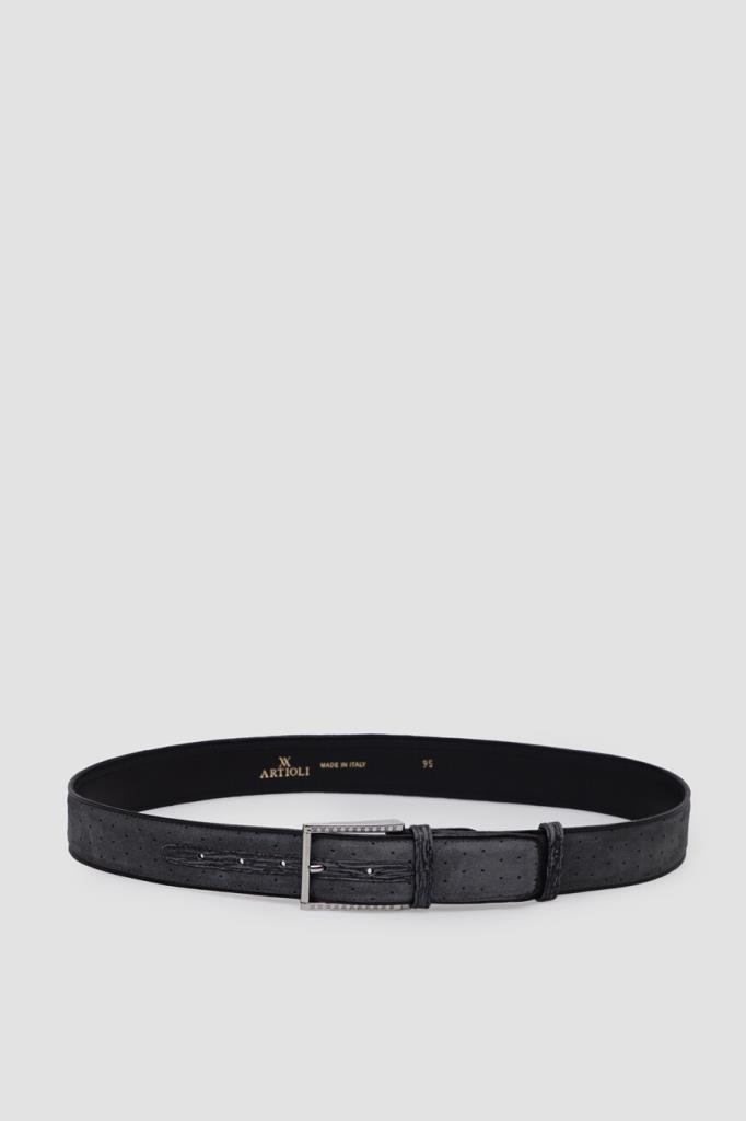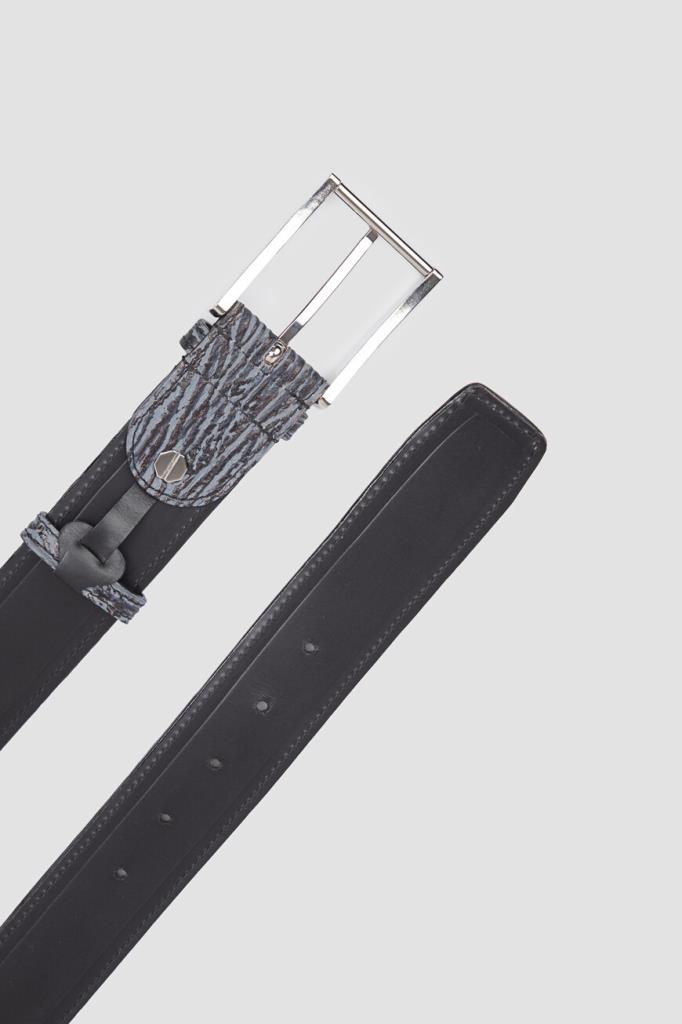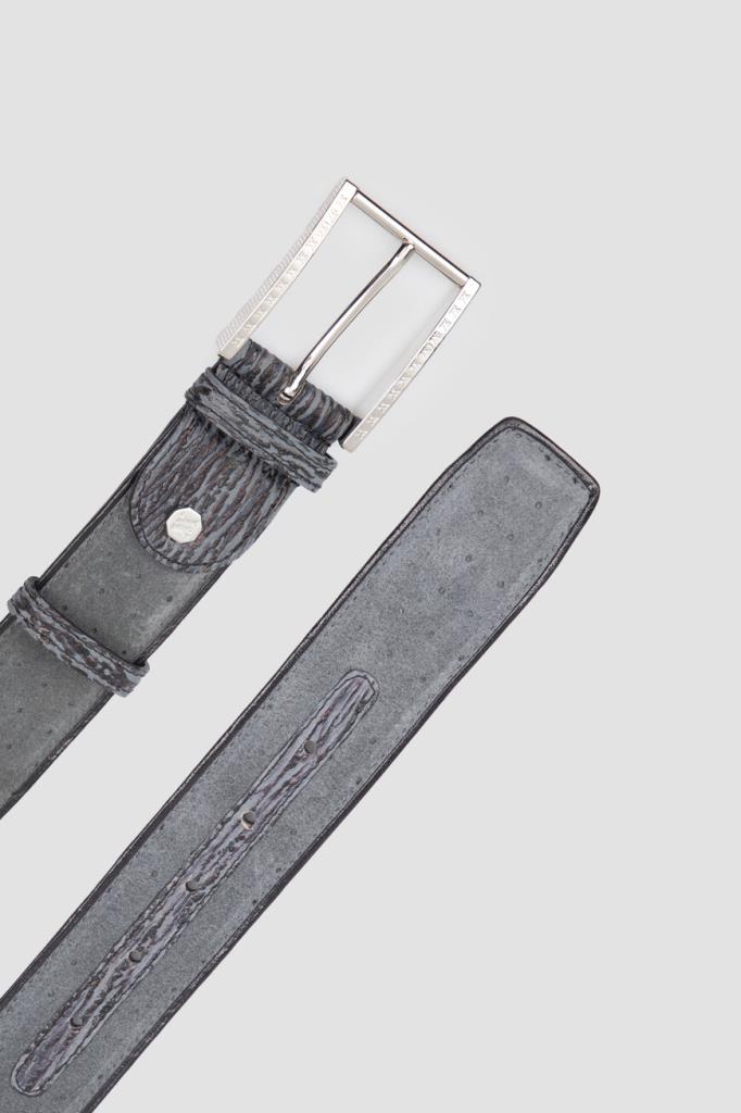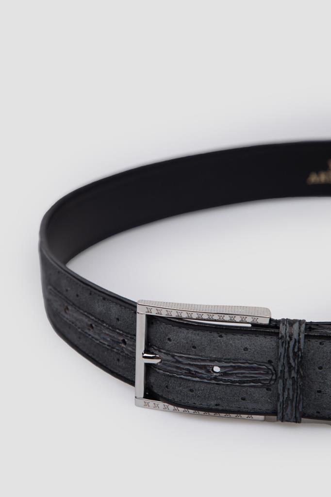 Комбинированный ремень Artioli с брендированной прямоугольной пряжкой. Для производства аксессуара используется мелковорсистый нубук серого цвета с перфорацией и деталями из кожи лося с характерным фактурным узором. Декором выступает заклёпка-восьмигранник с выгравированной монограммой Дома на одном из кончиков.