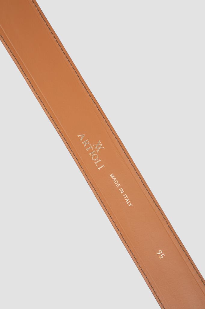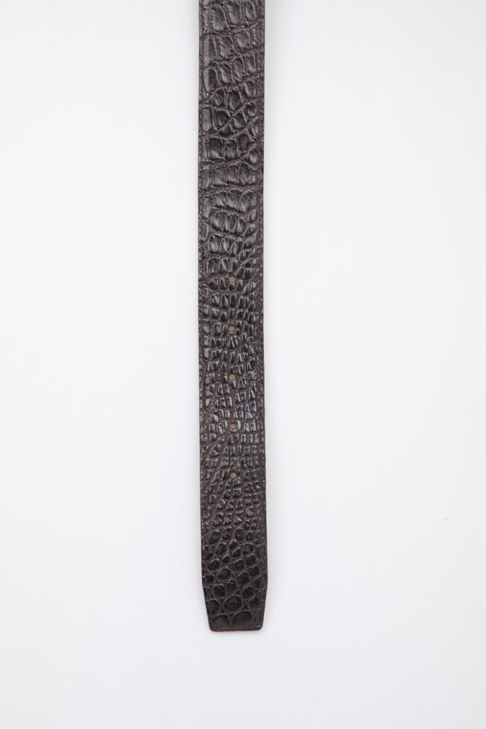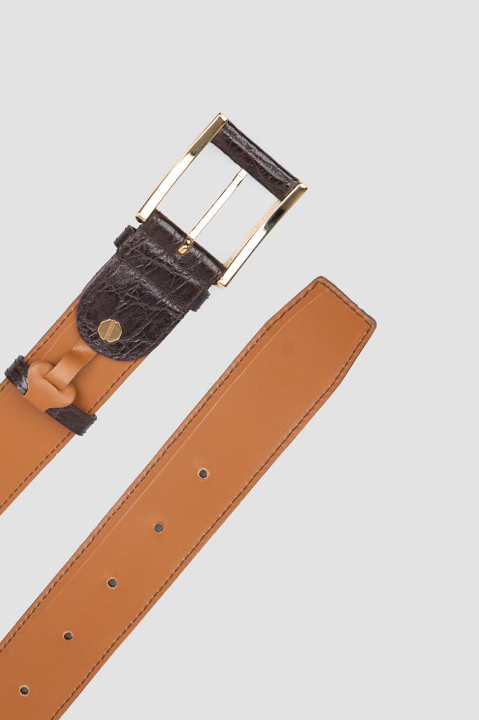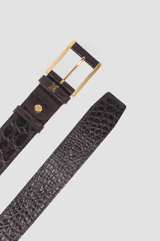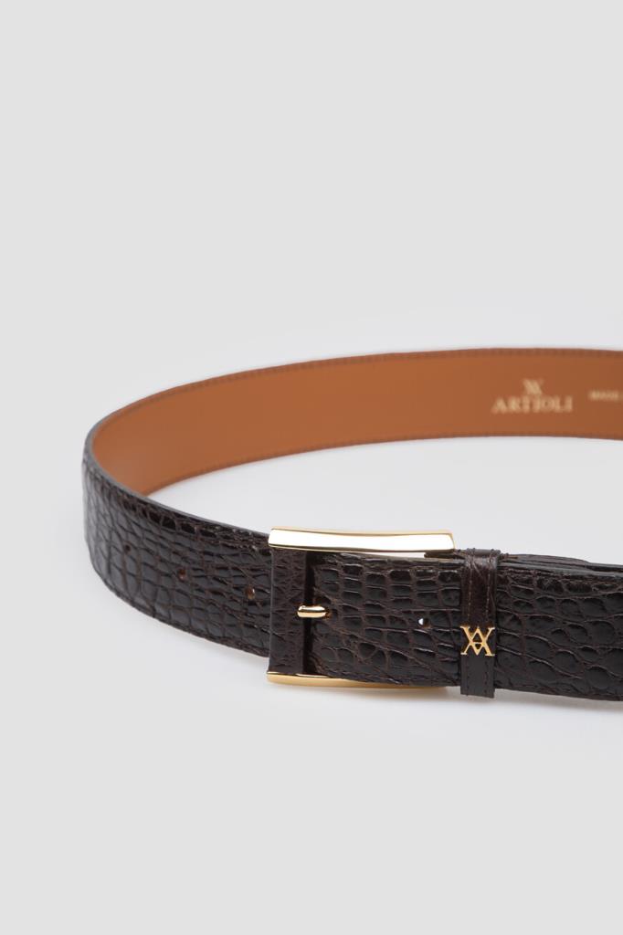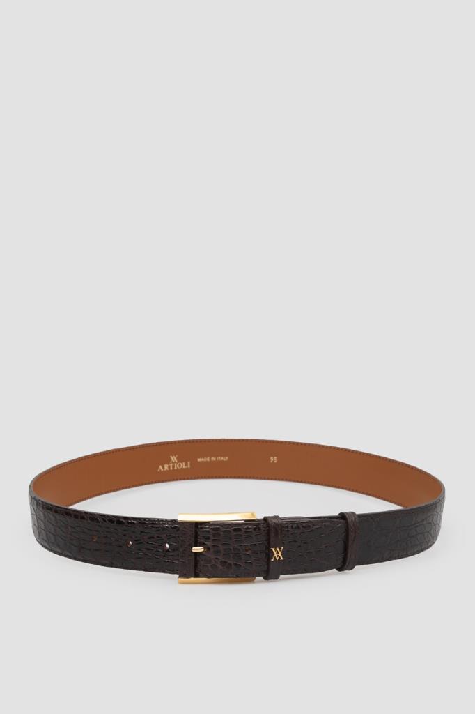 Ремень Artioli из фактурной кожи крокодила сделает любой образ более статусным. Аксессуар с естественным чешуйчатым рисунком окрашен в благородный тёмно-коричневый оттенок и дополнен двумя подвижными тренчиками. Чтобы не перегружать дизайн, прямоугольную пряжку сделали максимально лаконичной, а принадлежность бренду подчеркнули лого-монограммами из золотистого металла.
