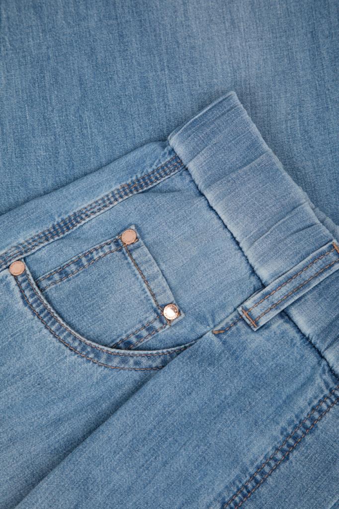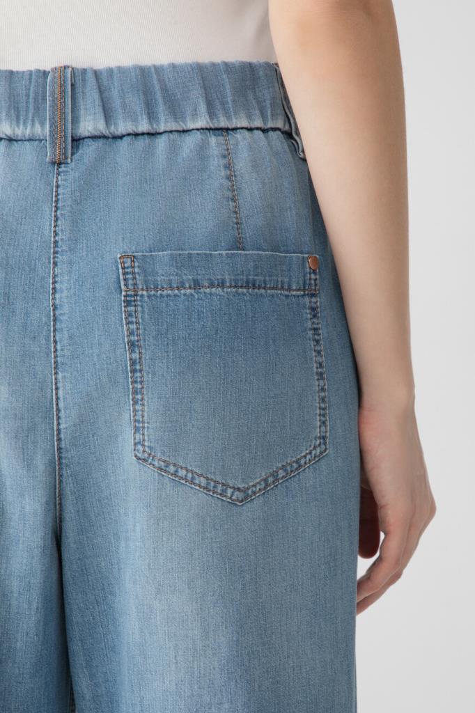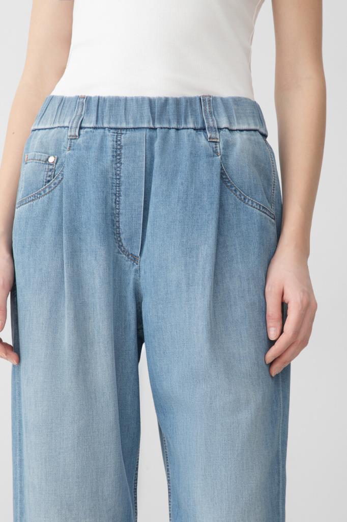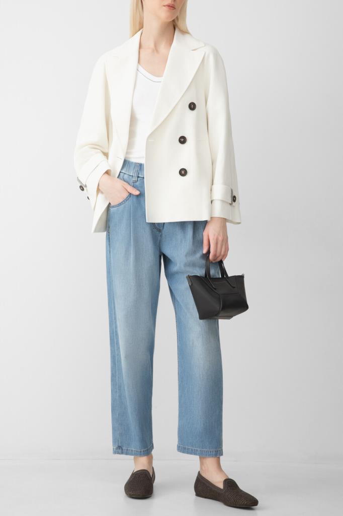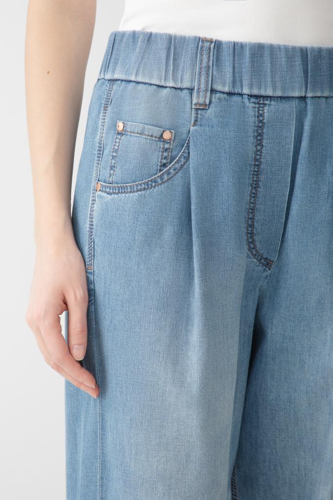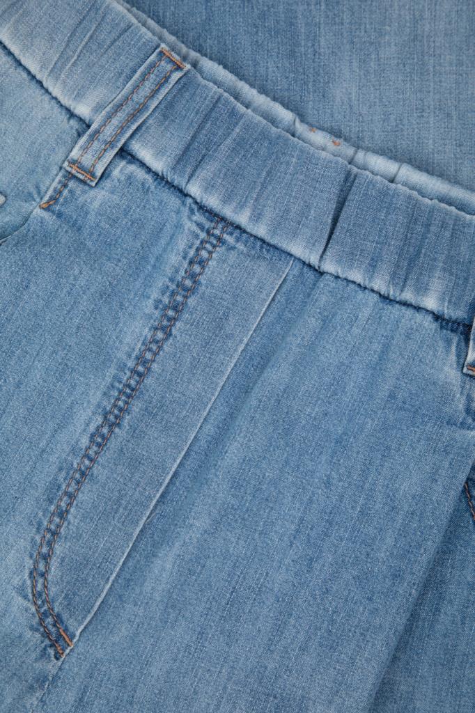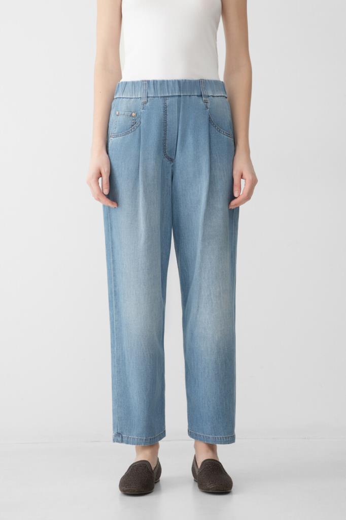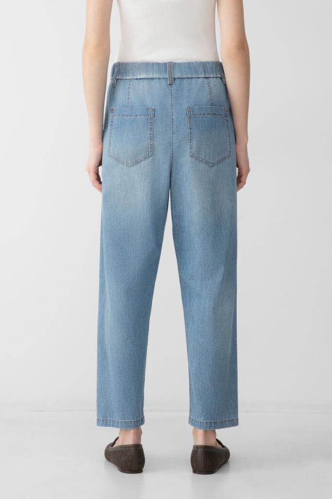 Светло-синие брюки BRUNELLO CUCINELLI с защипами сверху. Модель изготовлена из лёгкого хлопкового денима с эффектом делаве и пятью карманами. Цвет изделия может меняться в результате повседневной носки и стирки. Стоит рассматривать эту характеристику как ценное свойство, благодаря которому каждая вещь является уникальной. Брюки объединяют стиль кэжуал и утончённые детали, такие как полосу из рядов золотистой цепочки Мониль на шлевке сзади. Модель характеризуется мягким силуэтом в верхней части, который затем сужается книзу, и наличием широкого эластичного пояса-резинки для комфортной посадки.