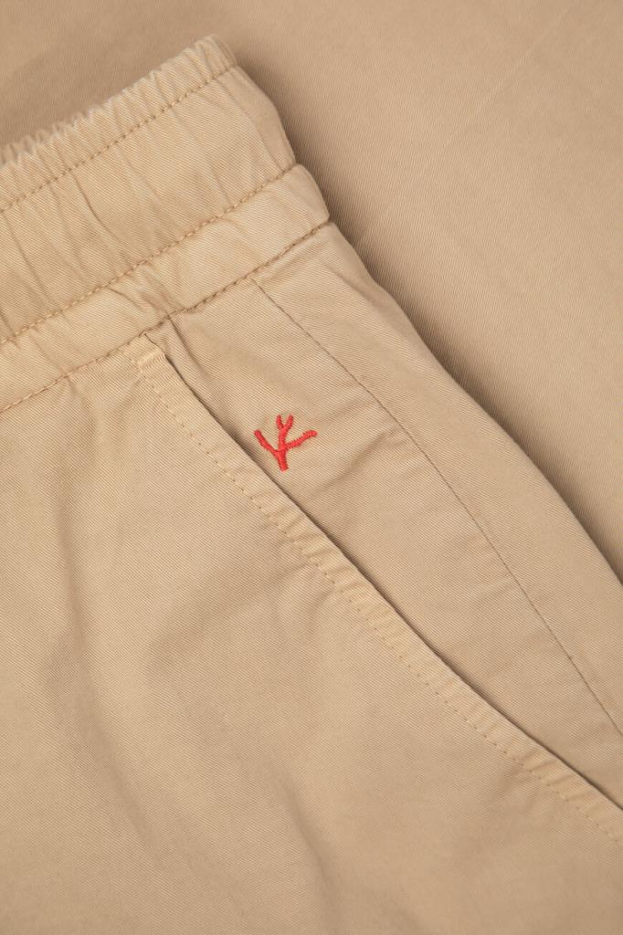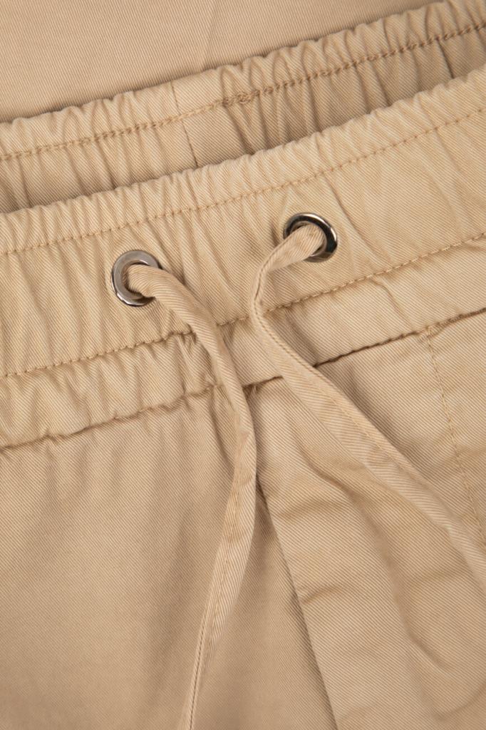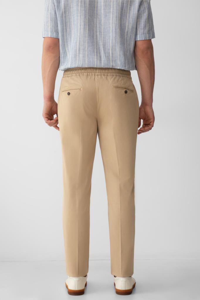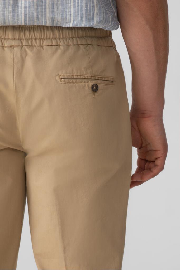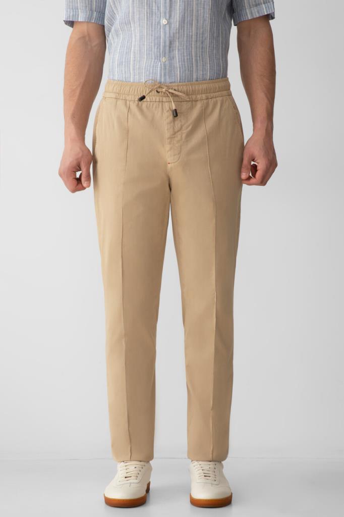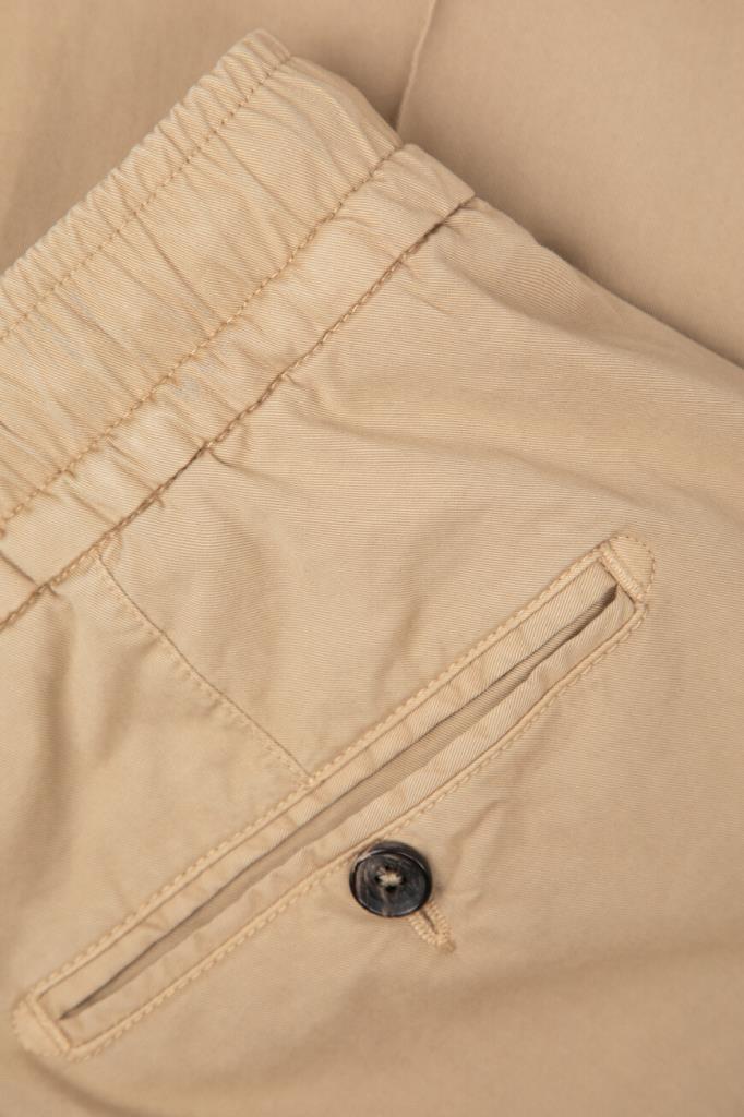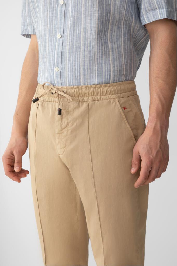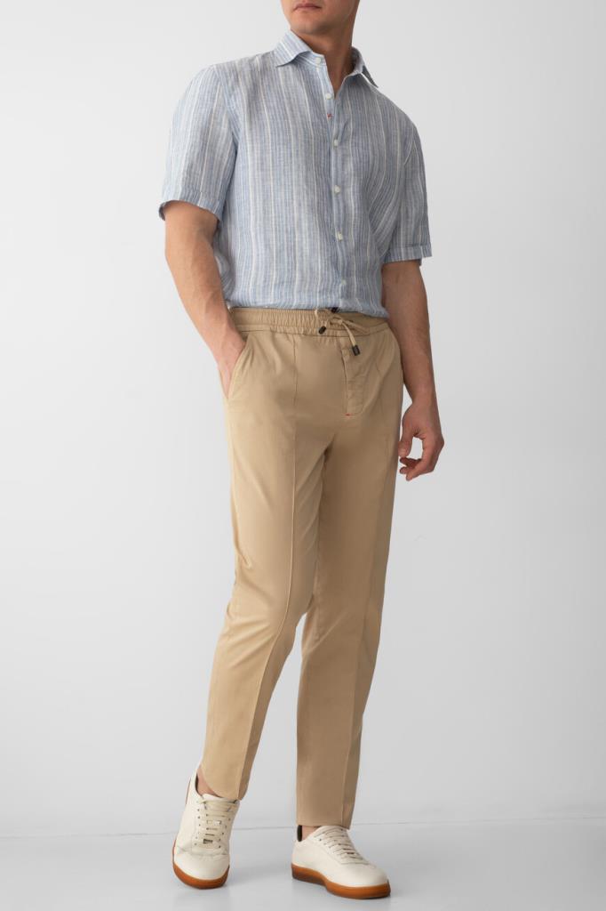 Стрейчевые брюки прямого силуэта от Isaia. Для создания изделия с элементами классического и спортивного стилей выбран мягкий хлопковый трикотаж. Фасон модели характеризуется наличием широкого эластичного пояса-кулиски для оптимальной посадки и четырёх прорезных карманов: двух с диагональным входом по бокам и двух на роговой пуговице сзади.