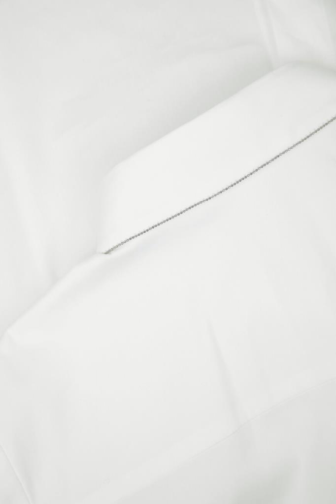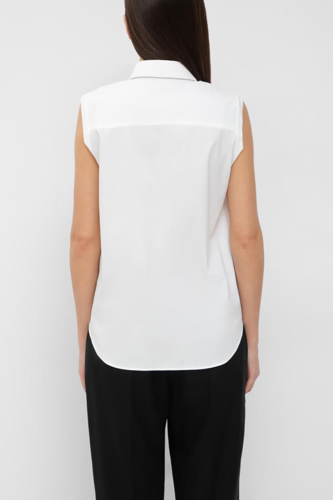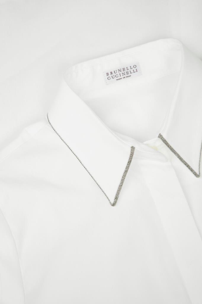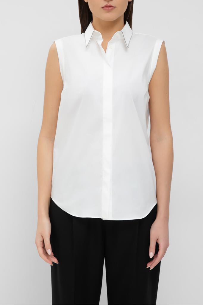 Трикотажная рубашка Brunello Cucinelli выполнена в стиле жилета без рукавов. Для пошива базовой модели используется мягкий эластичный поплин на основе хлопка и прочного нейлона белого цвета — всесезонная ткань с лёгкой и приятной в носке текстурой. Легендарный декор коллекций Дома - вышивка из рядов серебристой цепочки Мониль выделяется вдоль нижнего края отложного воротника. Изделие прямого силуэта органично дополнит и брючный костюм, и романтичную юбку.