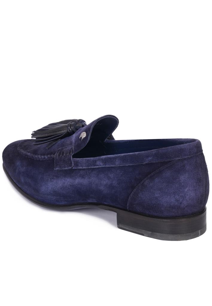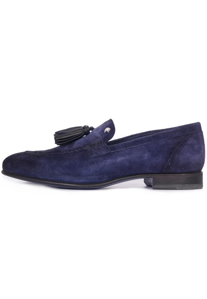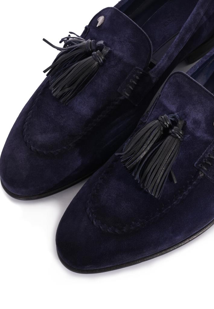Темно-синие лоферы от Stefano Ricci — воплощение изысканности и утонченного дизайна. Выполнены из мягкой замши премиального качества с бархатистой текстурой. На передней части расположены кожаные кисточки, которые добавляют классический акцент, а также символизируют традиционное мастерство бренда. Ручная строчка вдоль мыса подчеркивает внимание к деталям. Внутренняя отделка и подошва выполнены из натуральной кожи. На боковой части верхней линии расположена металлическая деталь с фирменным логотипом, покрытая палладием. Элегантная форма и продуманные линии делают эту пару идеальной для сочетания с классическим костюмом из коллекции Stefano Ricci.