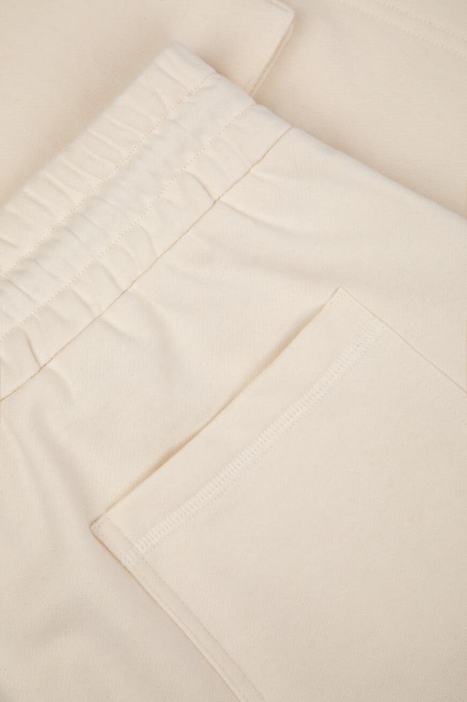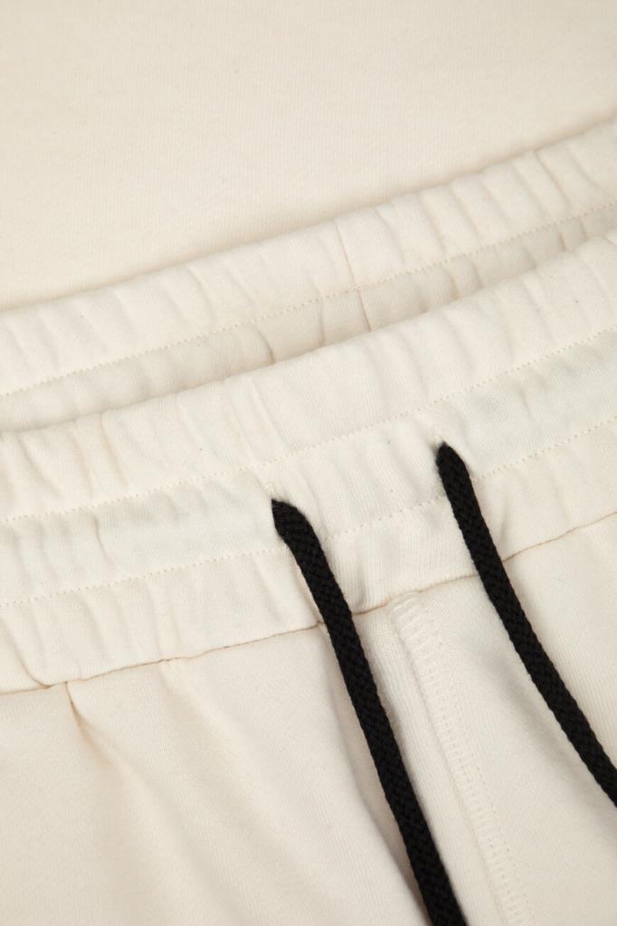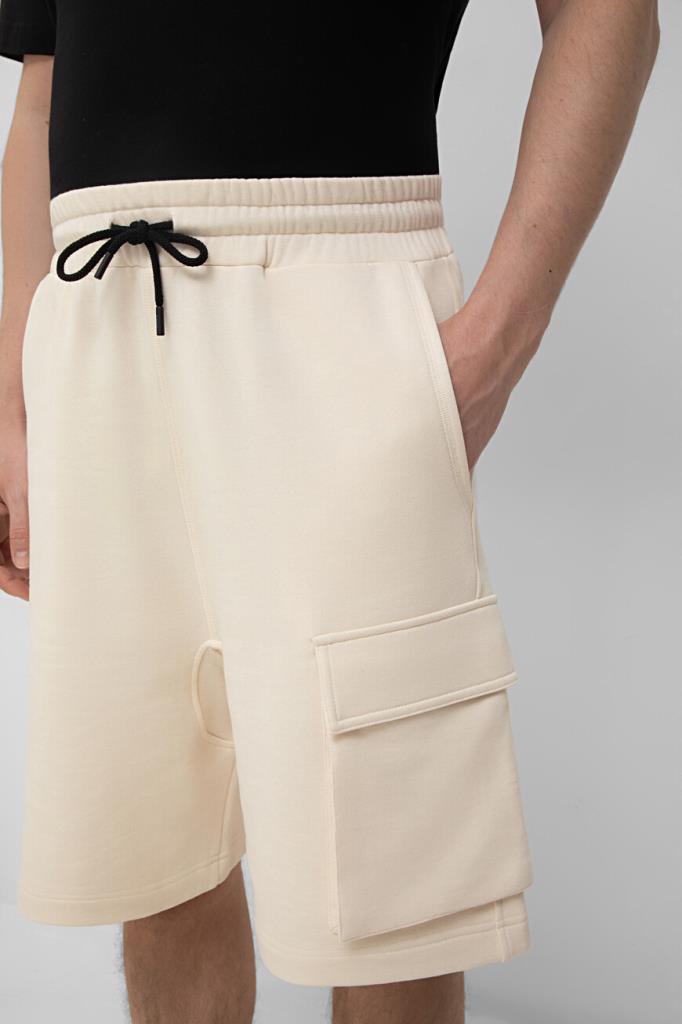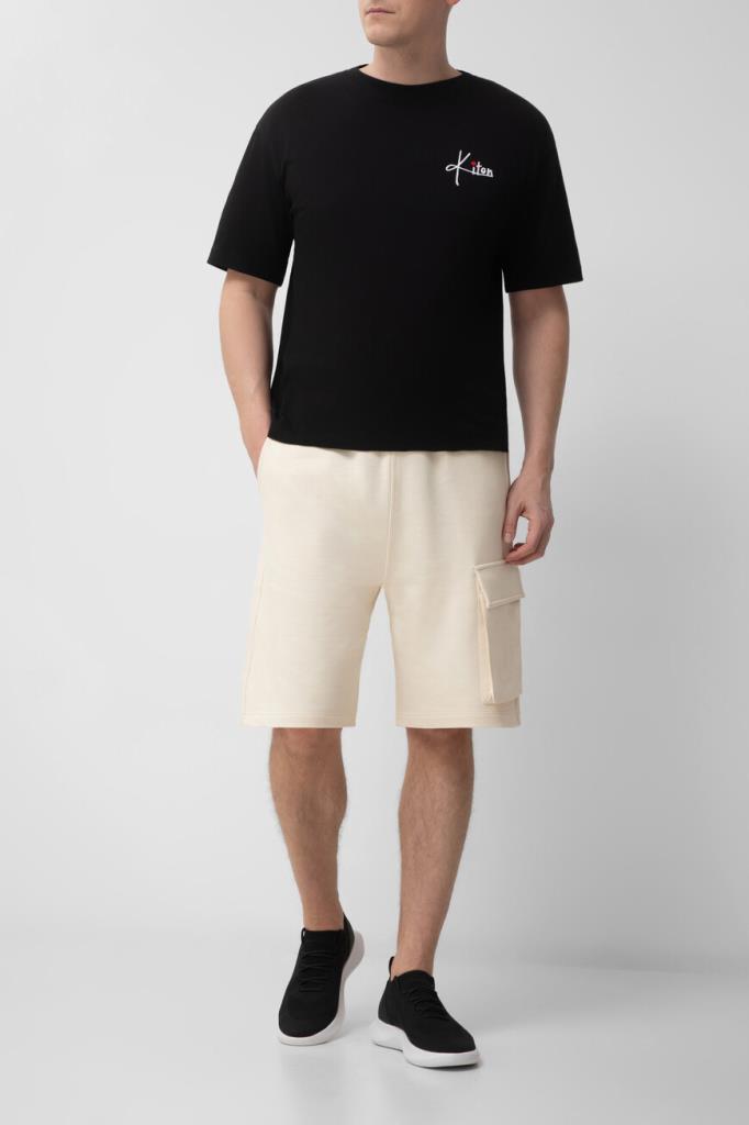 Кремовые бермуды Kiton с широким эластичным поясом на чёрной кулиске. Фасон изделия, выполненного в спортивном стиле на основе хлопка и гладкого шёлка, характеризуется заниженной линией шагового шва и наличием четырёх карманов: двух прорезных по бокам, крупного накладного кармана с клапаном сбоку и накладного кармана сзади справа. Модель комфортно садится по фигуре и сочетается с другими предметами сезонного мужского гардероба.