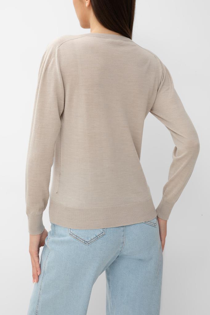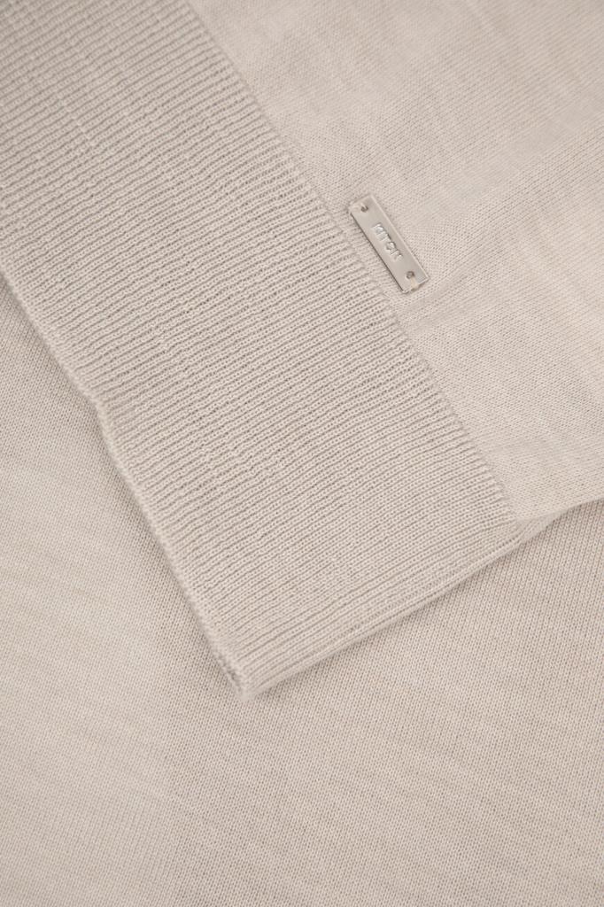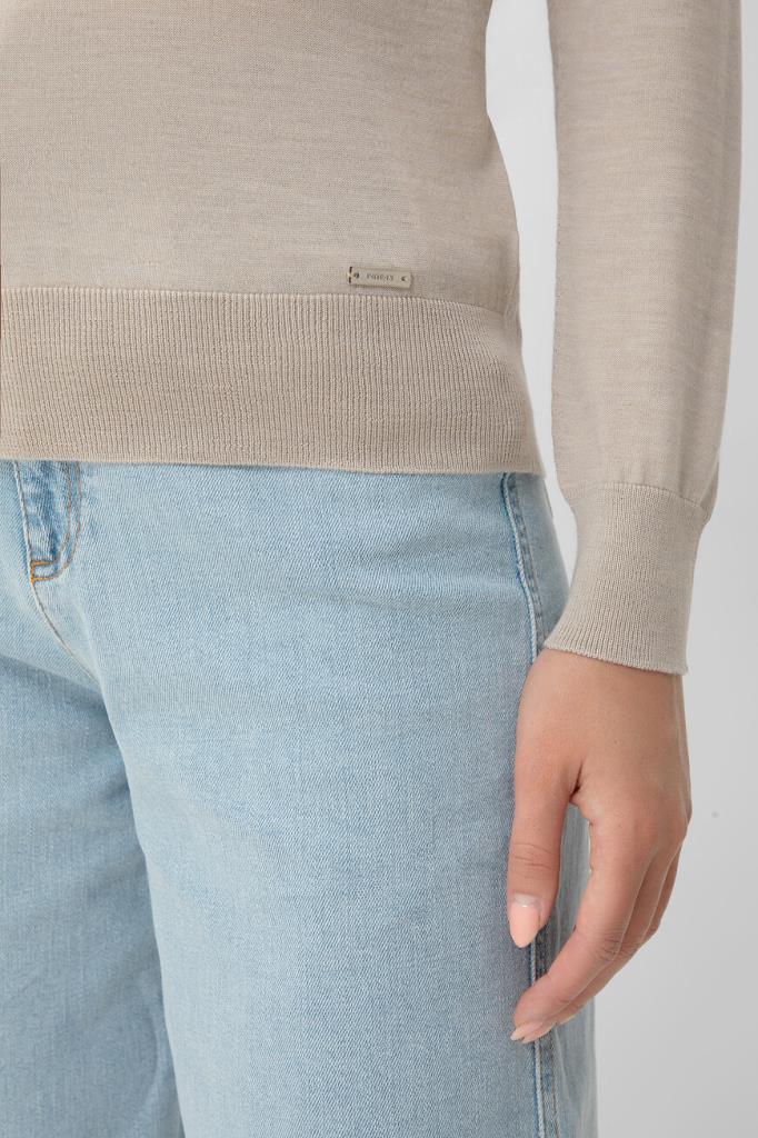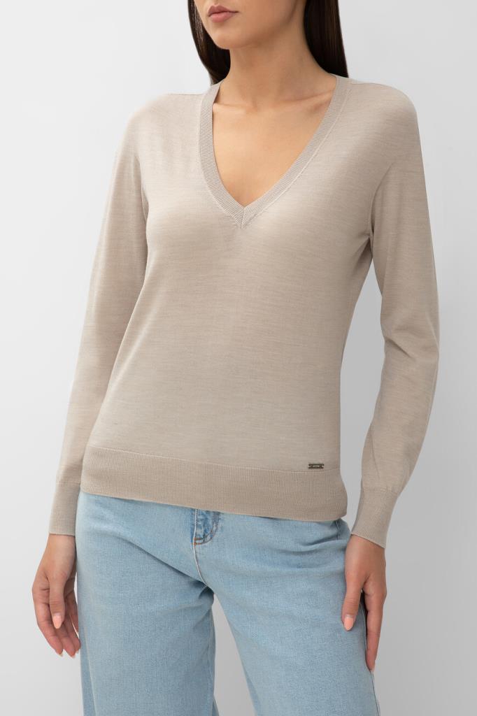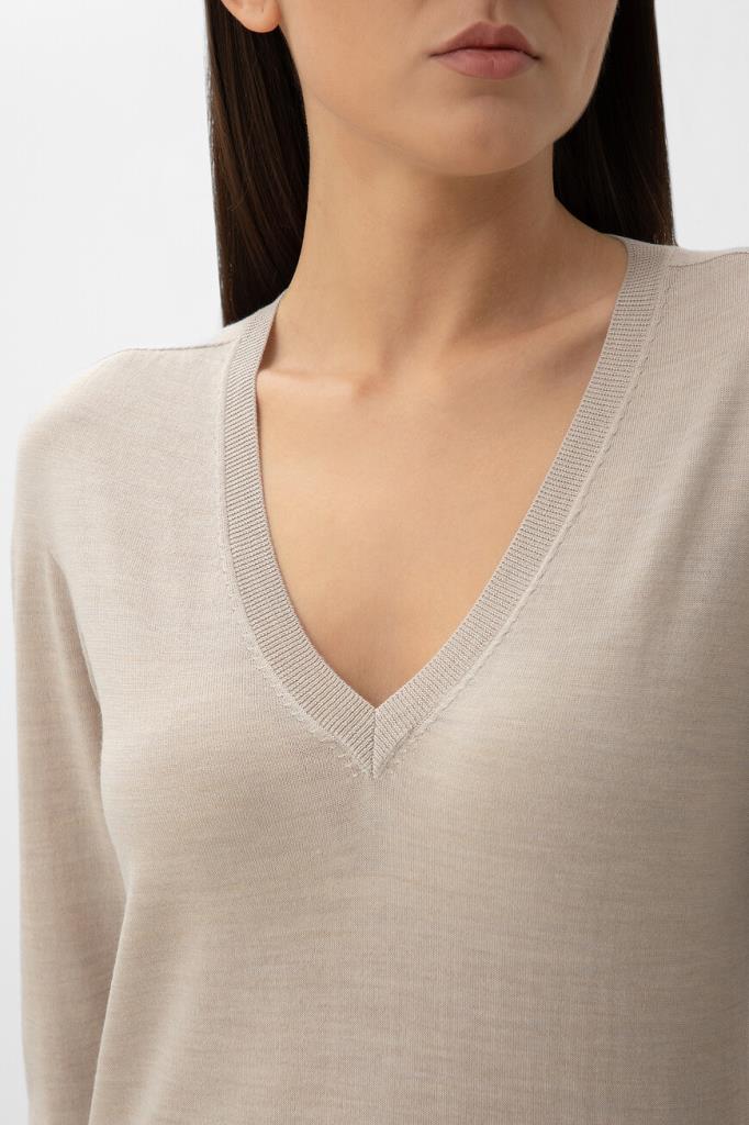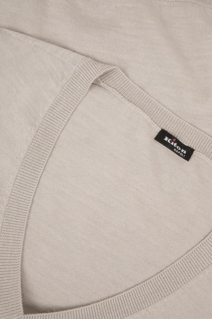 Светло-бежевый пуловер Kiton с глубоким V-образным вырезом. Для создания повседневной модели прямого силуэта используется мягкая натуральная шерсть. Изделие хорошо сохраняет тепло и не ограничивает движения. Декором выступает серебристый металлический лейбл с гравировкой. Горловина, манжеты и пояс подобраны на резинку.